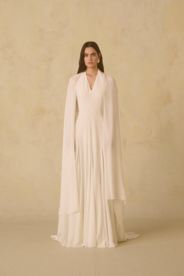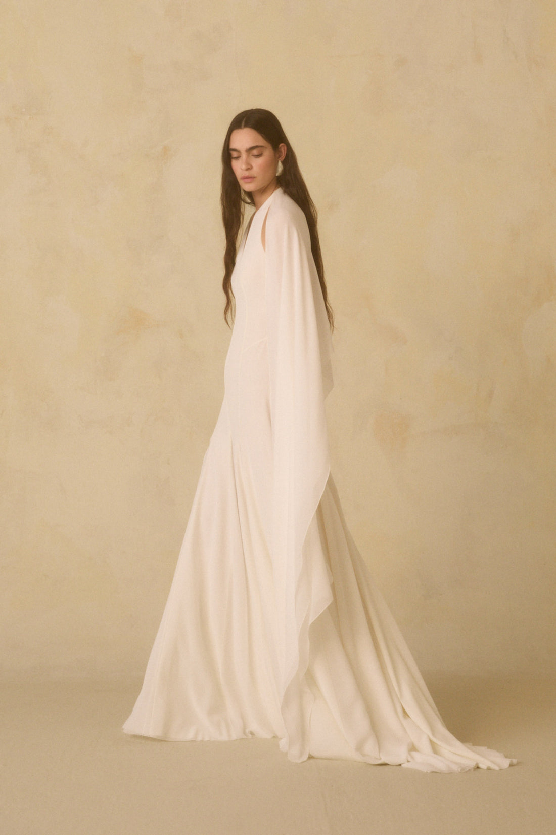 Halter neck wedding dress made of stretch silk. The Agata dress has two layers of fabric, with silk georgette godets that give the a full skirt. The neckline features two silk georgette stoles that allow the dress to be worn in a variety of ways.