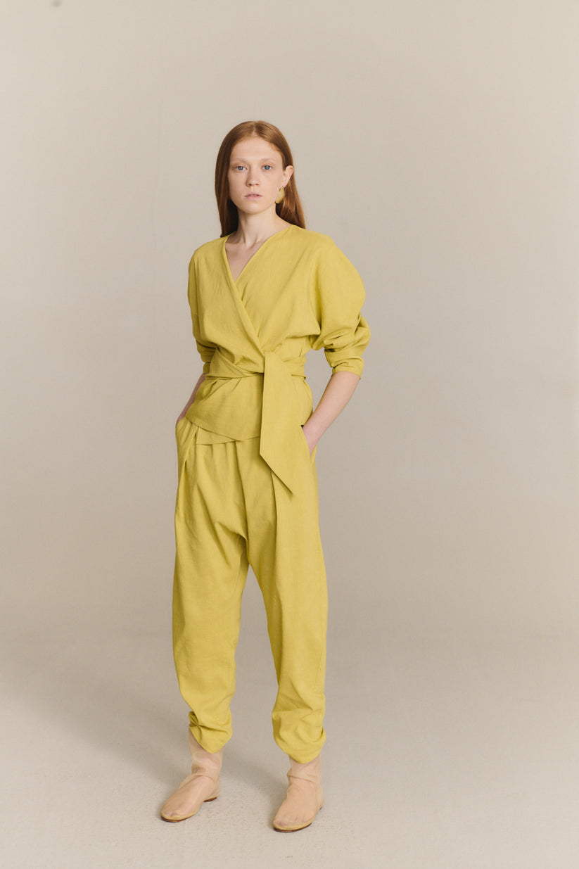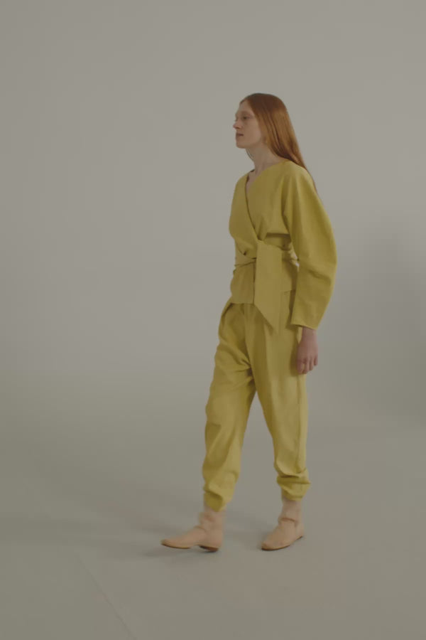 Ama trousers made from a stretch fabric that combines hemp and viscose. This design has small pleats at the front and an elastic waistband and side pockets for a relaxed fit.
