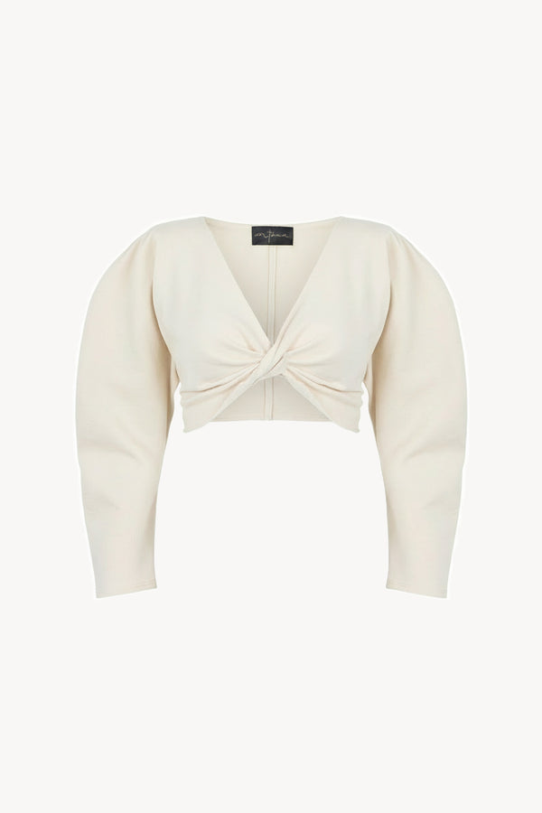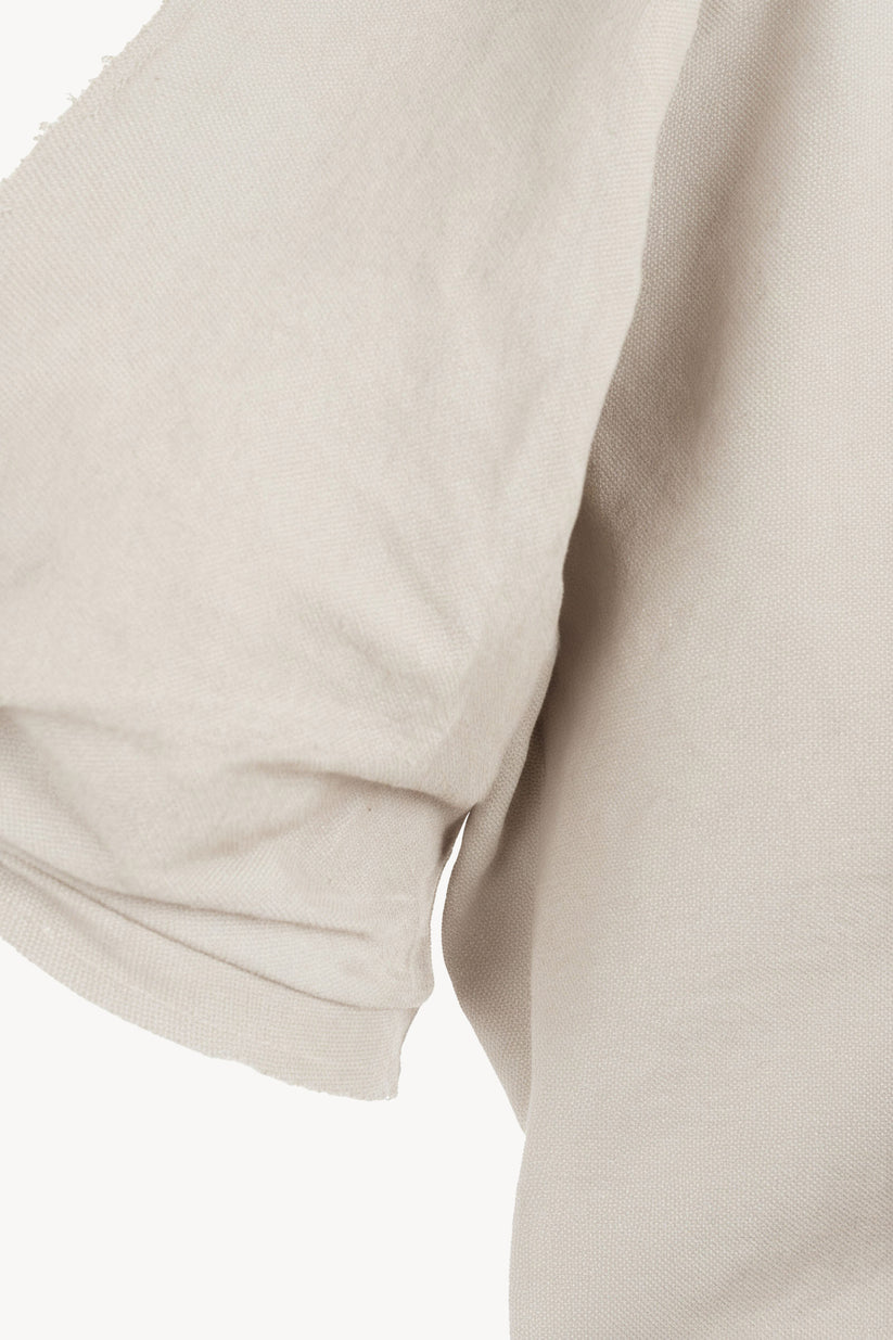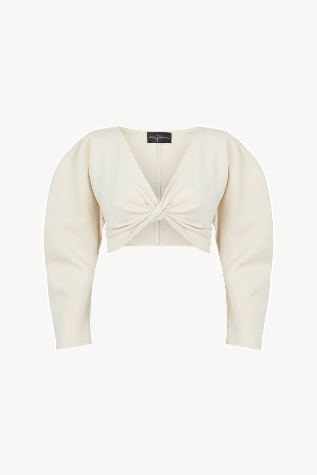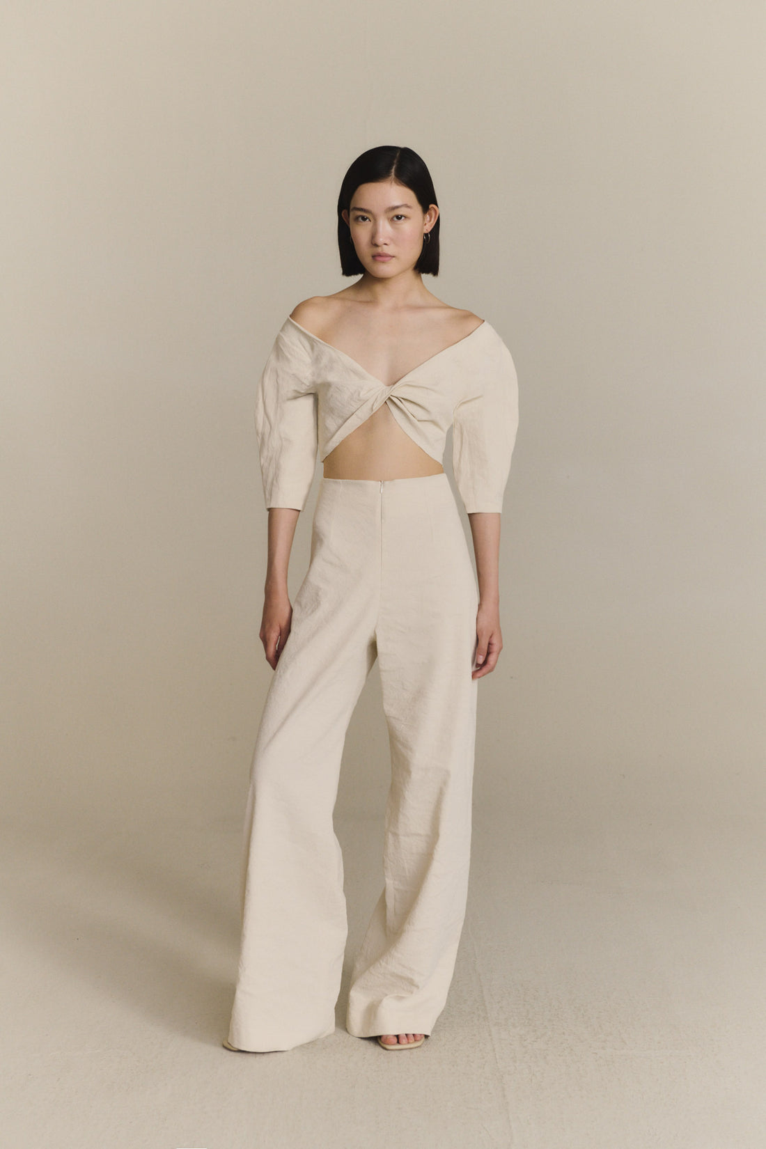 Crop top made in a stretch canvas-type fabric that combines linen and viscose. The Ara top stands out for its twisted design creating a draped effect and closes with an invisible side zipper.