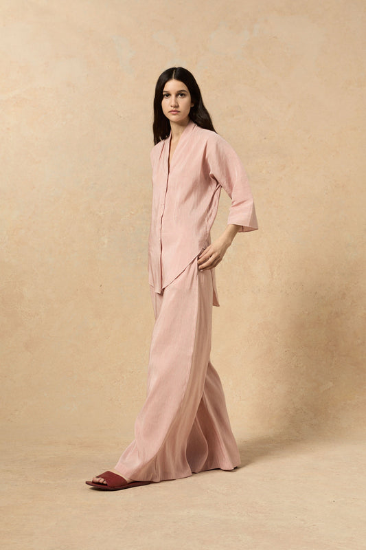 High-waisted wrap pants that cross over and tie at the waist with a bow. The Arco pants are made from a fabric that combines linen and cupro and features a slight curve in the leg.