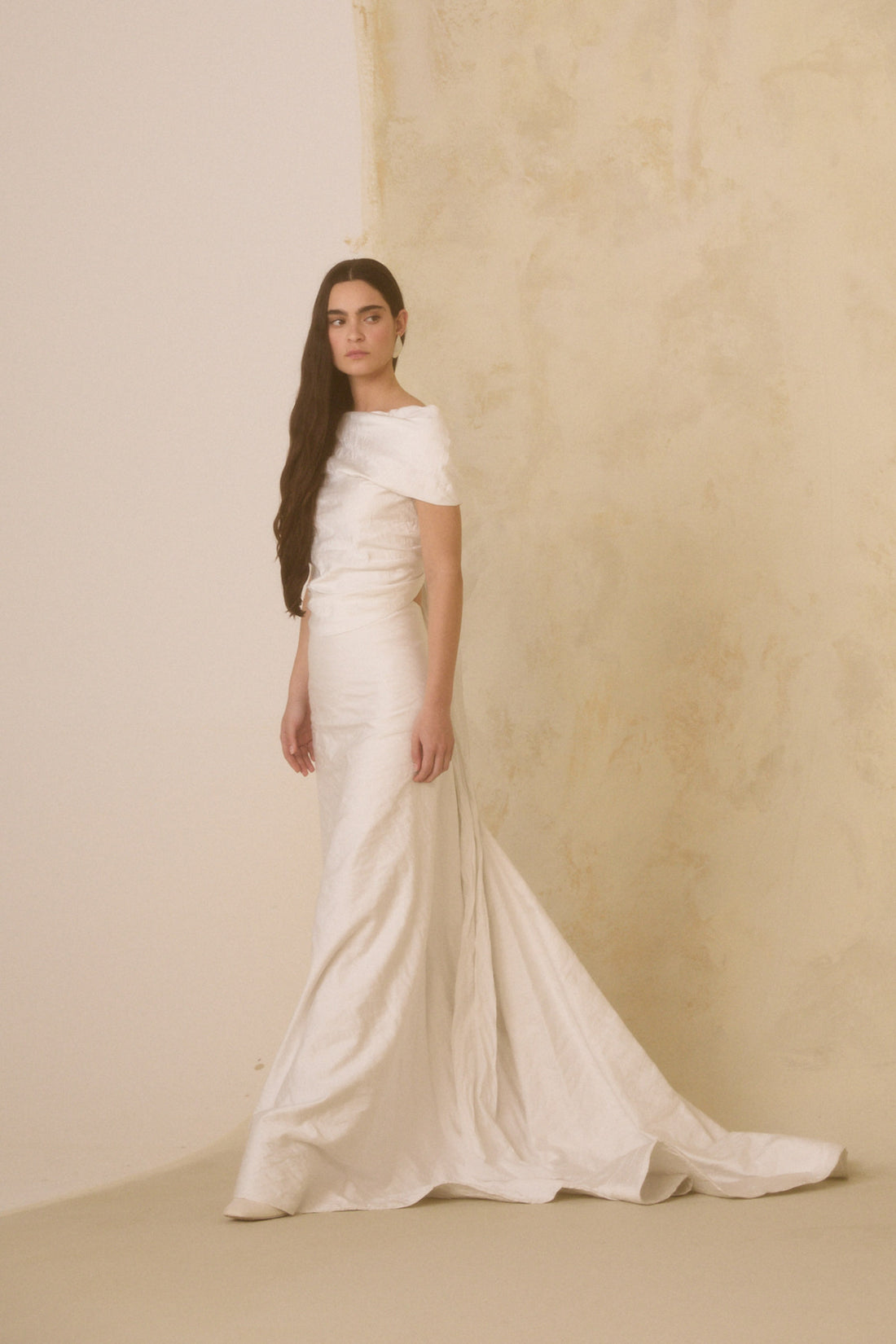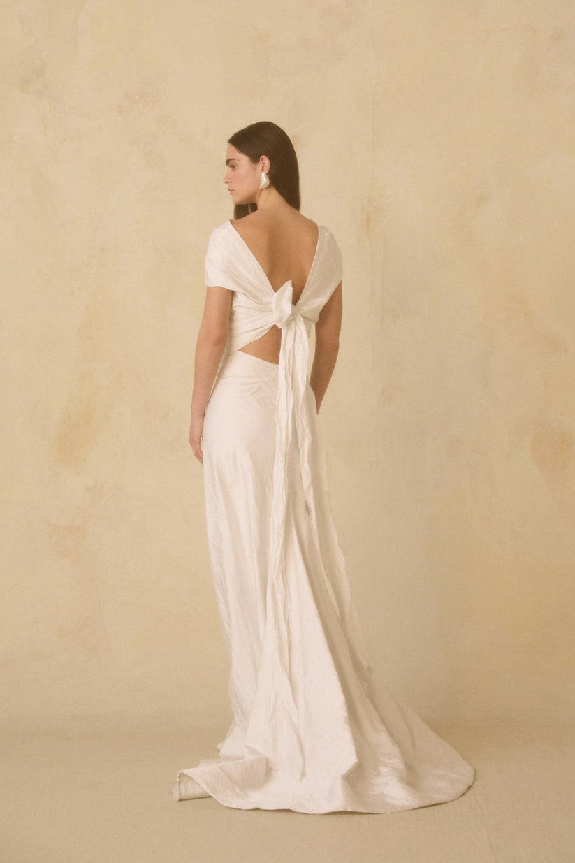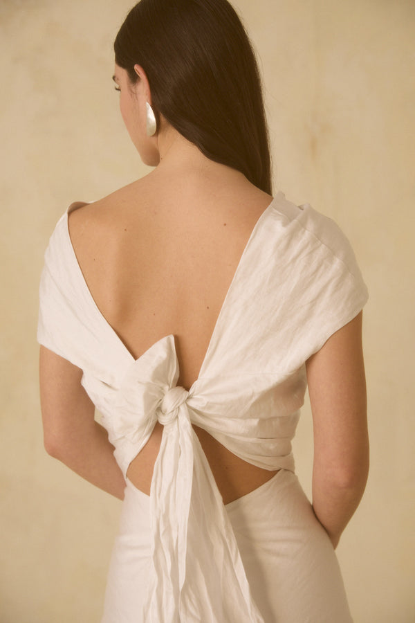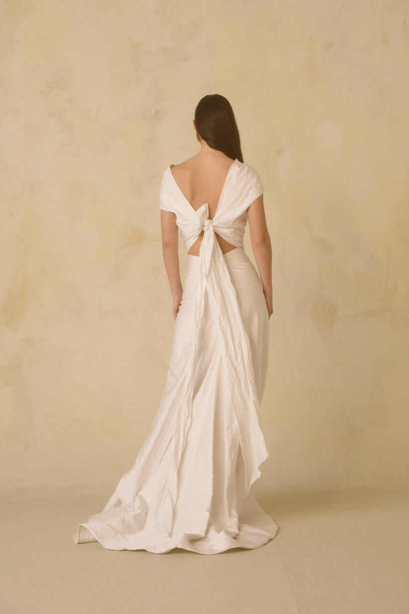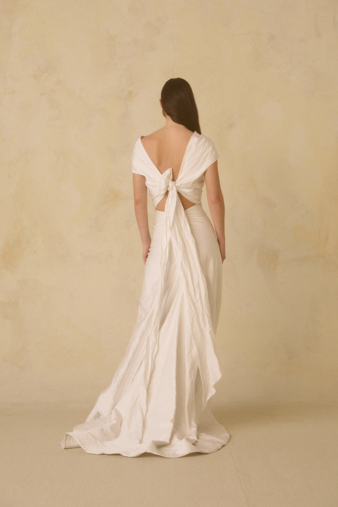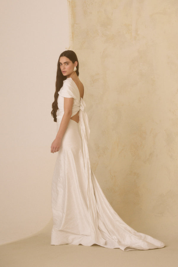 A top with a bateau neckline and a large bow that ties in the back. Worn with the long Arianne skirt, which features a godet skirt that creates a small train. Both garments are made from a fabric that combines cotton, viscose, and metallic thread, creating a unique crinkled effect.