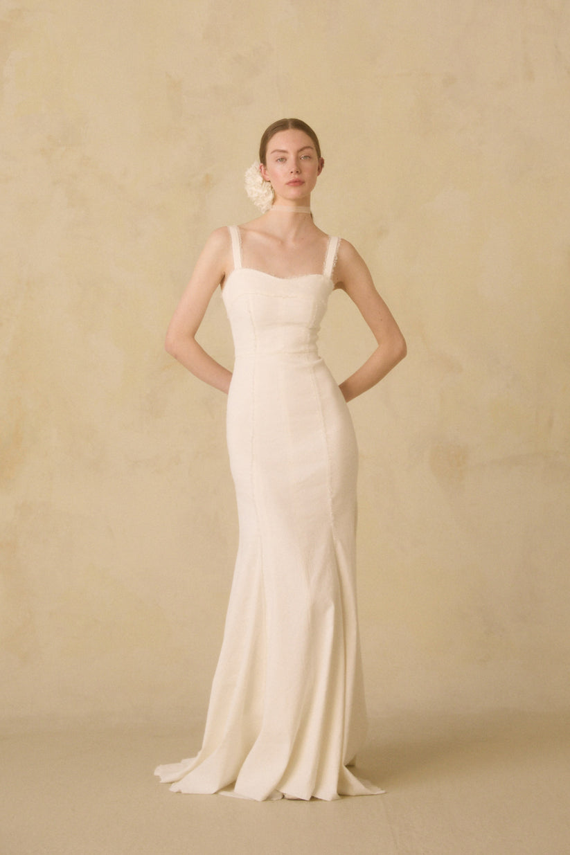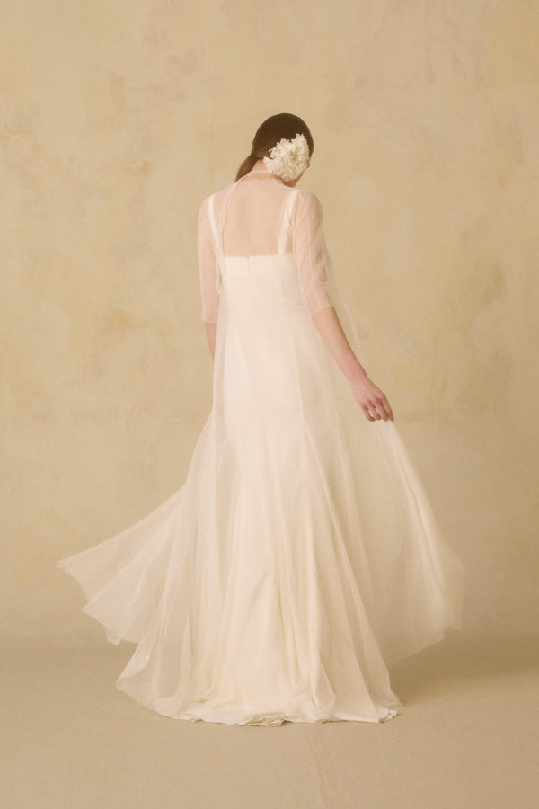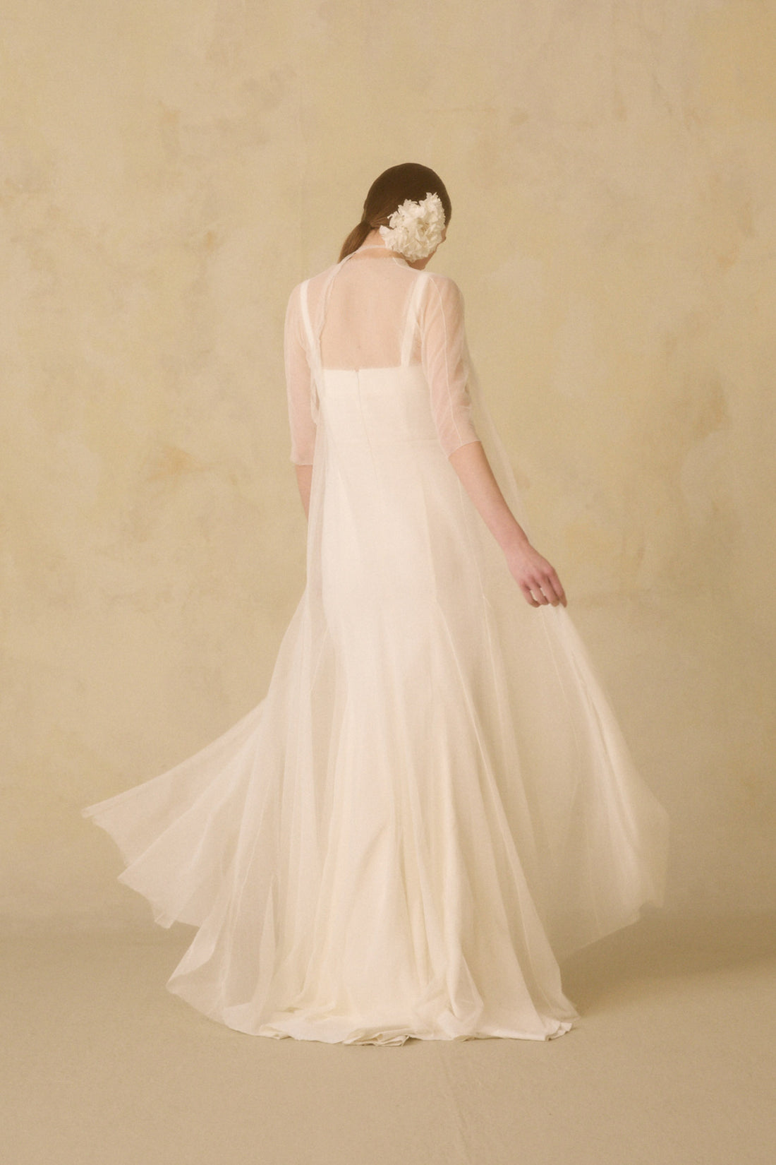 Long fitted dress in a stretch fabric combining linen and viscose. The Audrey dress features cotton tulle details on the seams, straps, and neckline. It closes in the back with an invisible zipper and is lined with stretch silk satin. The long Deco jacket is made of stretch cotton tulle with godets for added volume. It features a scallop detail on both sleeves for added comfort.