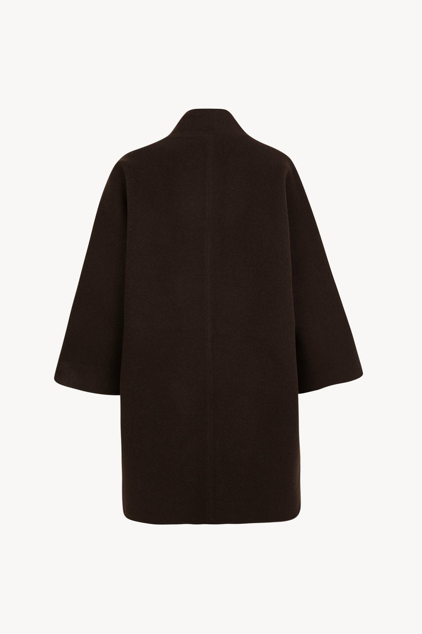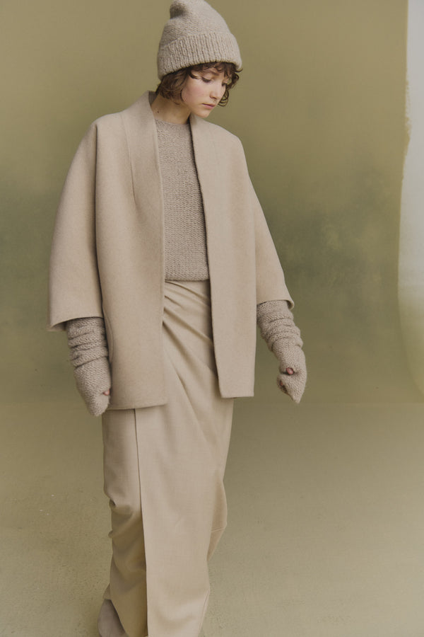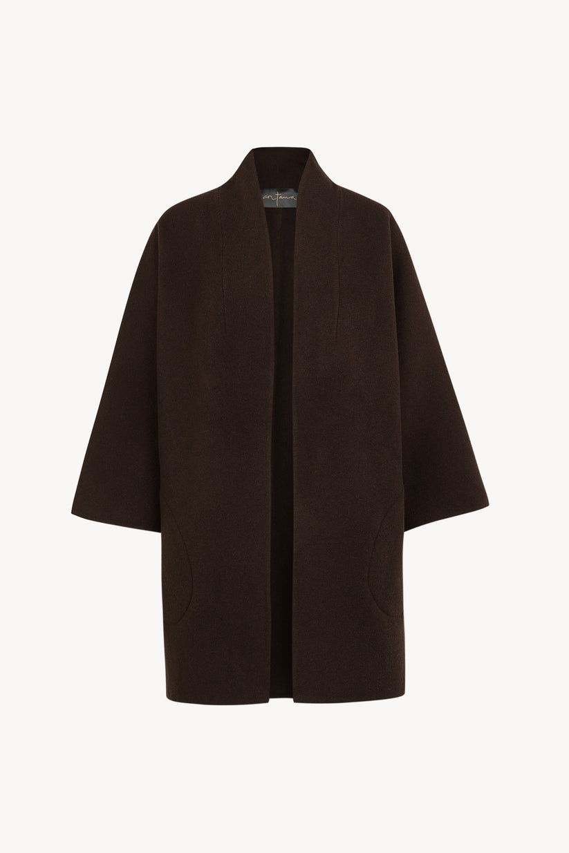 Short double-faced coat crafted from an Italian blend of wool and cashmere, offering warmth and a rich hand. It features dolman sleeves and side pockets, and its open, button-free construction allows for effortless layering.