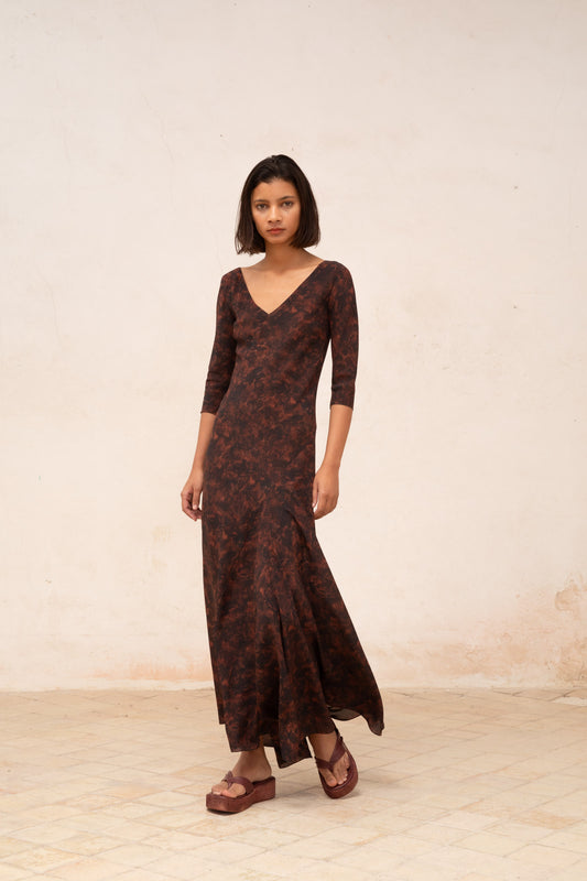 Dress with an asymmetrical neckline and sleeve, and with a seam on the back that creates small gathers.