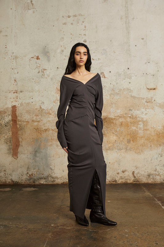 Black high-waisted long skirt with a slit and invisible zipper at the back. Made from a stretch fabric that combines virgin wool, organic cotton and hemp.