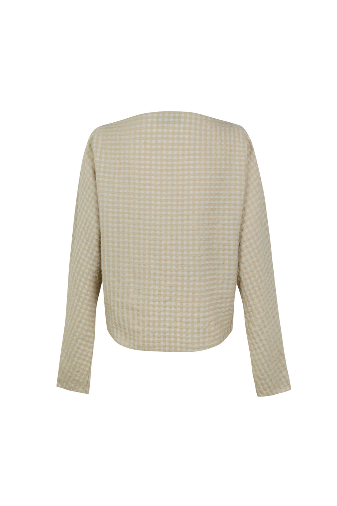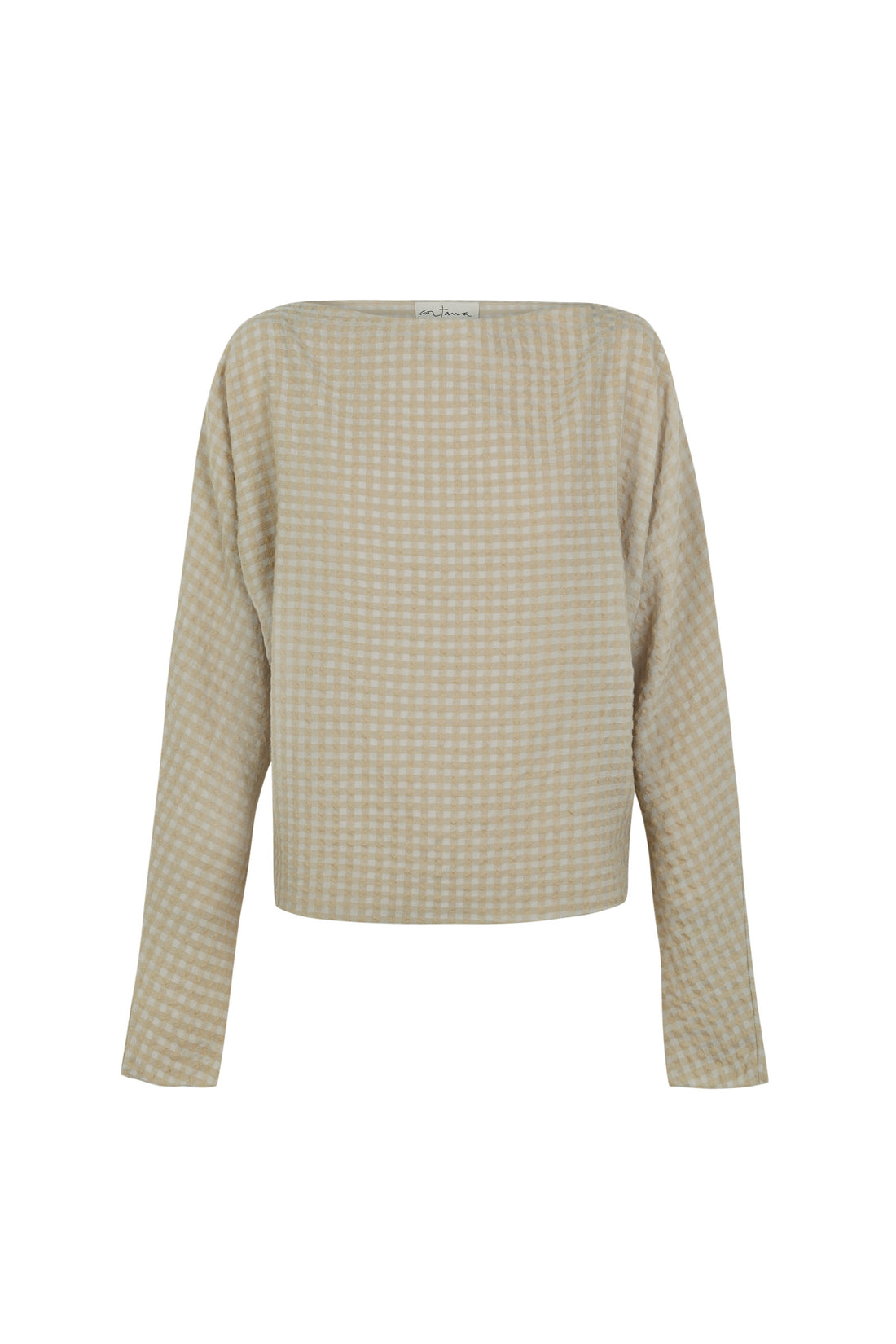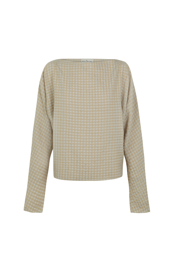 Long-sleeved top with dolman sleeves made from a fabric that combines wool and viscose with a checkered jacquard motif.