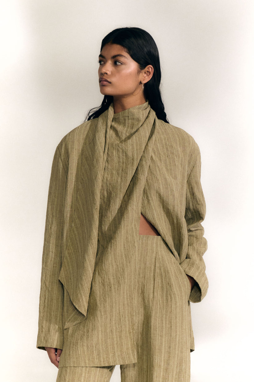 Camila, greyish green striped linen wrap jacket