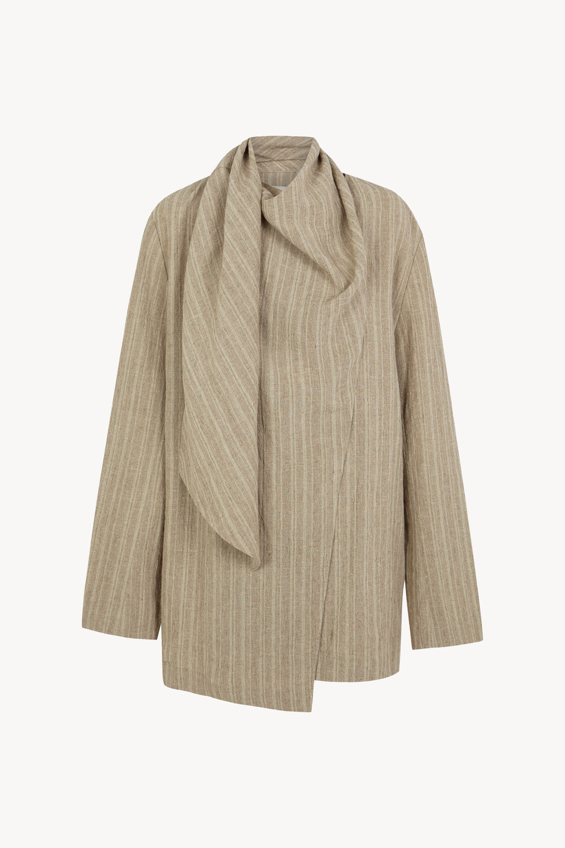 Oversized unisex jacket made from striped linen. The jacket fronts are asymmetrical, fastening the interior with small buttons, while the exterior crosses over with a scarf. The linen fabrics in Cortana's collections are made using traditional methods, which may result in slight variations in thread thickness. These subtle details add a unique character to each garment and are a distinguishing sign of natural fabrics, without compromising the garment's quality.