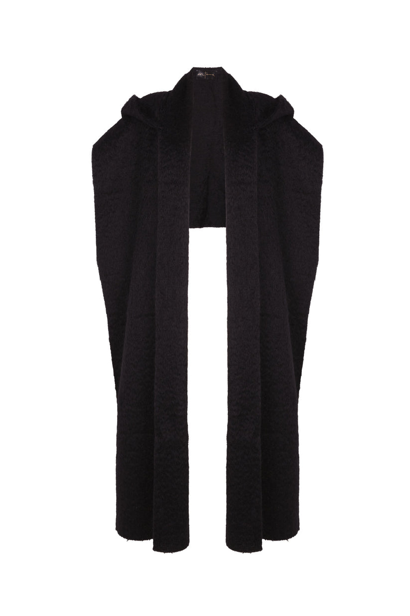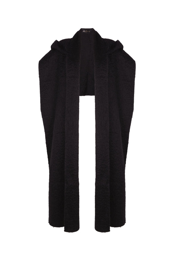 Hood crafted in black mohair, a versatile design can be worn in multiple ways.