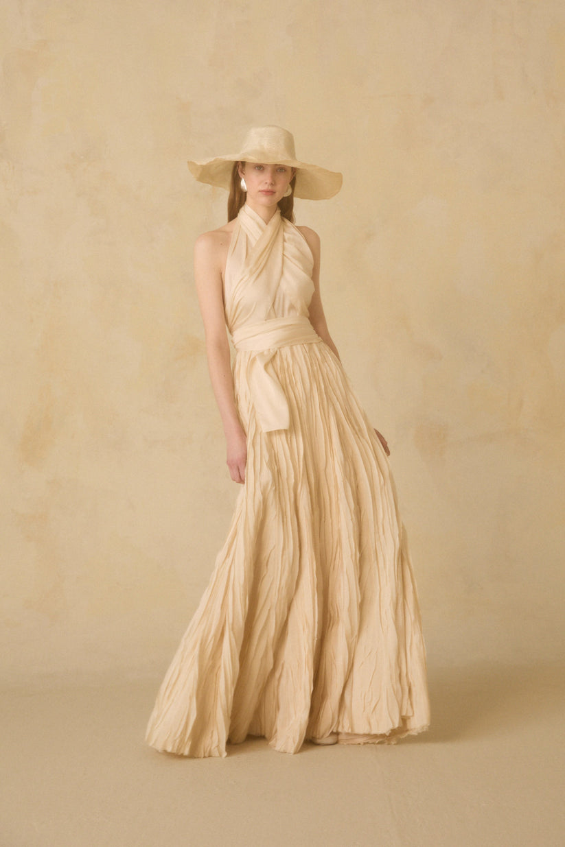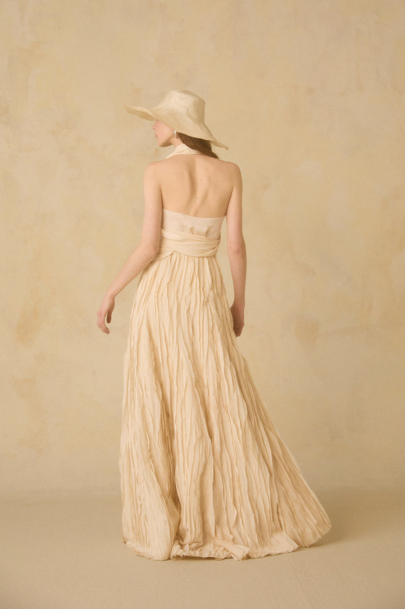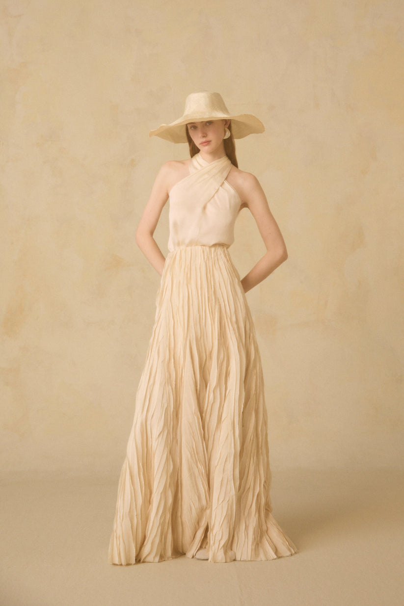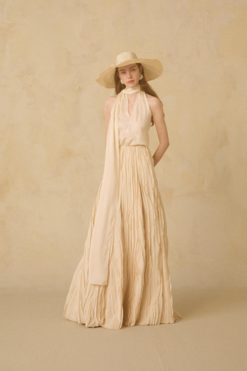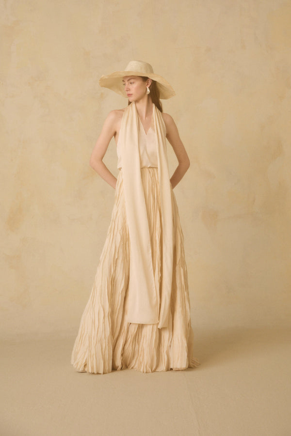 Darika skirt, a handcrafted Indian fabric with small pieces of silk sewn by hand to create a feathered effect. This design stands out for its versatility, as it can also be worn as a dress.