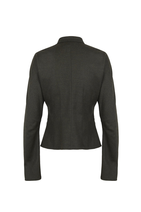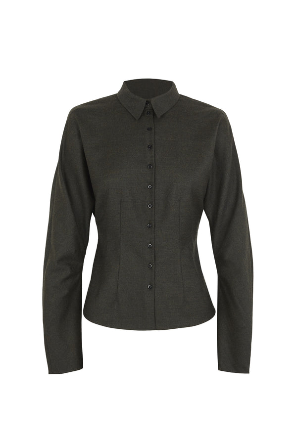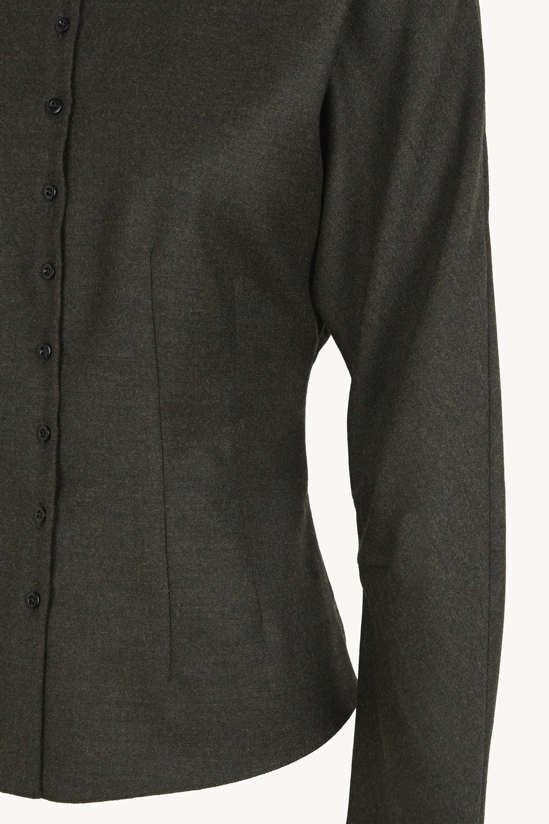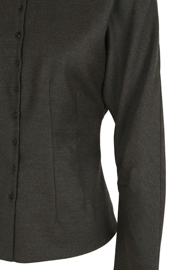 Fitted shirt made from a stretch fabric that blends wool and cashmere. The Cuento shirt has dolman sleeves and a front corozo button clousure.