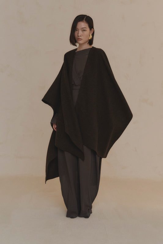 Long, oversized coat in thick linen with three-quarter sleeves and side pockets. This design is cut in a single piece.