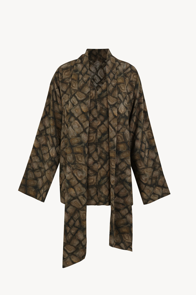 Oversized top made from printed silk. The Deep top features dolman sleeves, a V-neckline, side slits, and an integrated foulard at the nape that can be worn loose or wrapped around the neck. The print is based on a watercolor painting by Cortana’s creative director.