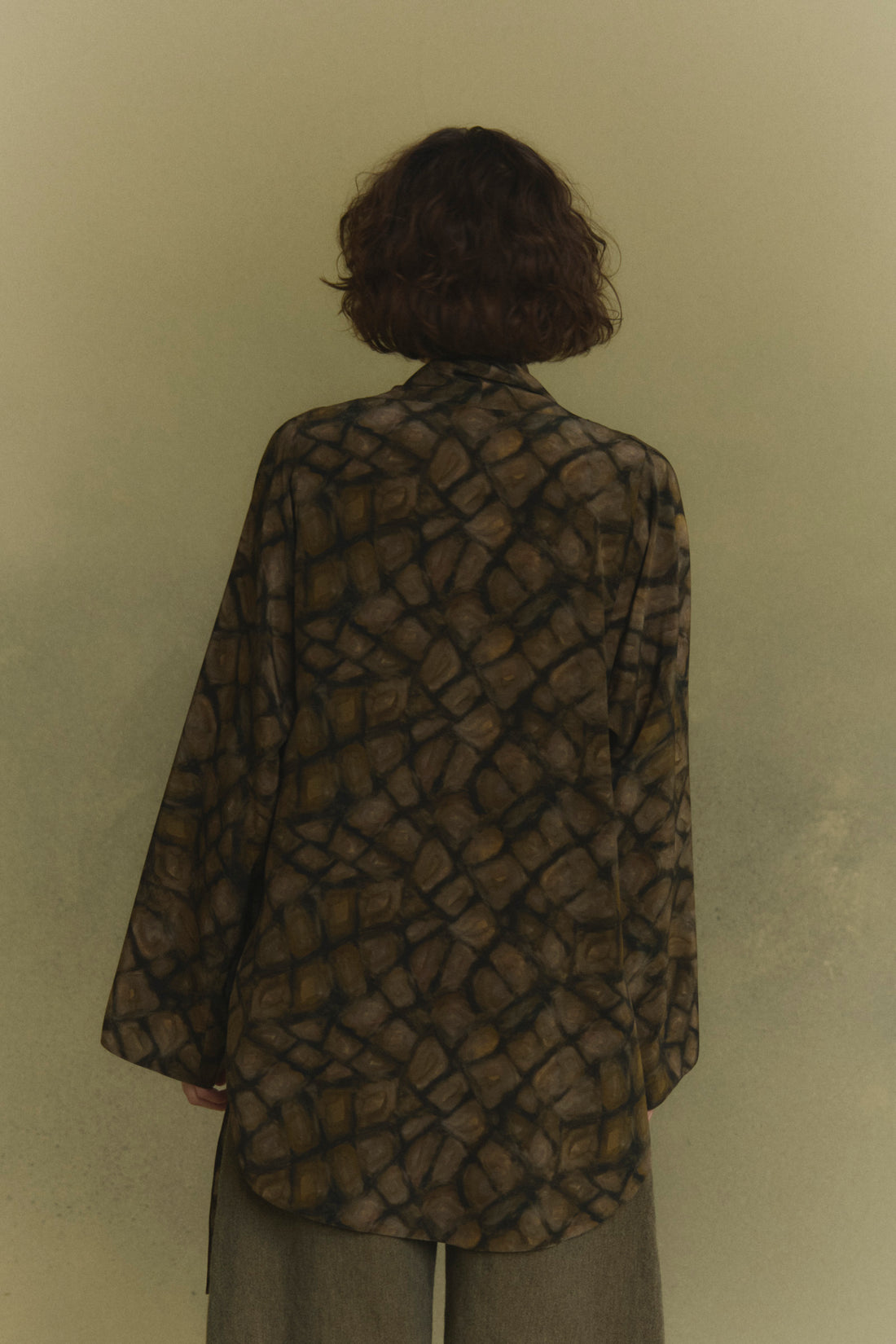 Oversized top made from printed silk. The Deep top features dolman sleeves, a V-neckline, side slits, and an integrated foulard at the nape that can be worn loose or wrapped around the neck. The print is based on a watercolor painting by Cortana’s creative director.