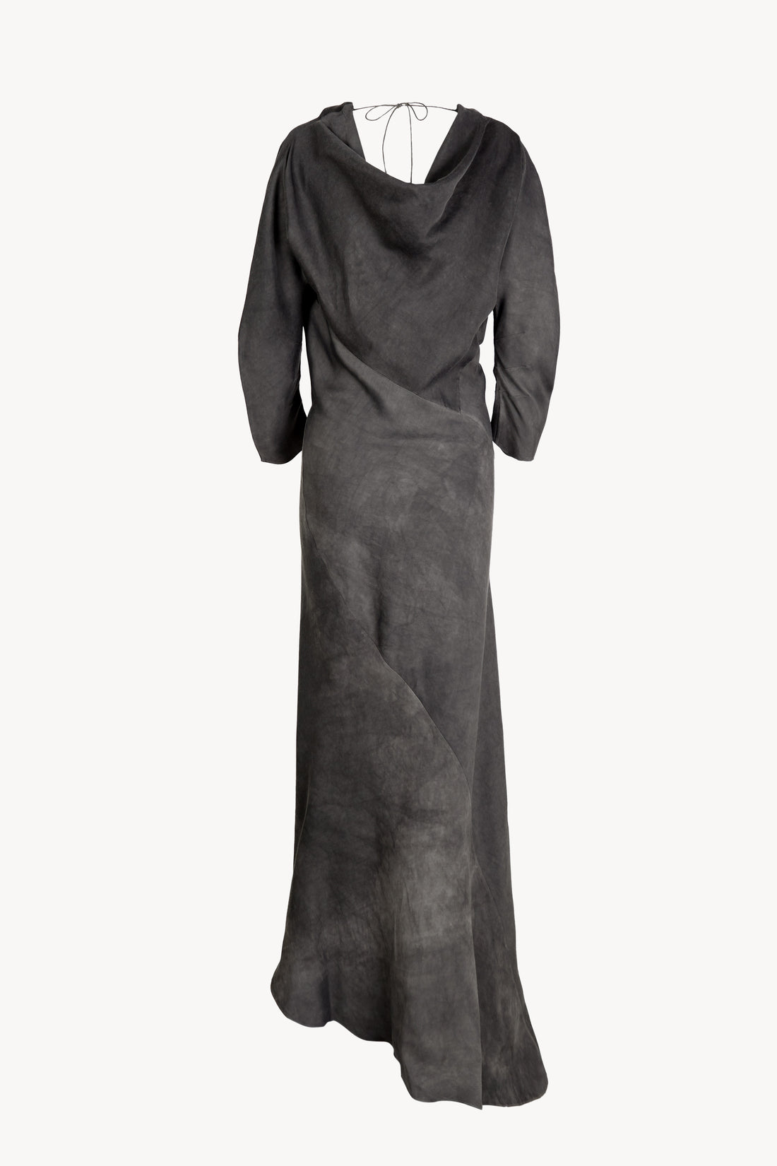 Bias-trimmed midi dress with a draped neckline that can be adjusted in the back or worn loose for an asymmetrical look. This design features dolman sleeves and pleats for added volume.