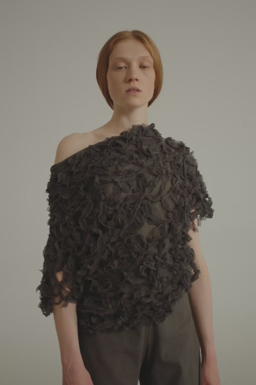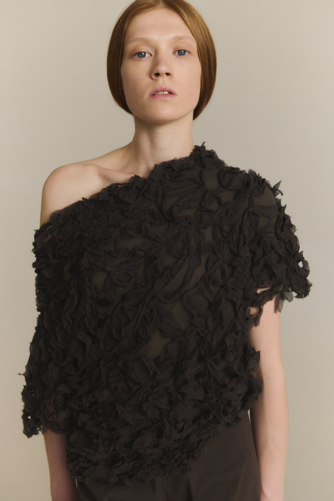 Asymmetric top crafted from fabric handcrafted with embroidered strips of silk bambulla, creating a distinctive and dynamic visual effect. The Embull top is fully lined with silk georgette. It pairs elegantly with the Embull jacket and skirt for a coordinates look.