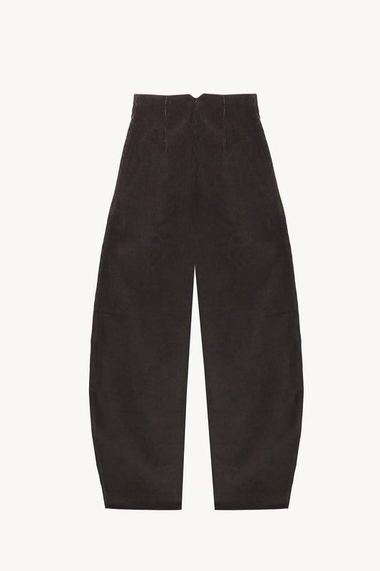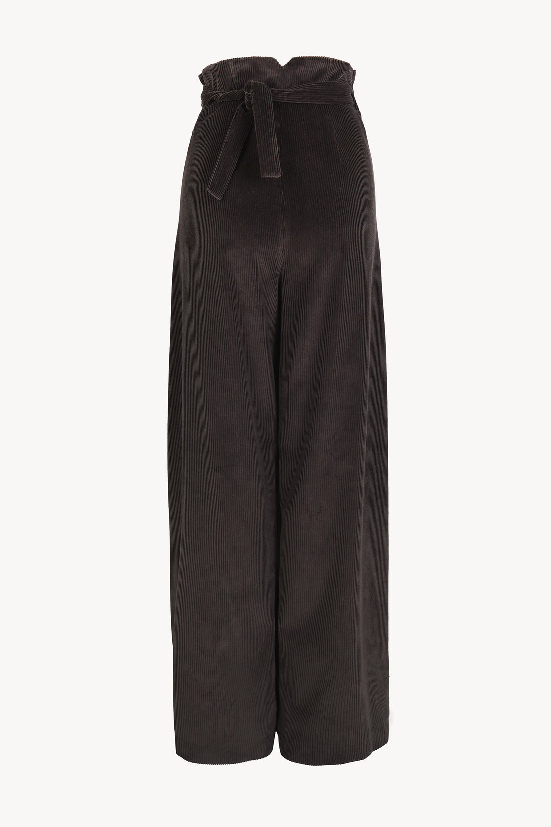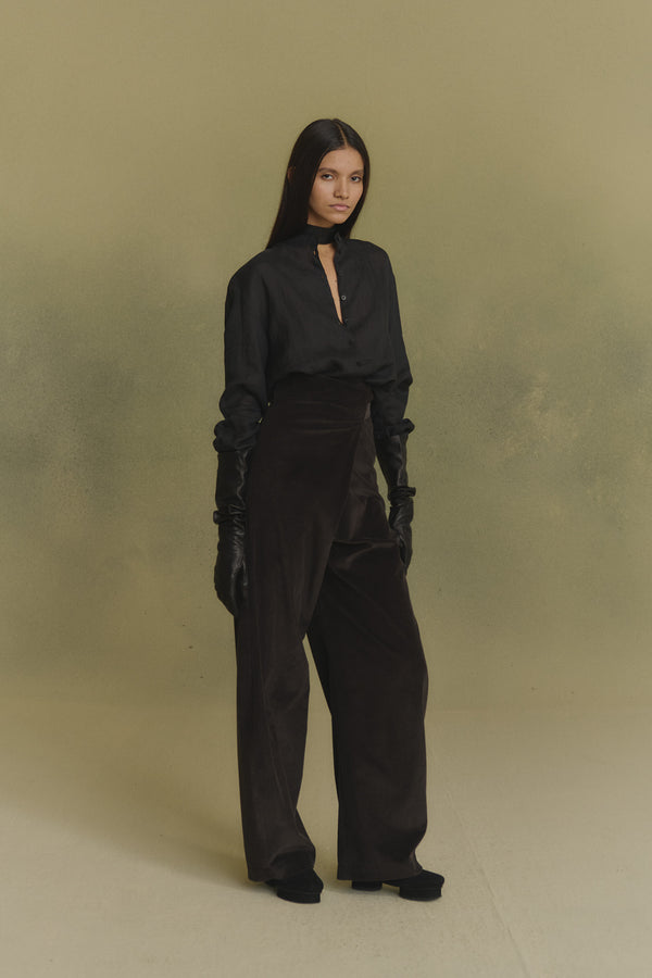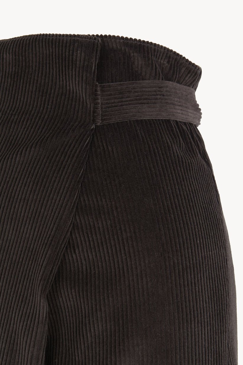 High-waisted wide pants that cross at the front with a narrow belt made of the same fabric that ties at the back. Made in a corduroy fabric that blends cotton, linen, and cashmere.