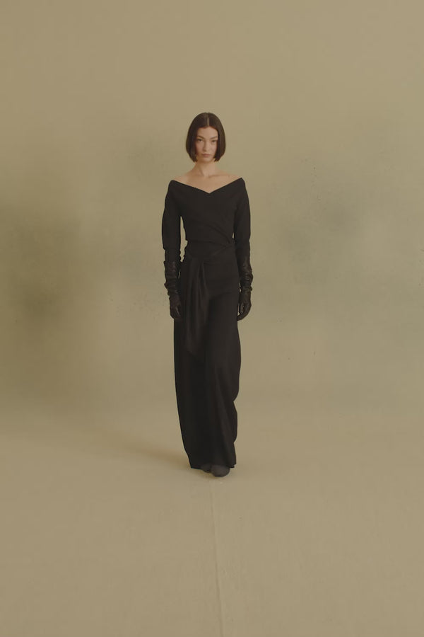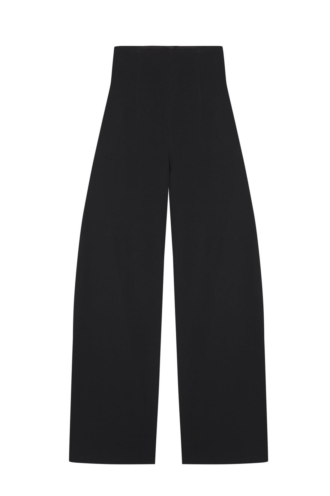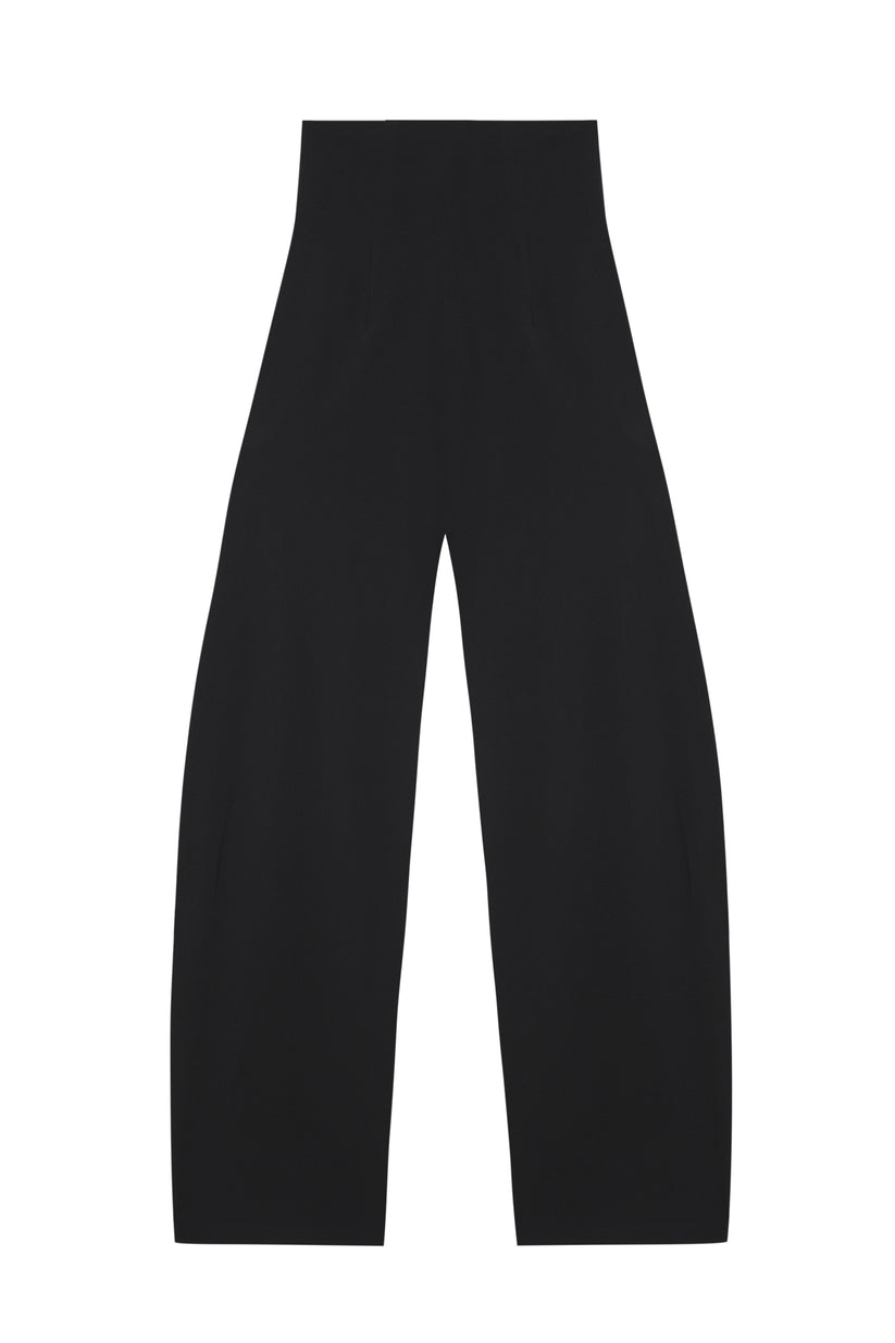 High-waisted pants with a subtle curve in the leg, made from a stretch fabric. They feature an invisible zipper at the front.