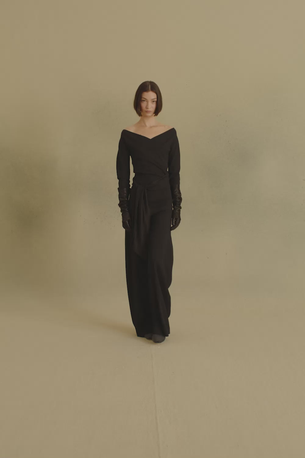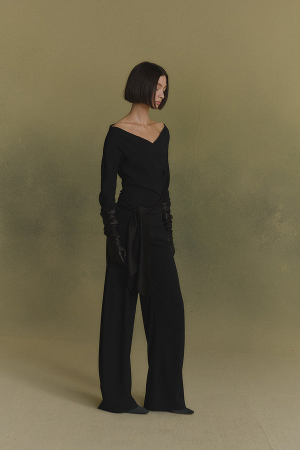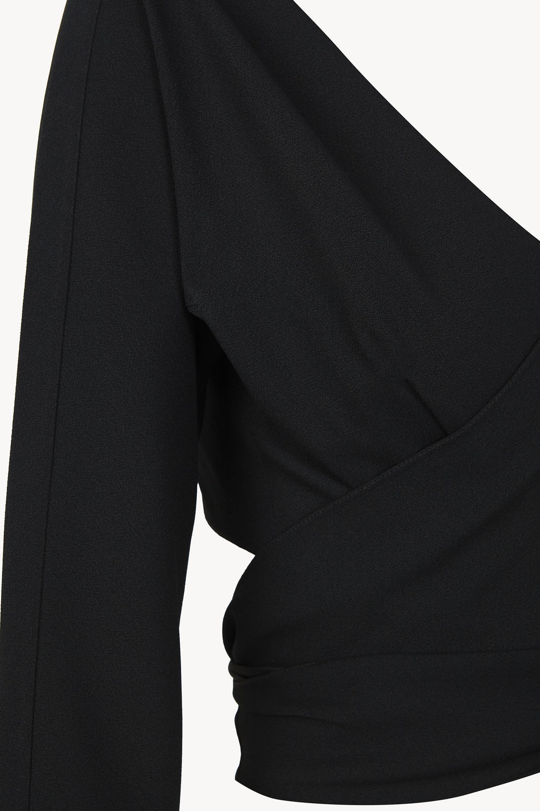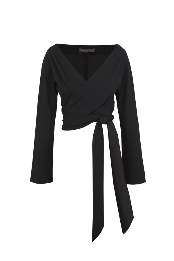 Wrap top with long dolman sleeves, made from a stretch fabric. It crosses at the front with integrated ties and fastens at the waist.