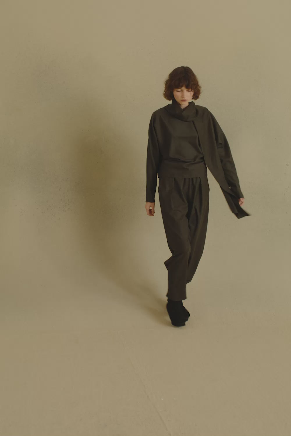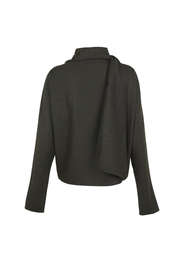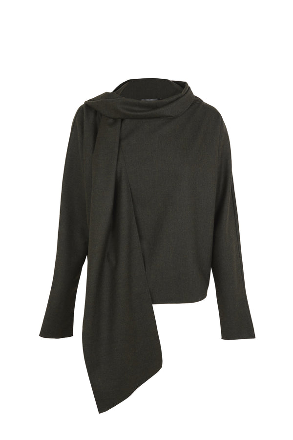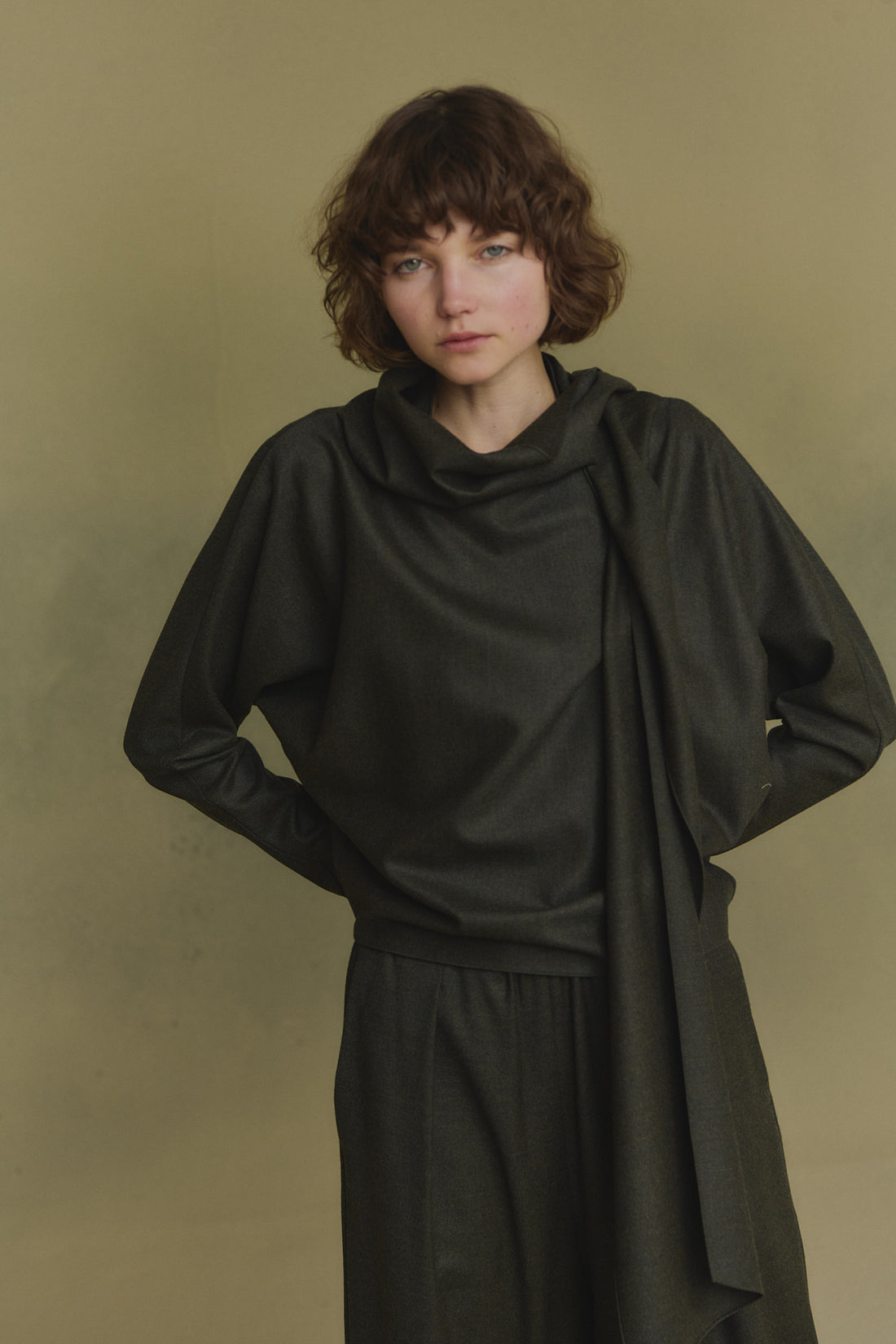 Long-sleeve top with dolman sleeves made in a fabric that combines wool and cashmere. The Fabula top has an integrated scarf of the same fabric that can be worn loose or around the neck as a scarf.