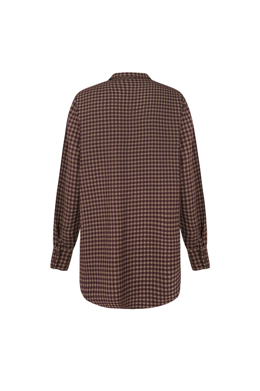 Fred, burgundy checkered shirt dress made of virgin wool and viscose jacquard. This model has long sleeves, a front closure with matching corozo buttons and two side slits.