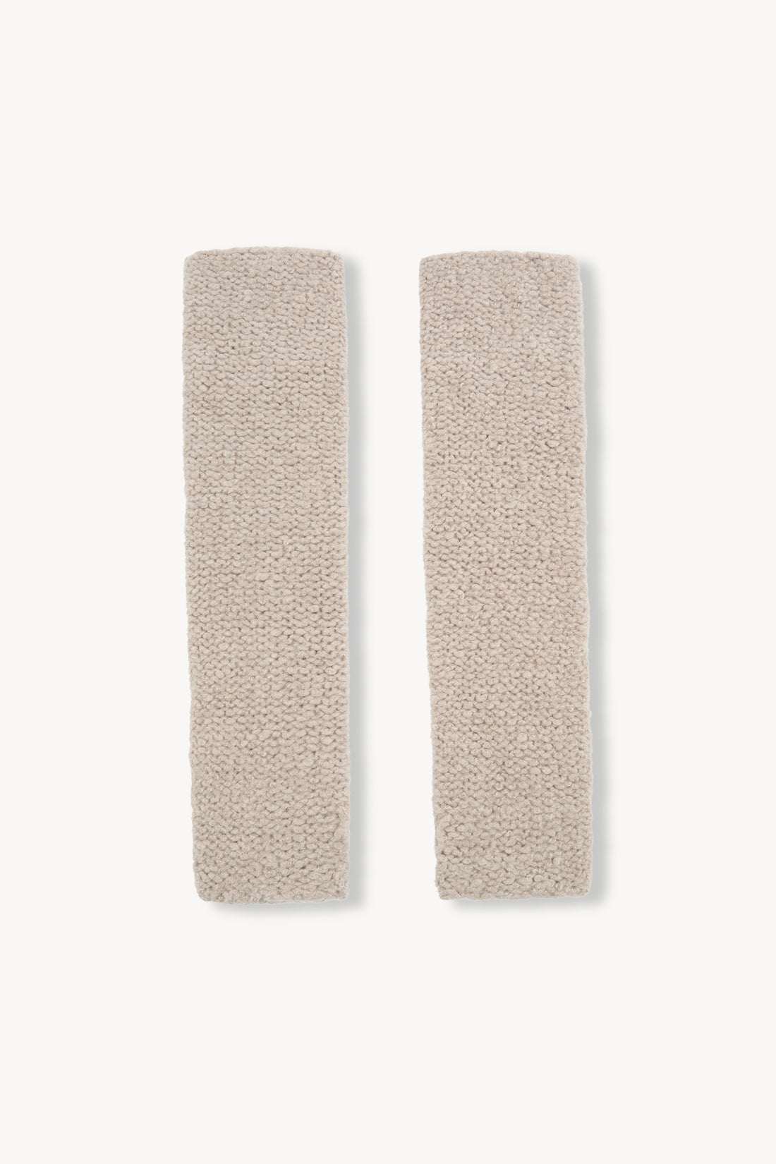 Long knitted sleeves with thumbholes made with a yarn that combines cashmere and silk.