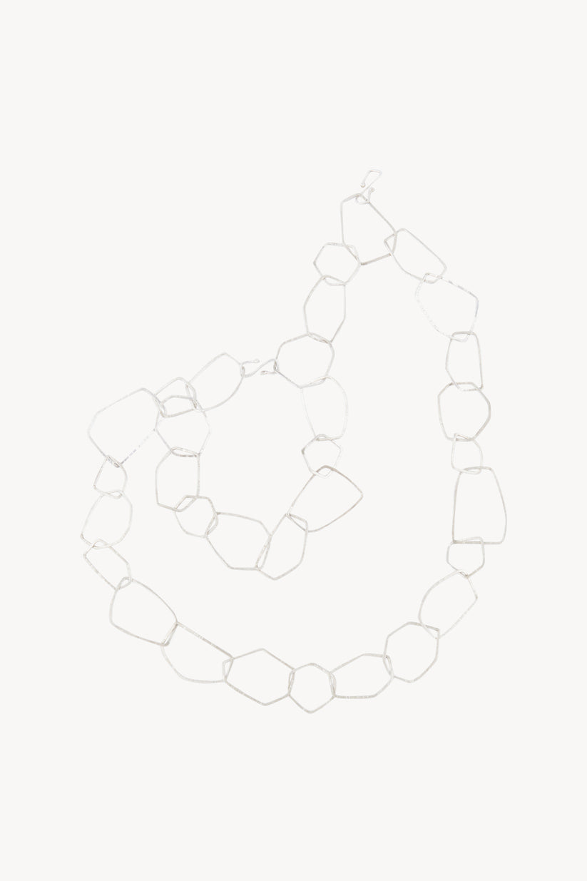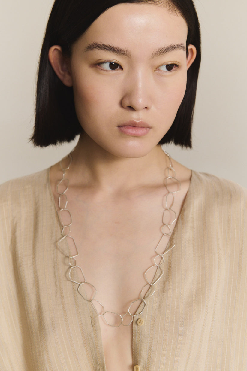 Necklace featuring interlinked hoops of irregular sizes, meticulously handcrafted in sterling silver. Designed by Cortana’s creative director and produced in artisan workshops in Mallorca, this piece is part of the Irus collection. Two clasps allow adjustment to various lengths, offering versatile styling options.