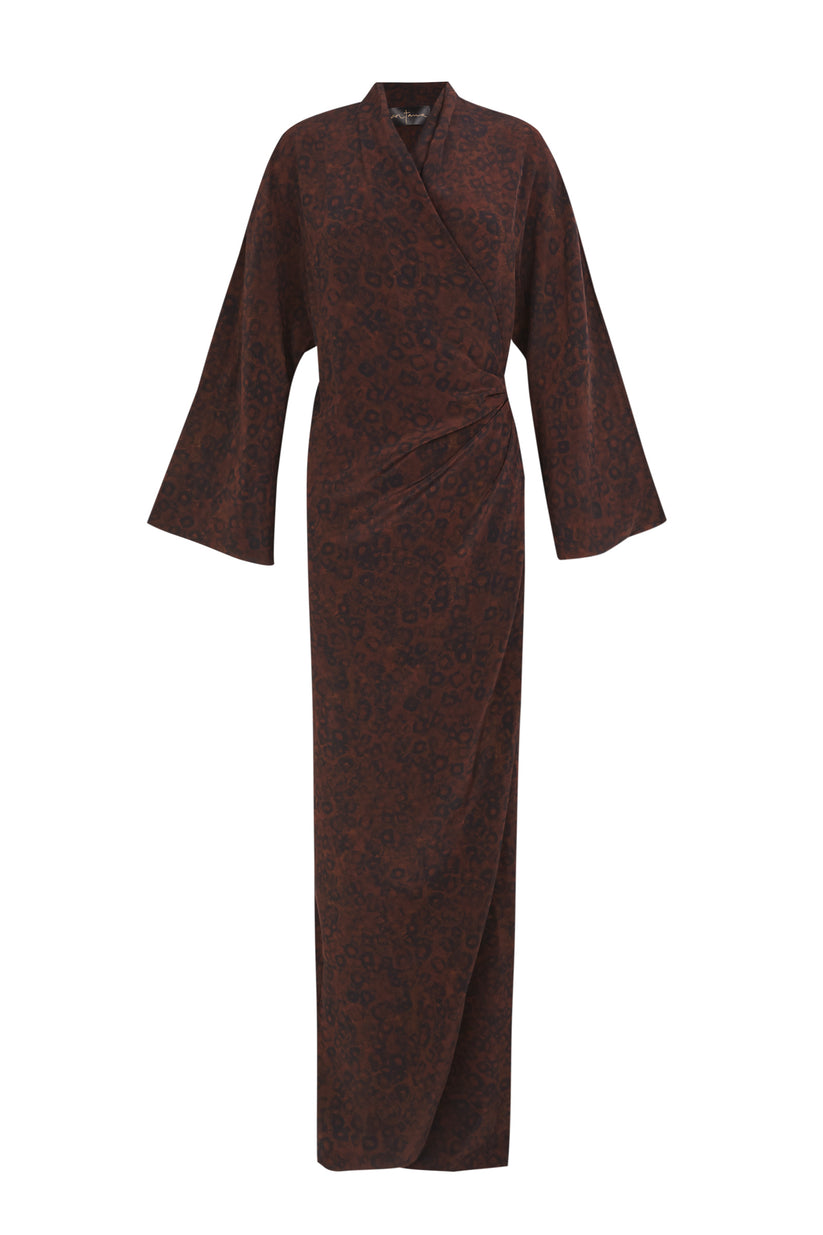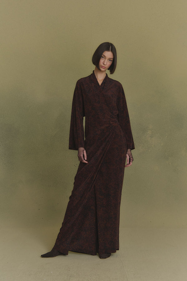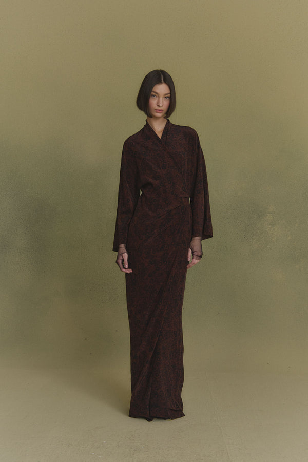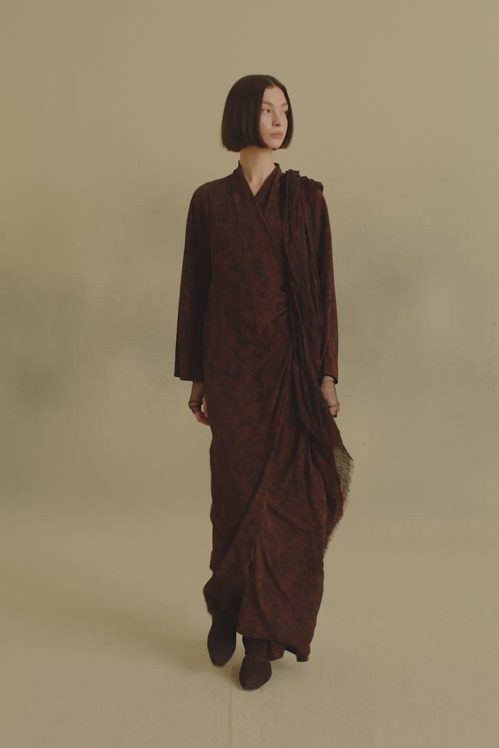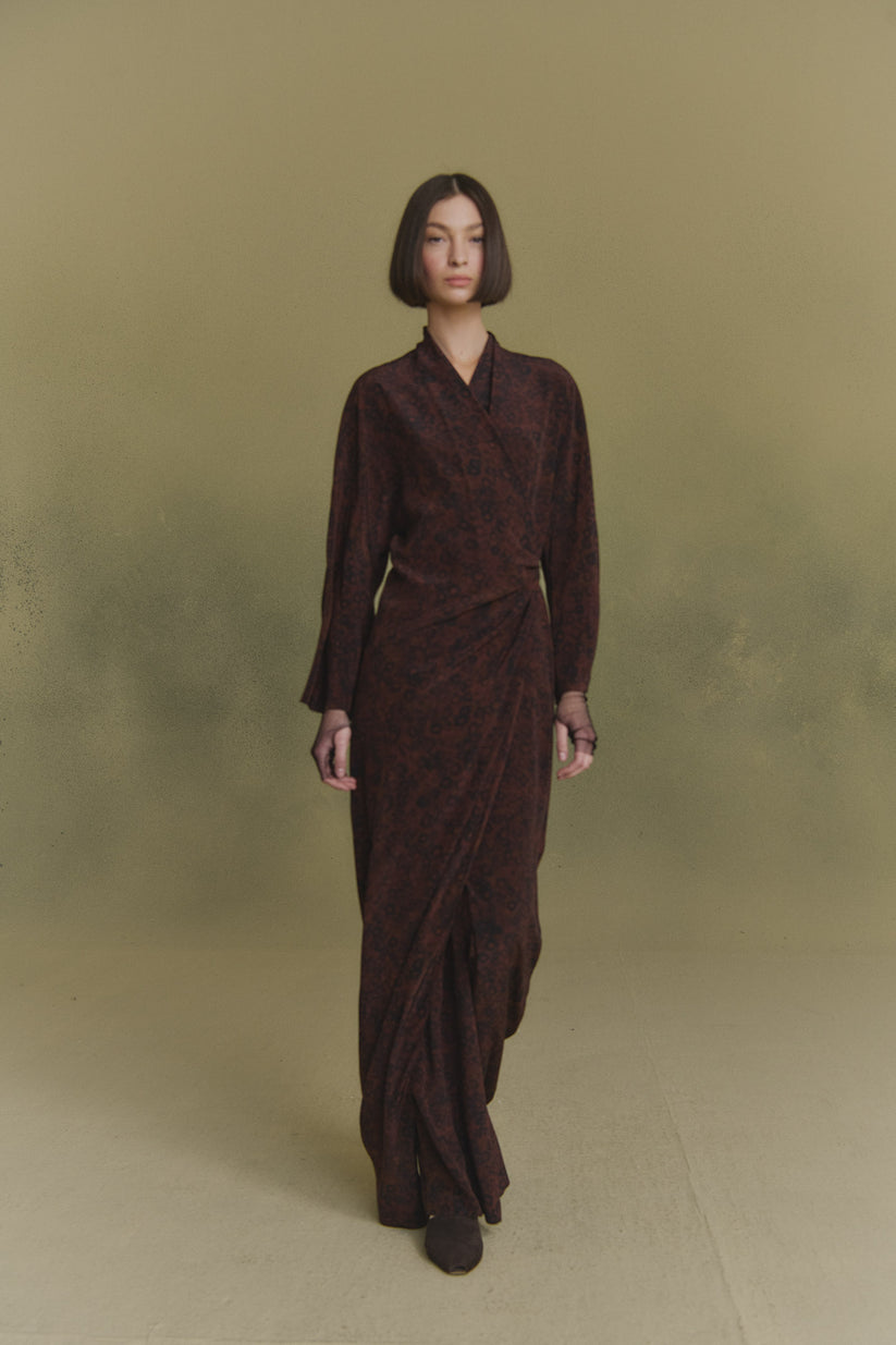 Long kimono-style dress with dolman sleeves crafted from silk with a print inspired by a watercolor by Cortana's creative director. The dress crosses at the front and ties with an integrated sash, creating a subtle drape.