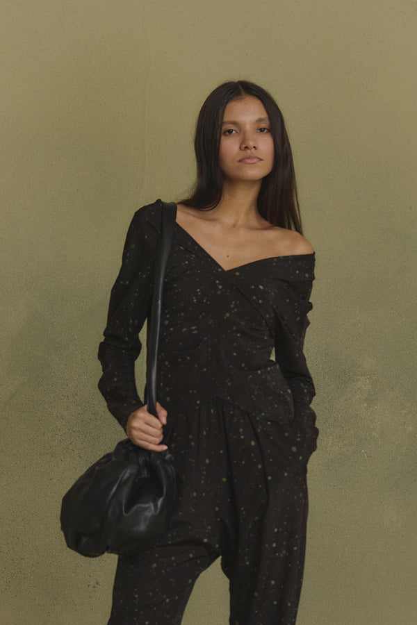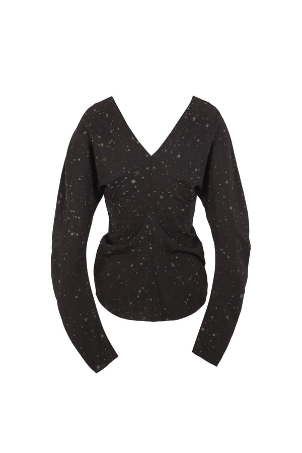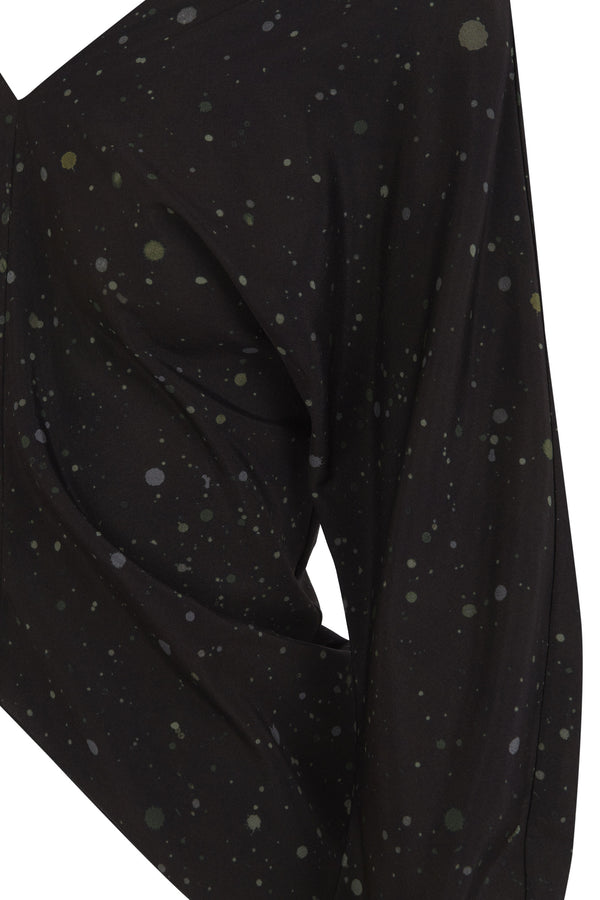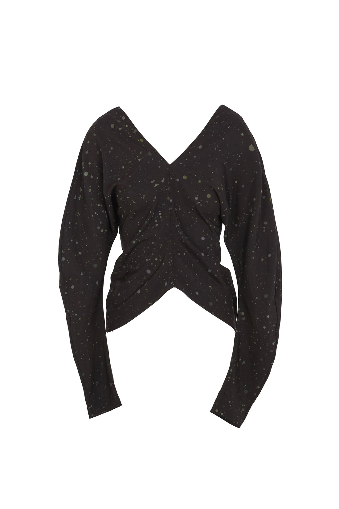 Draped top made of stretch printed silk, with long dolman sleeves and a V-neckline that can be worn more or less open despending on the occasion. The print is inspired by a watercolor by Cortana's creative director.