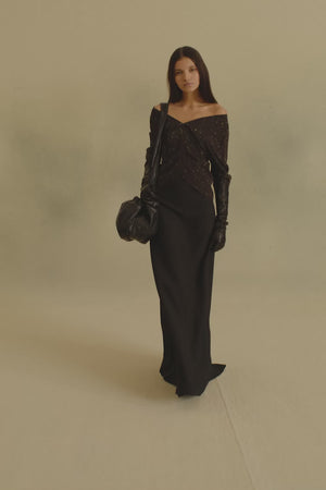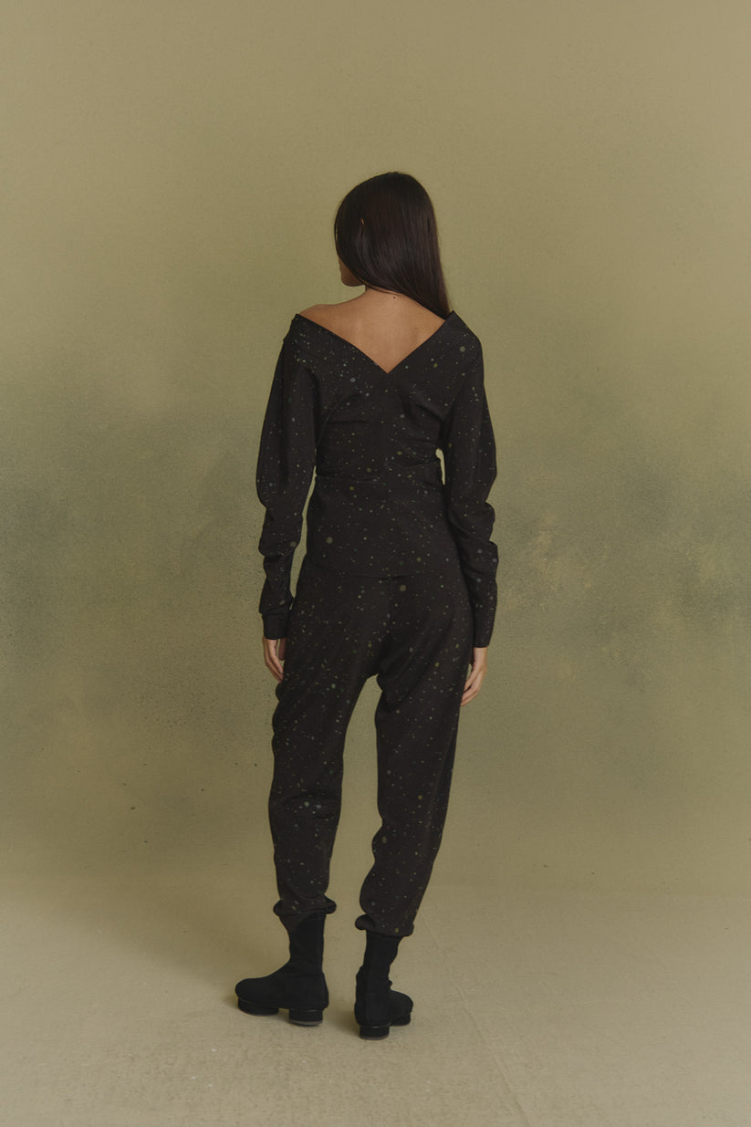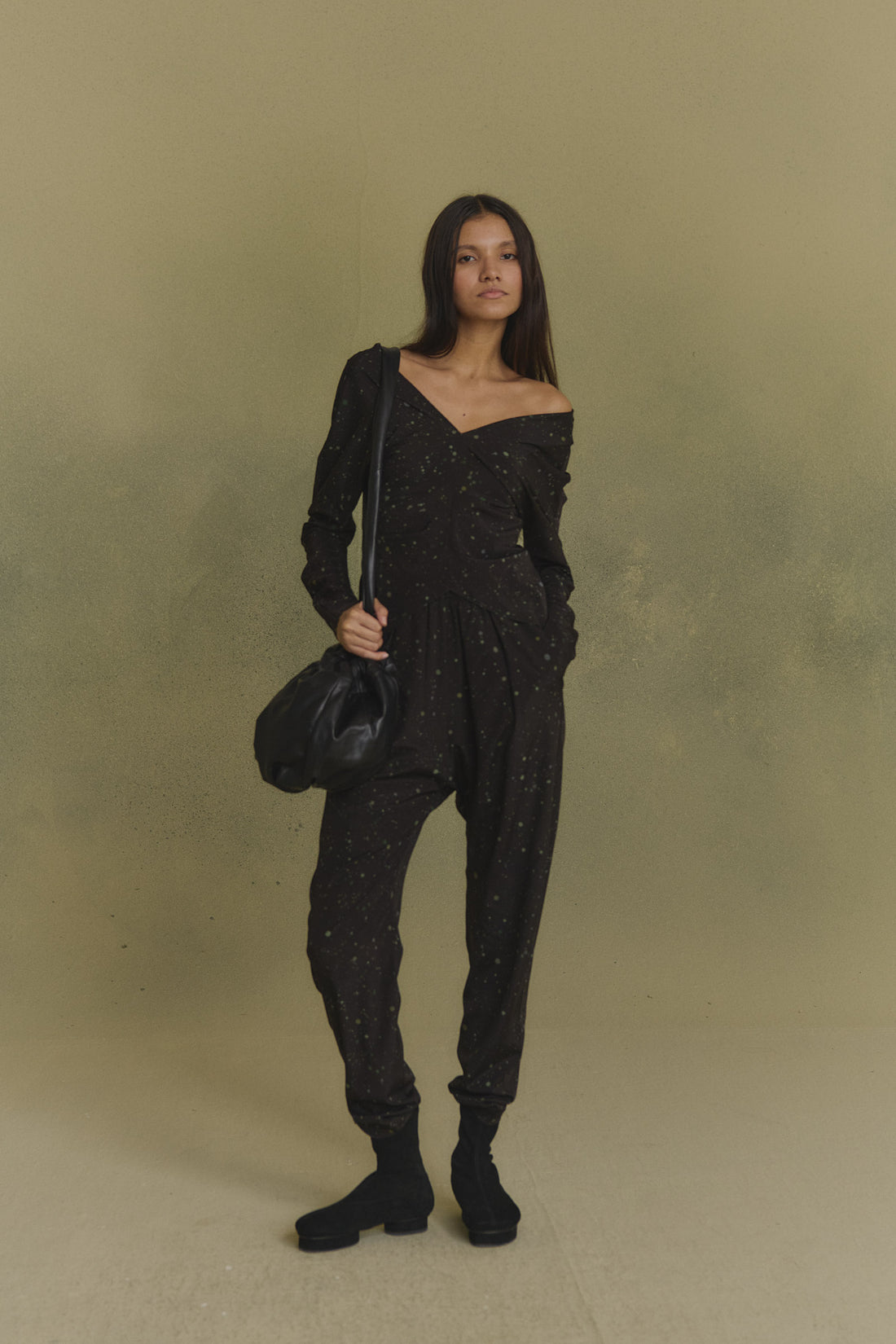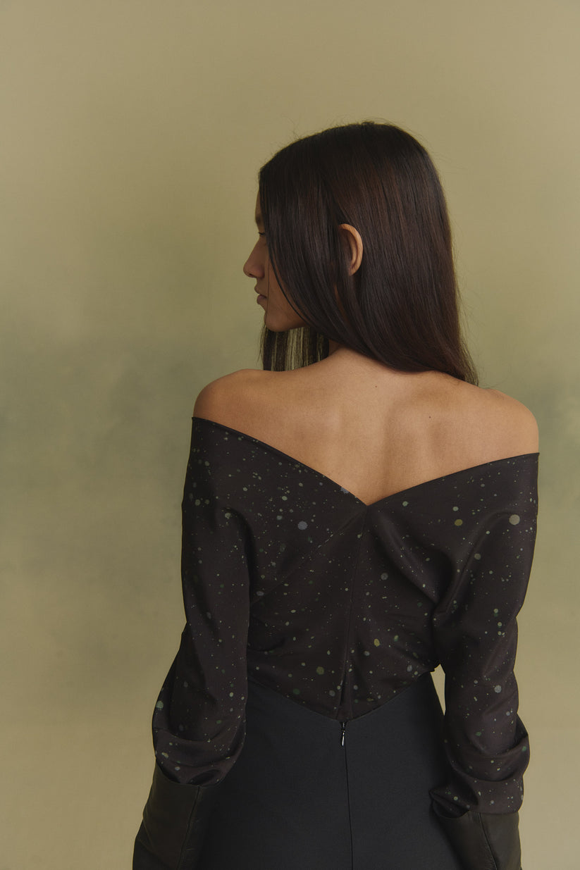 Draped top made of stretch printed silk, with long dolman sleeves and a V-neckline that can be worn more or less open despending on the occasion. The print is inspired by a watercolor by Cortana's creative director.