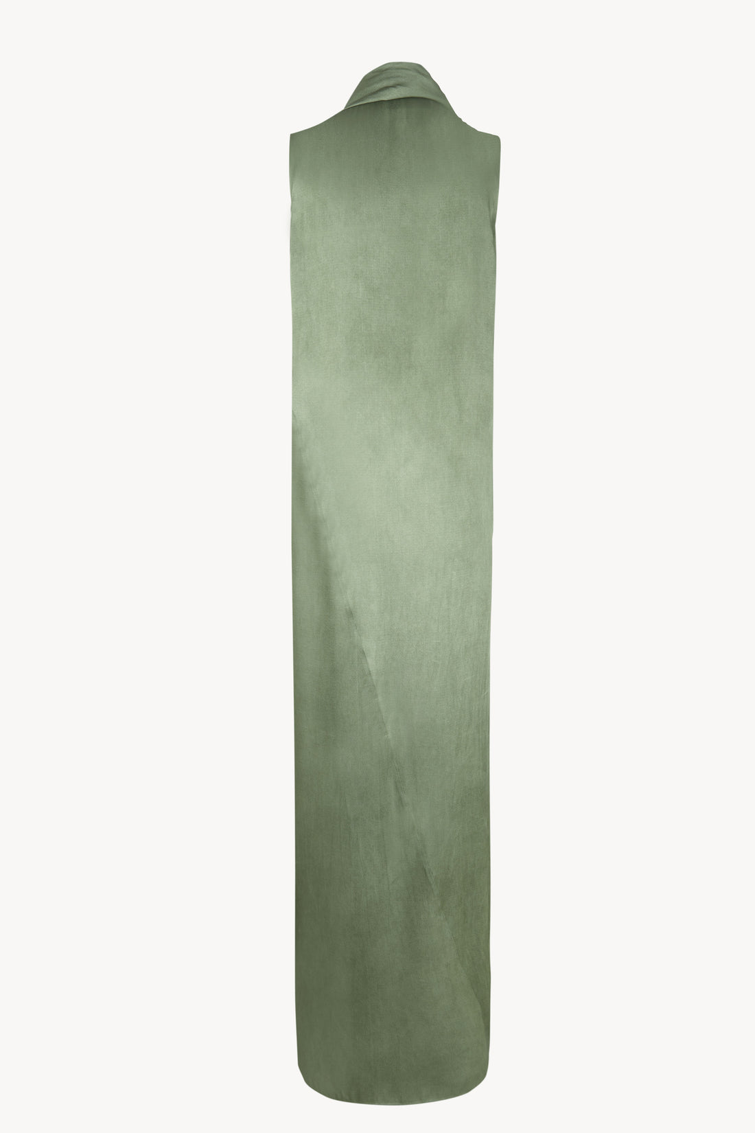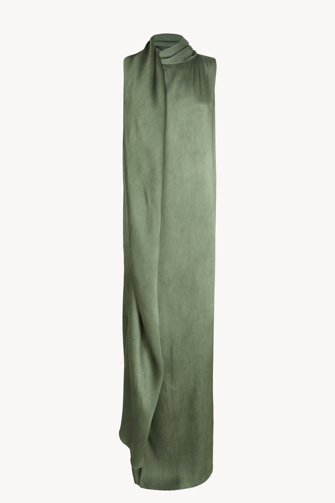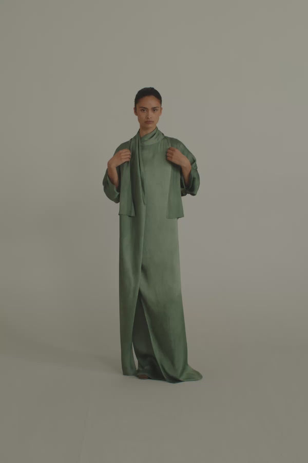 Sleeveless evening dress crafted from a thick fabric featuring a satin maltinto finish. Designed with a sleek, straight silhouette, it includes a front slit and an integrated stole that can be styled in multiple ways.
