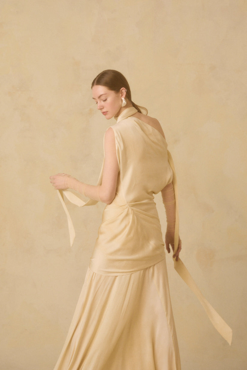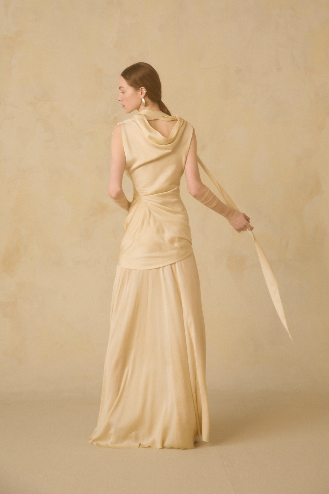 Long bias-cut dress, made of silk satin with an irregular dye finish. Made from two layers of fabric, it has several asymmetrical cuts that create a draped effect. It can be adjusted in various ways with an integrated sasg at the back neckline.
