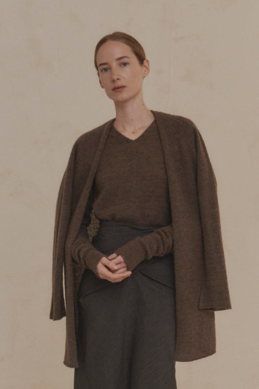 The alpaca yarns used in this garment are RAS (Responsible Alpaca Standard) and RWS (Responsible Wool Standard) certified, which guarantee the well-being of the sheep and the land on which they graze.