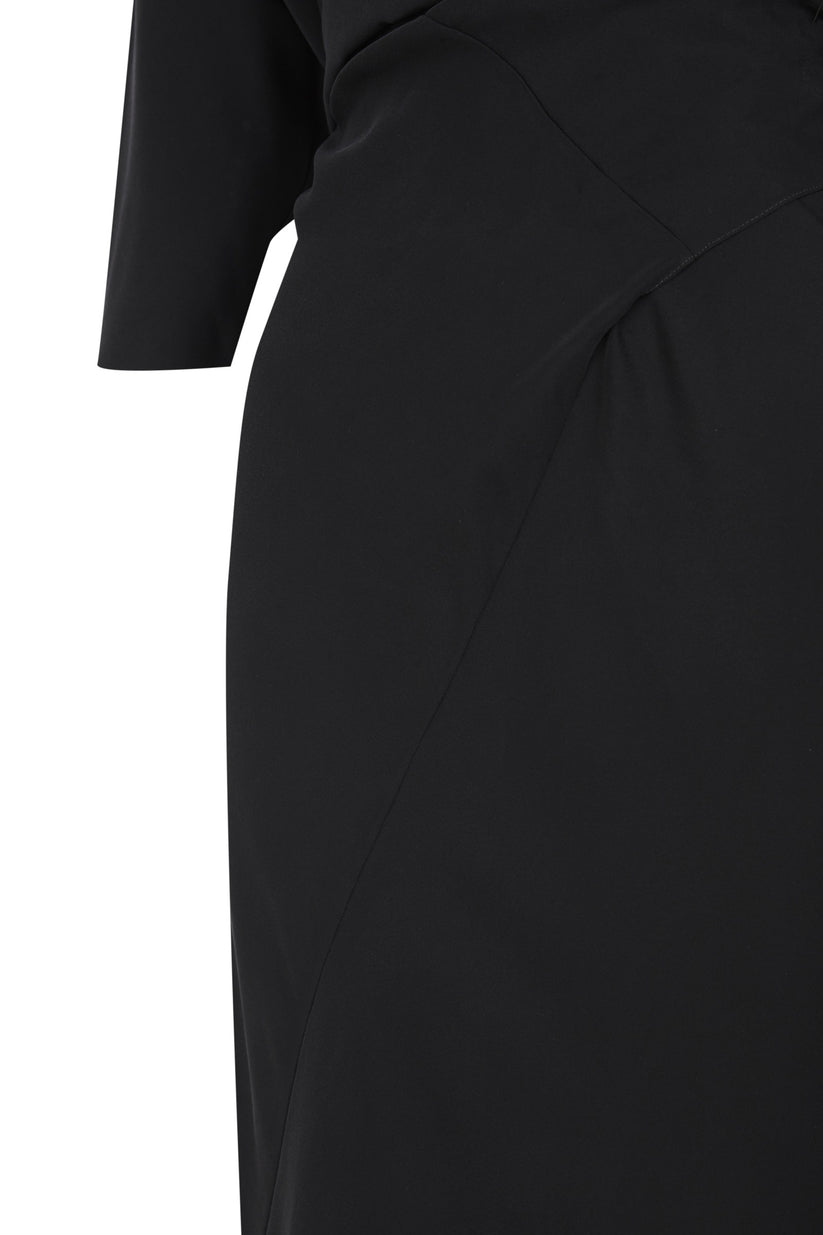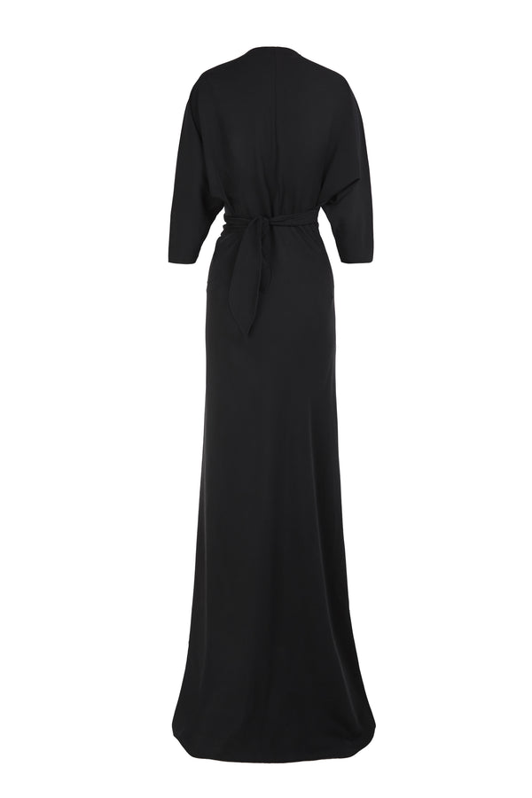 Long bias-cut dress in matte silk with dolman sleeves and V-neck. It crosses at the front and ties at the back