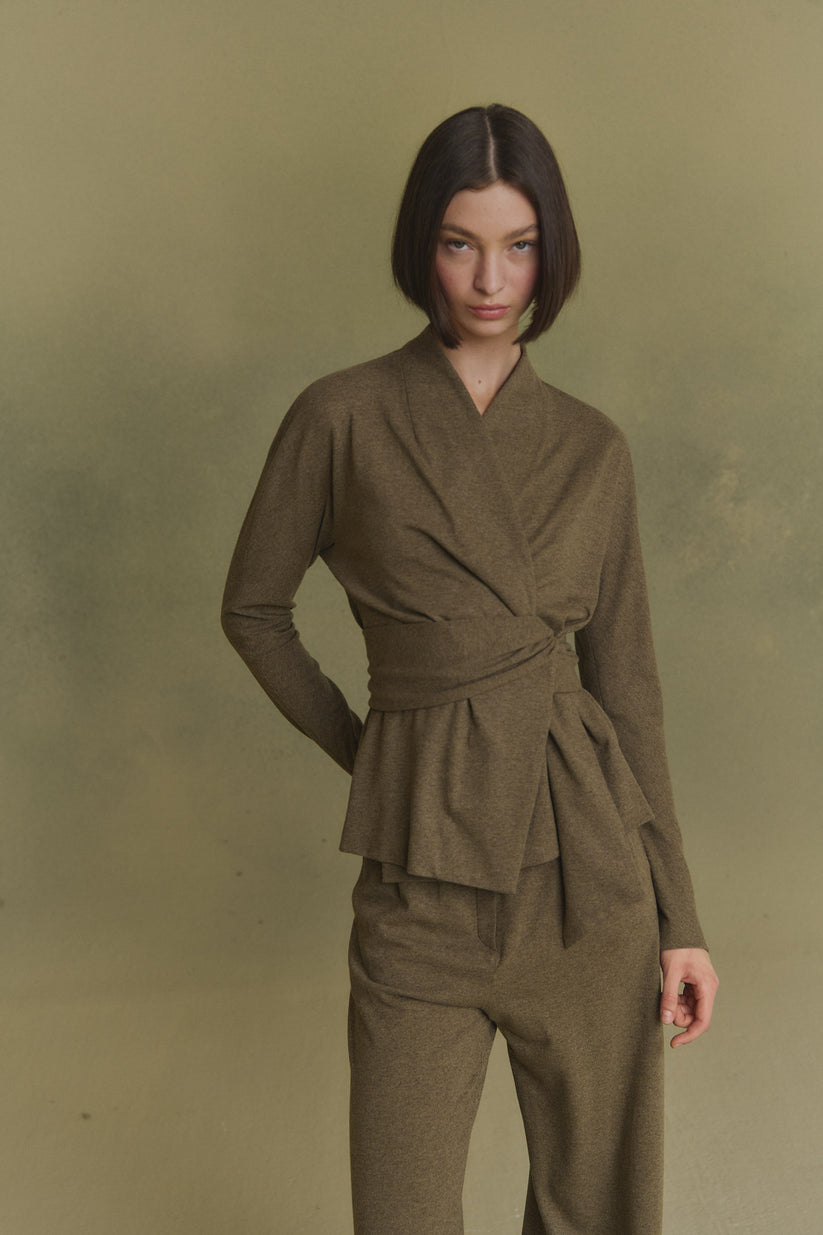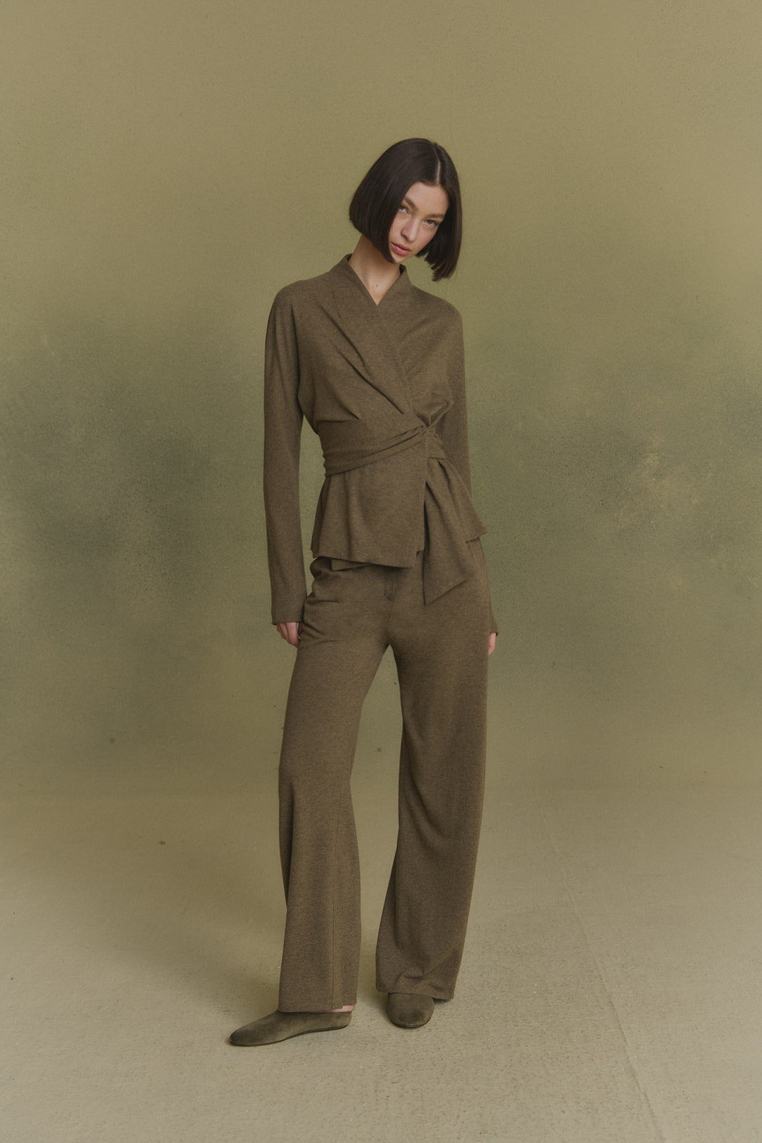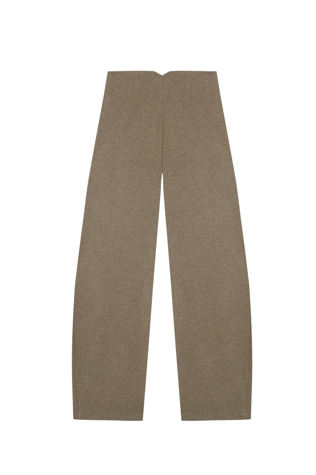 High-waisted, masculine-style trousers with pleats and side pockets, crafted from a melange fabric that combines premium Italian wool and cashmere, offering a warm feel and soft structure. Can be paired with the matching Mate jacket