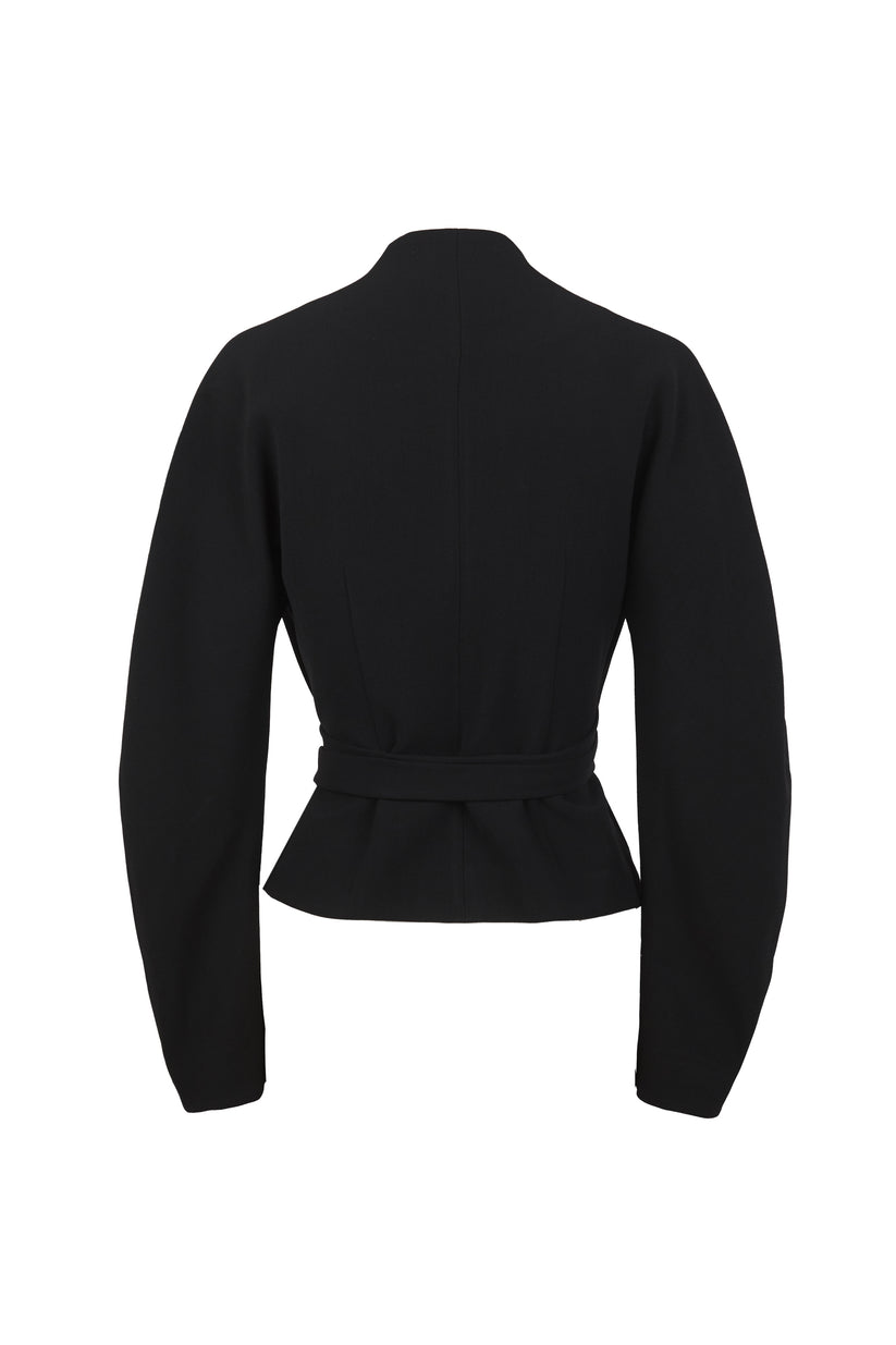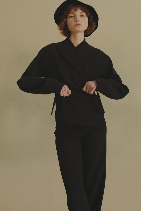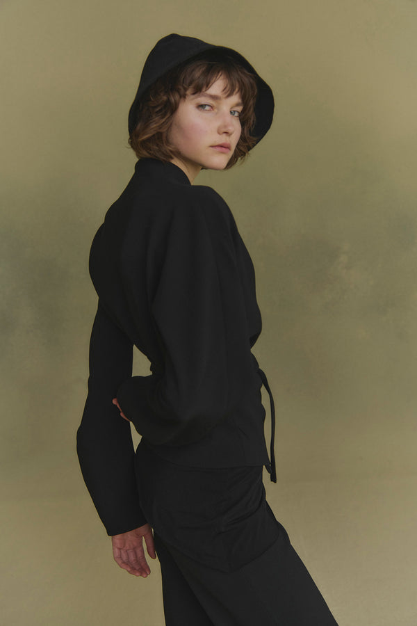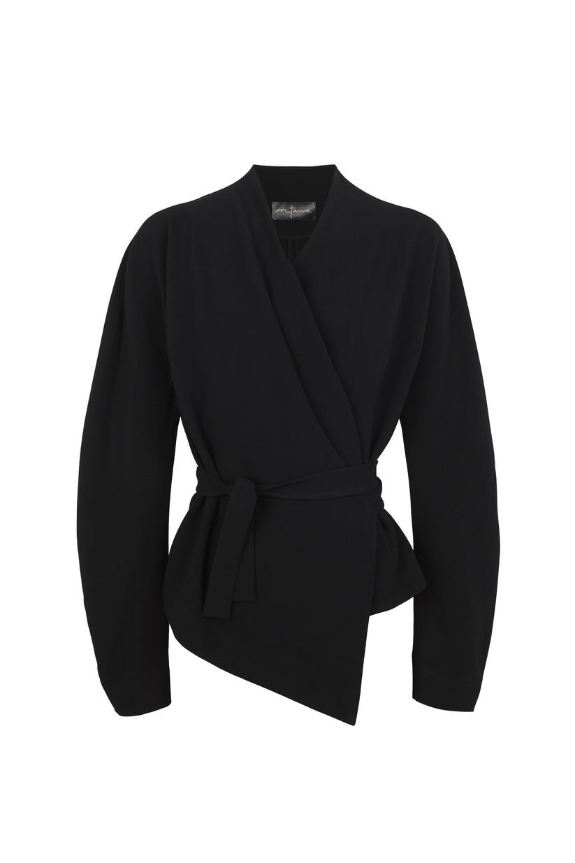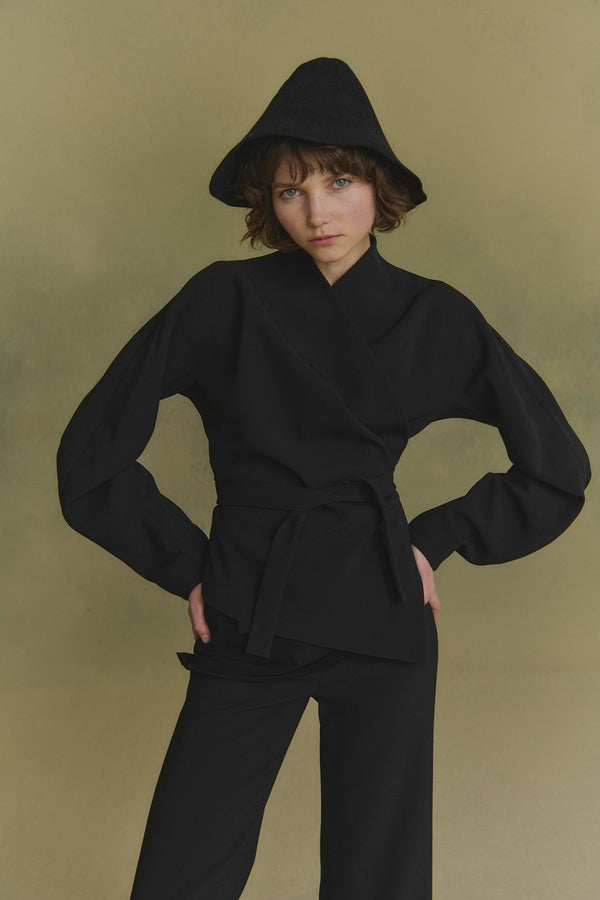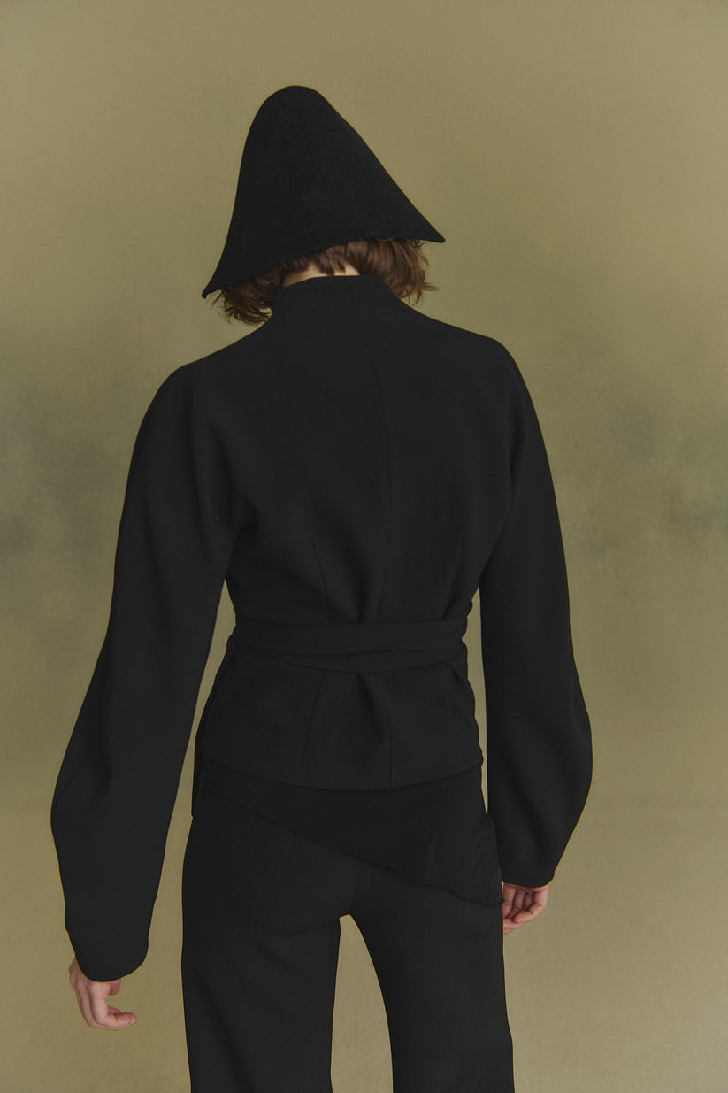 Midnight jacket made from a stretch wool fabric, featuring slightly curved dolman sleeves and crossed at the front. Worn cinched at the waist with a belt.