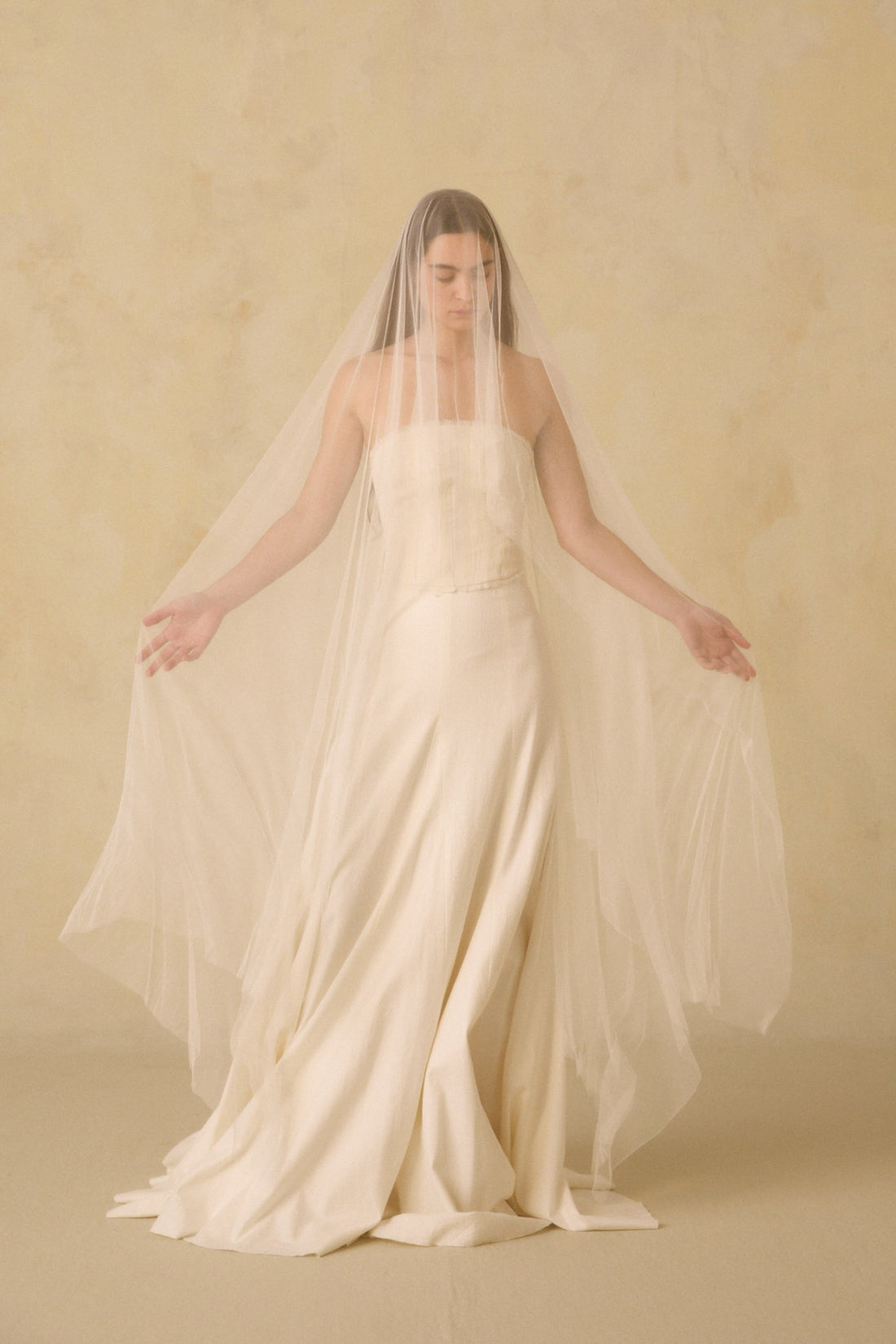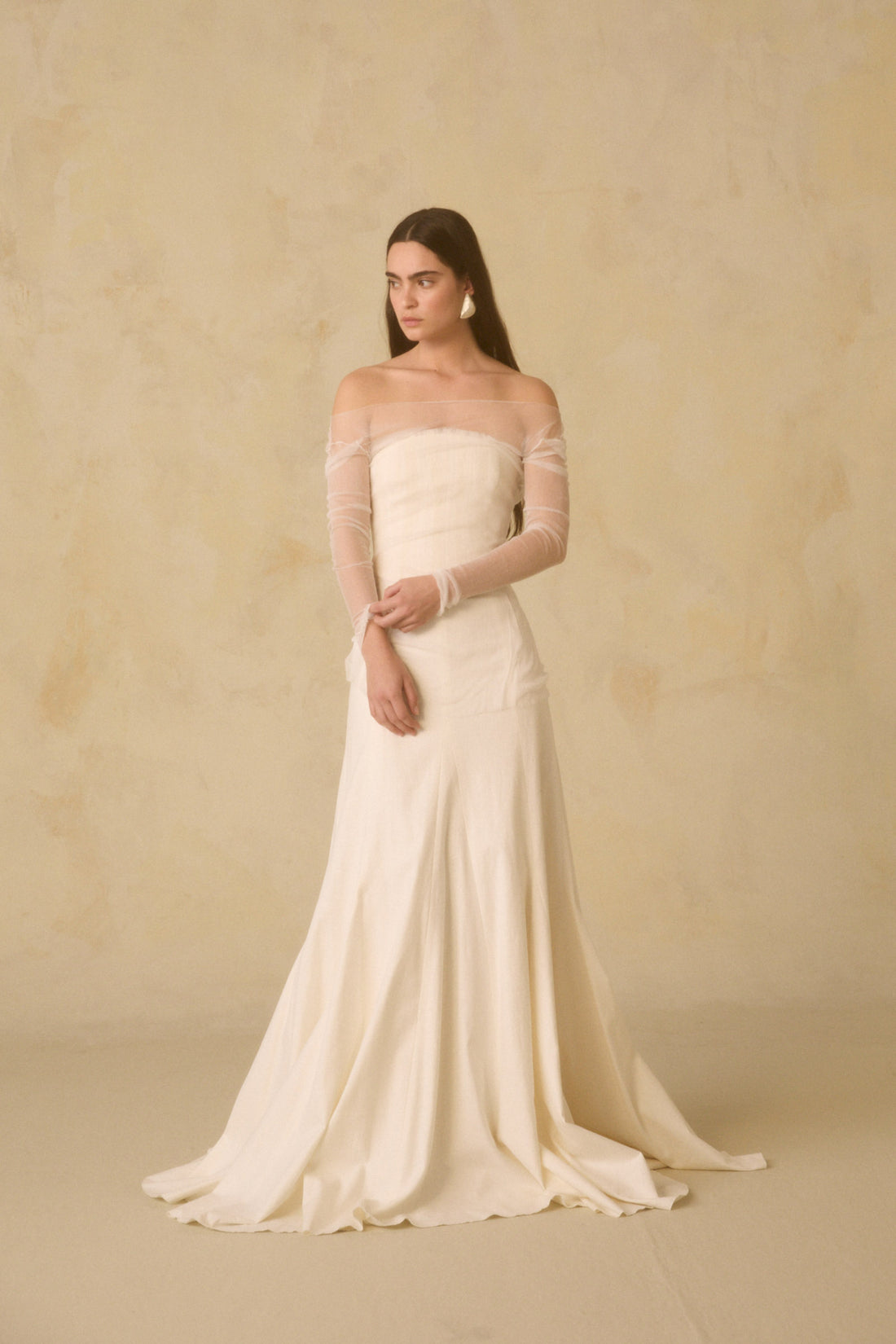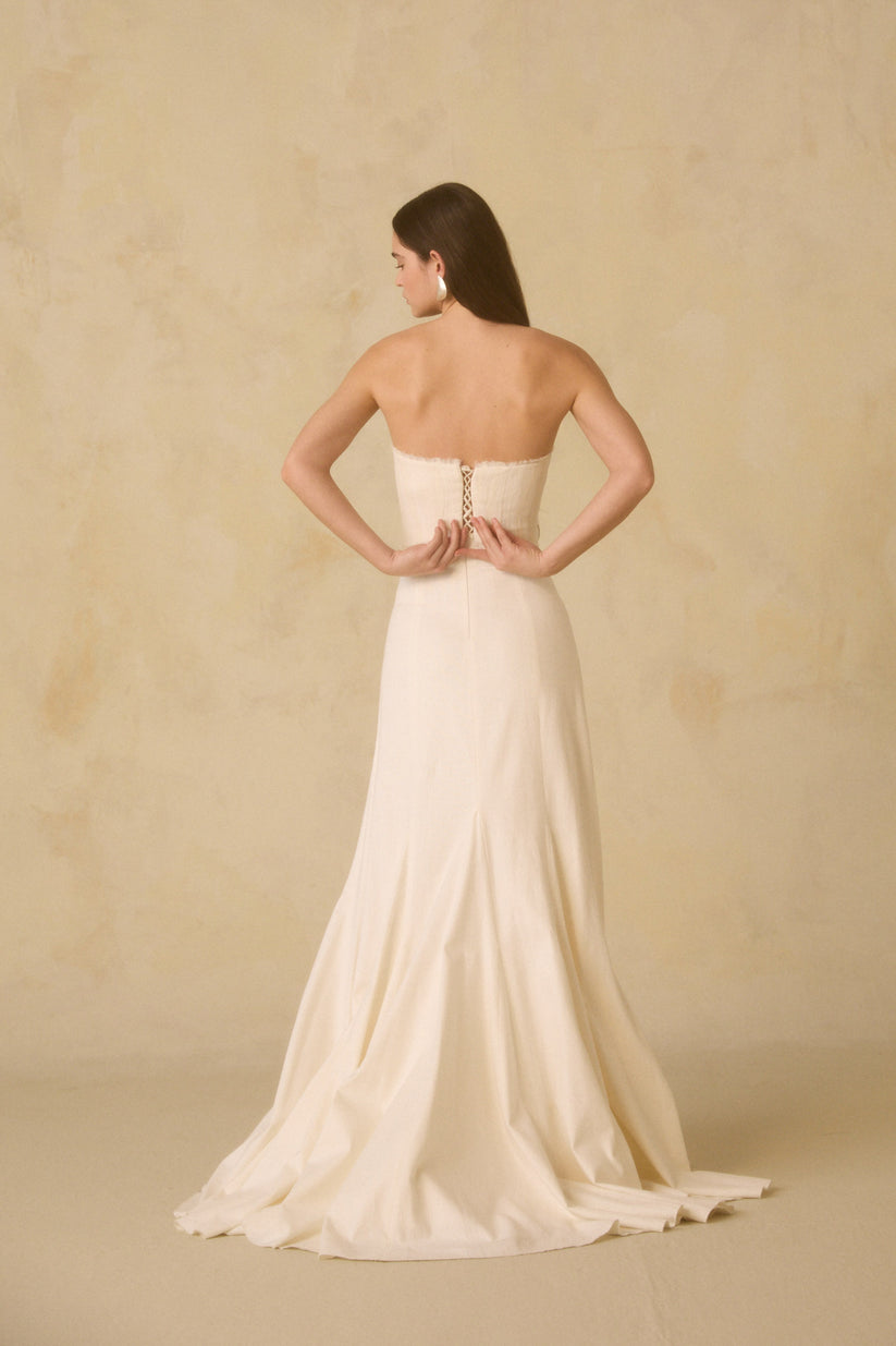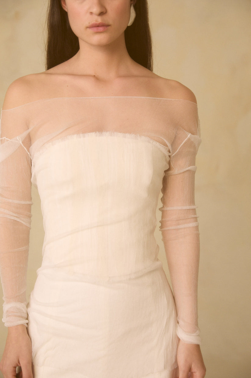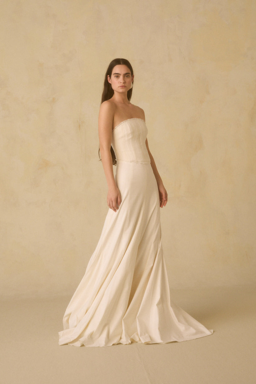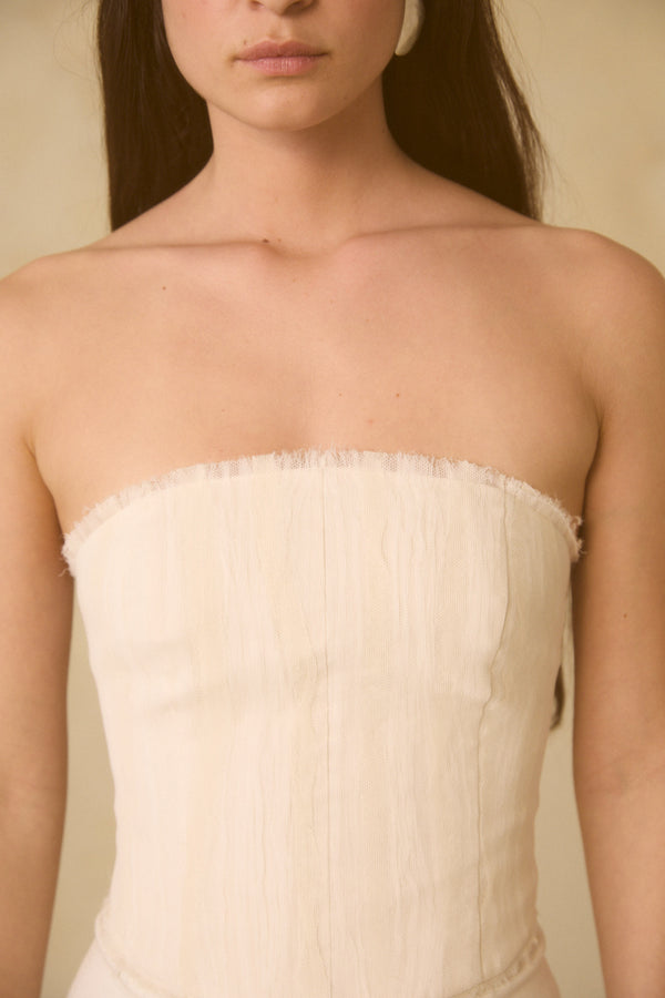 Mio, a strapless top with a linen and stretch viscose lining. The exterior is composed of various pieces of silk bamboo in shades of white and ivory, joined together to create a new fabric. The Mio top features an outer layer of cotton tulle and closes in the back with a corset-style lacing.