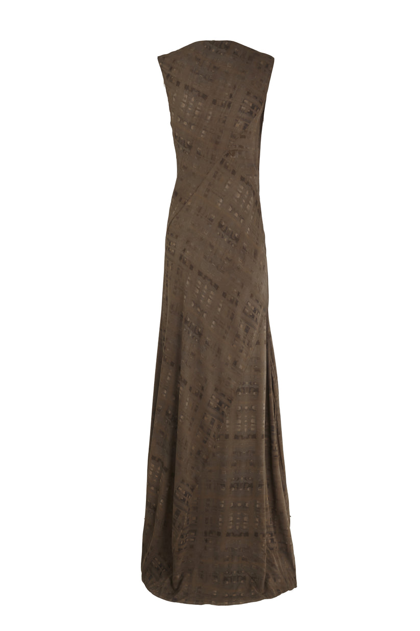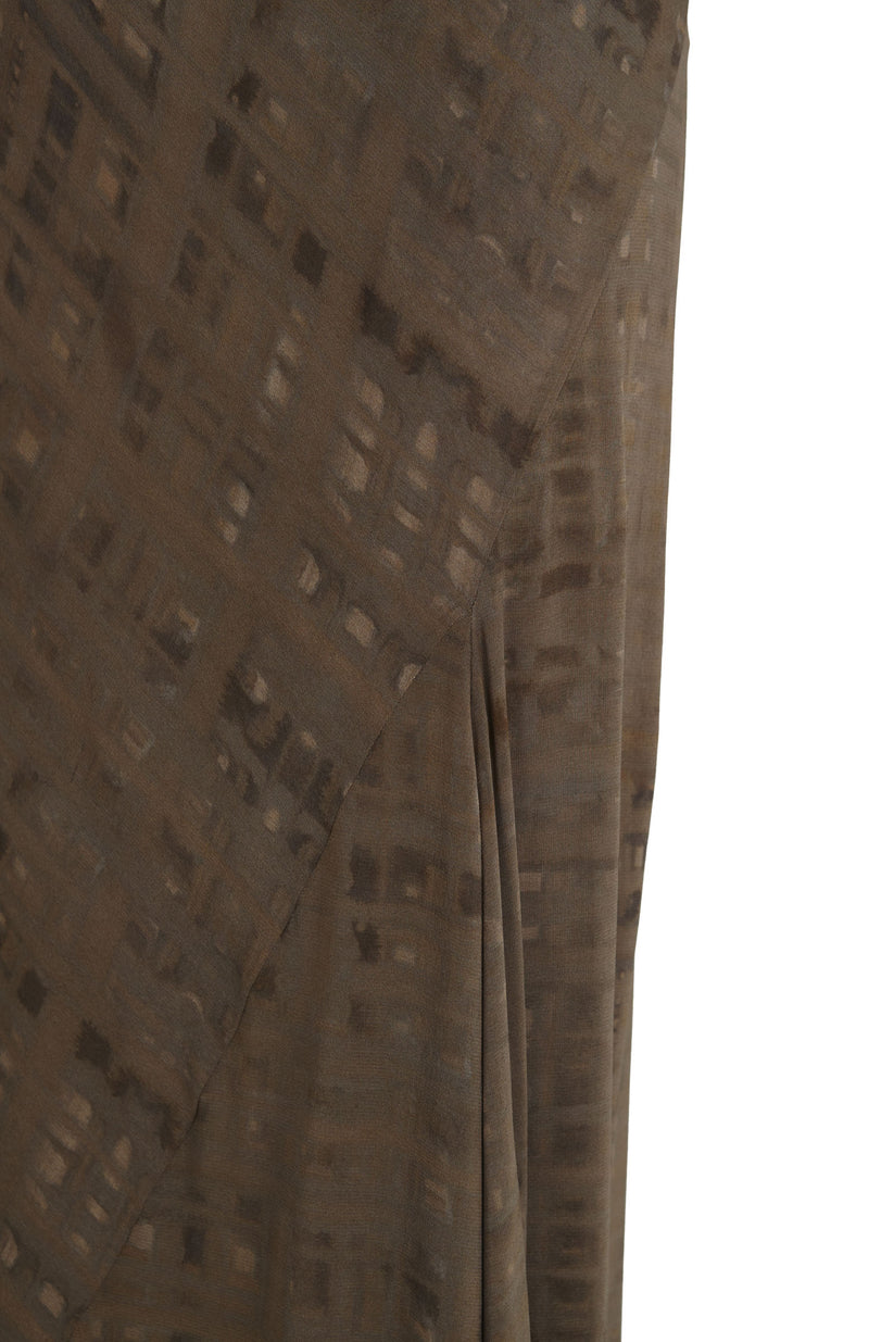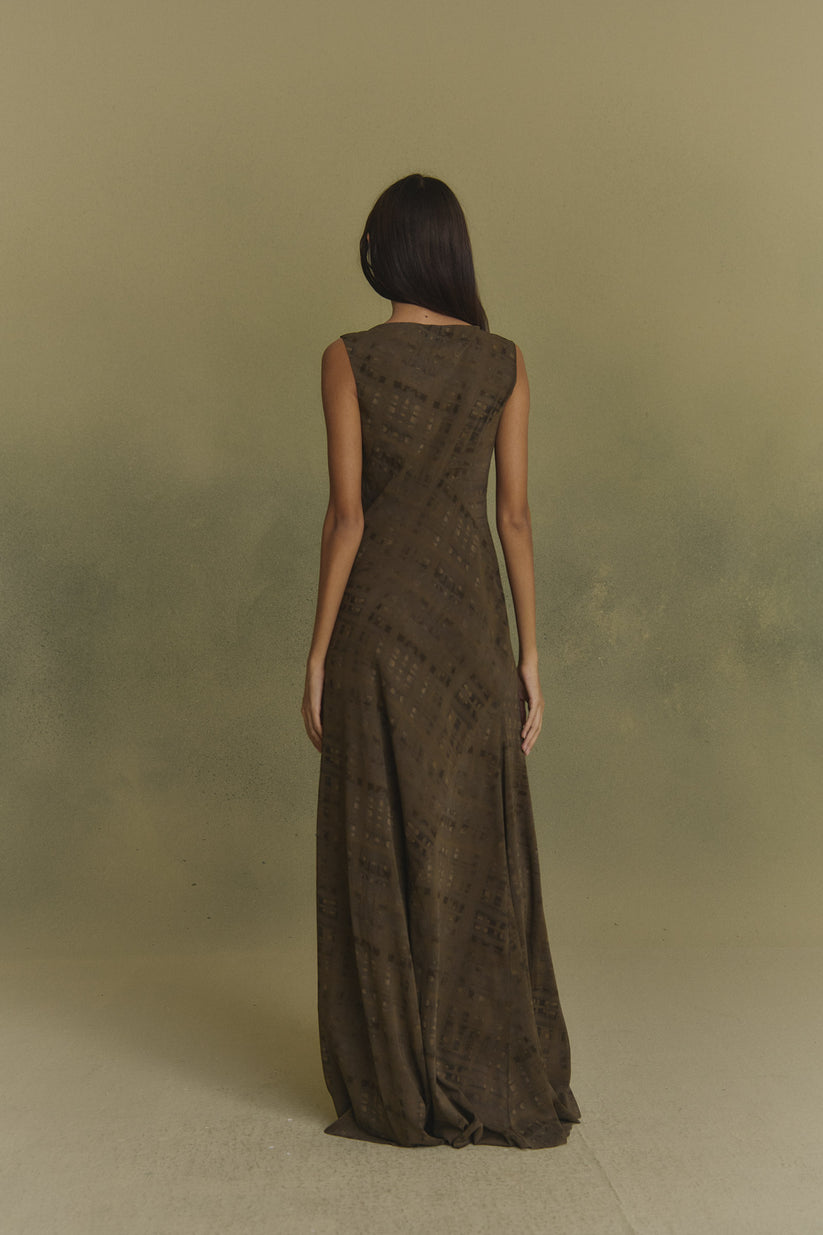 Long sleeveless bias-cut dress with asymmetric cuts. Double-layered dress in printed stretch silk georgette. The print is based on a watercolor by Cortana's creative director