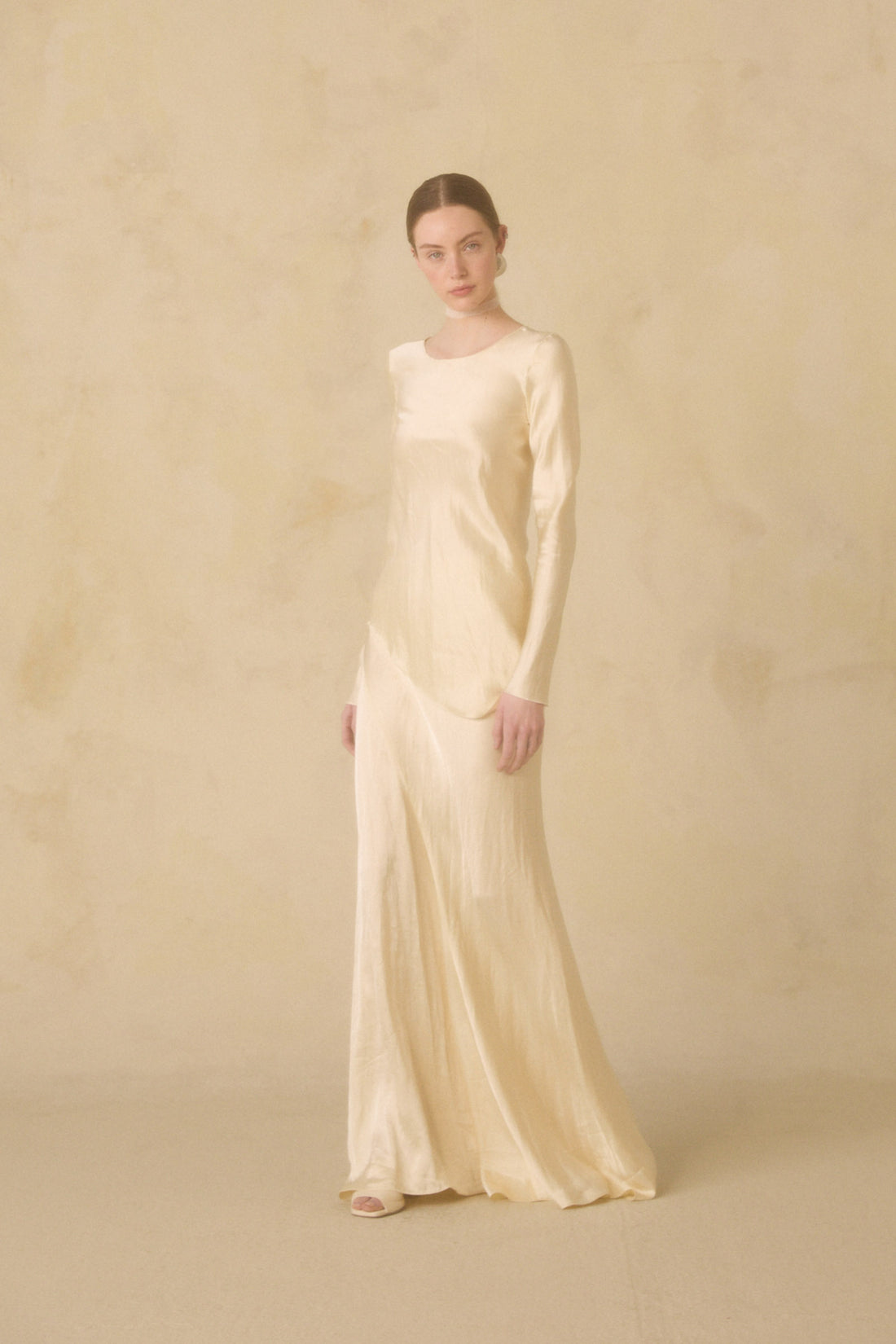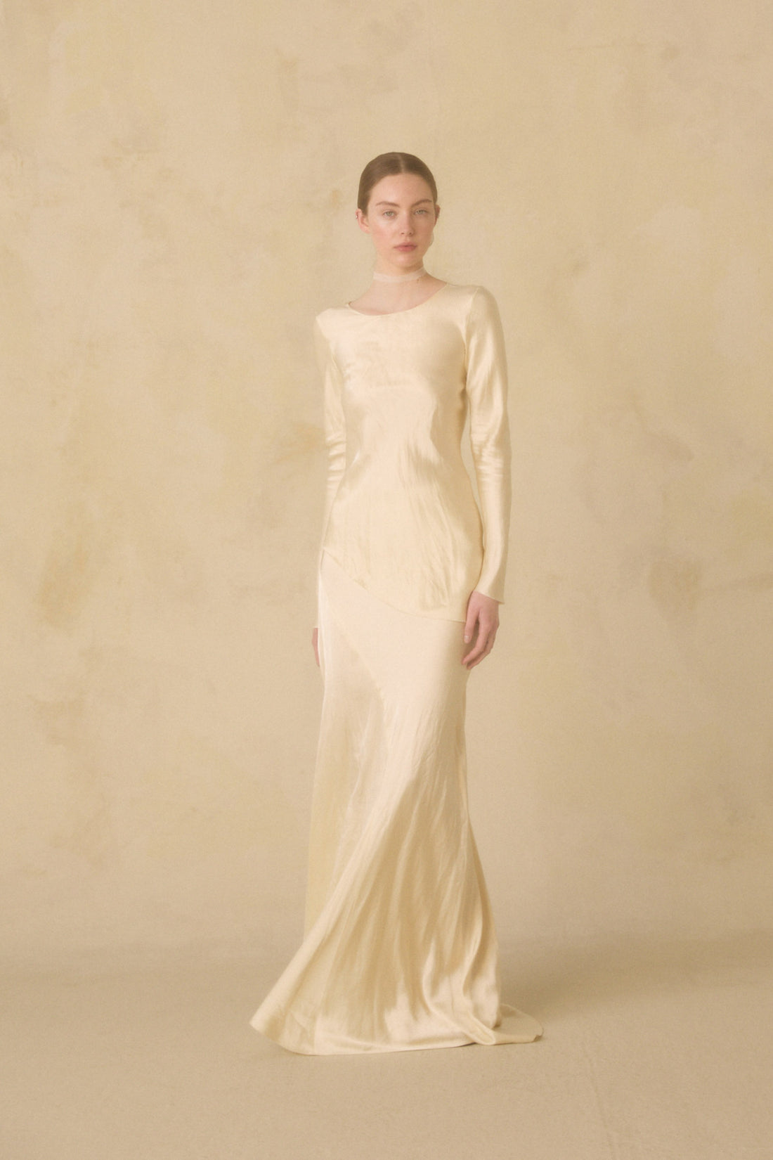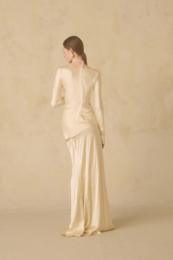 Nacar ensemble crafted from a viscose satin. The bias cut top has an asymmetrical hem, a boat neckline, and long sleeves. The long bias cut skirt has an asymmetric cut and thin stretch waistband.