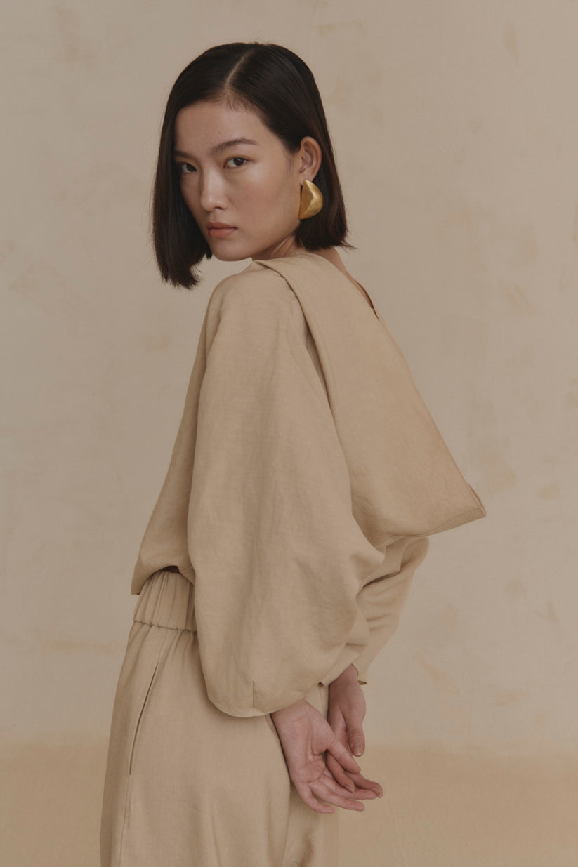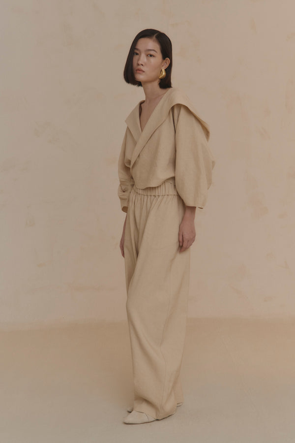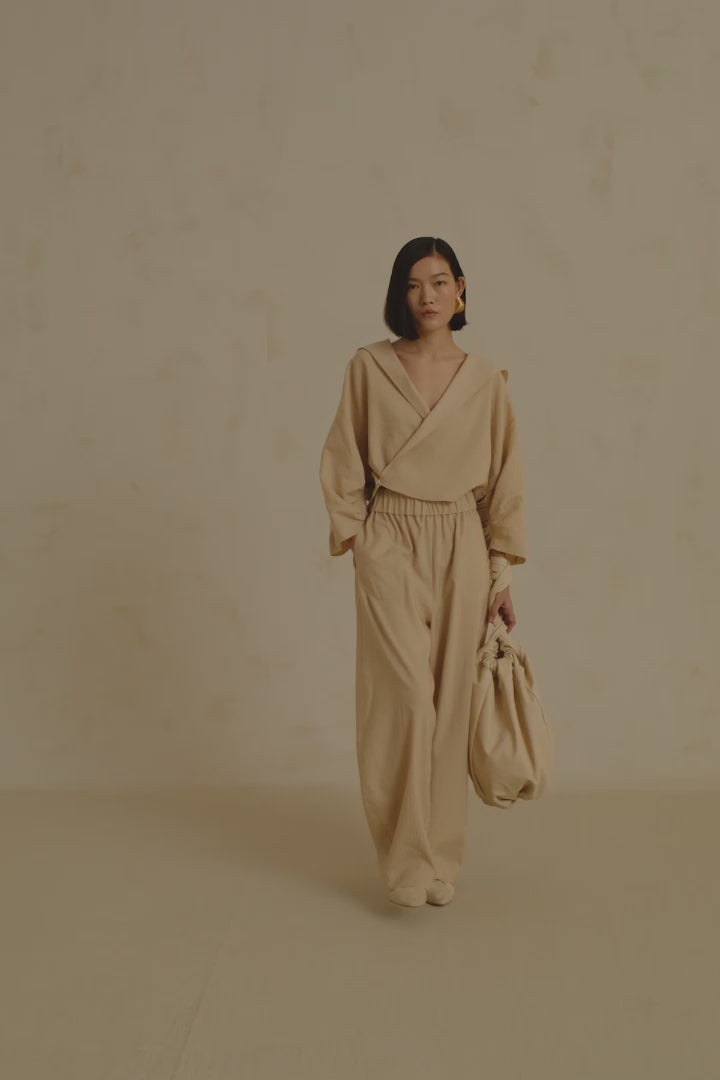Short hooded jacket with a V-neckline that crosses over the chest and closes with two corozo buttons. Made from a fabric combining linen and virgin wool.