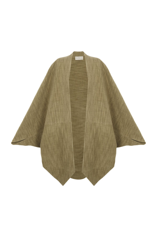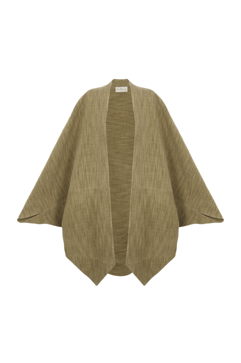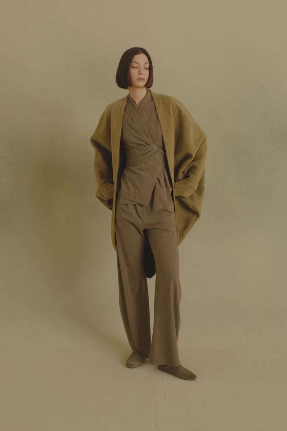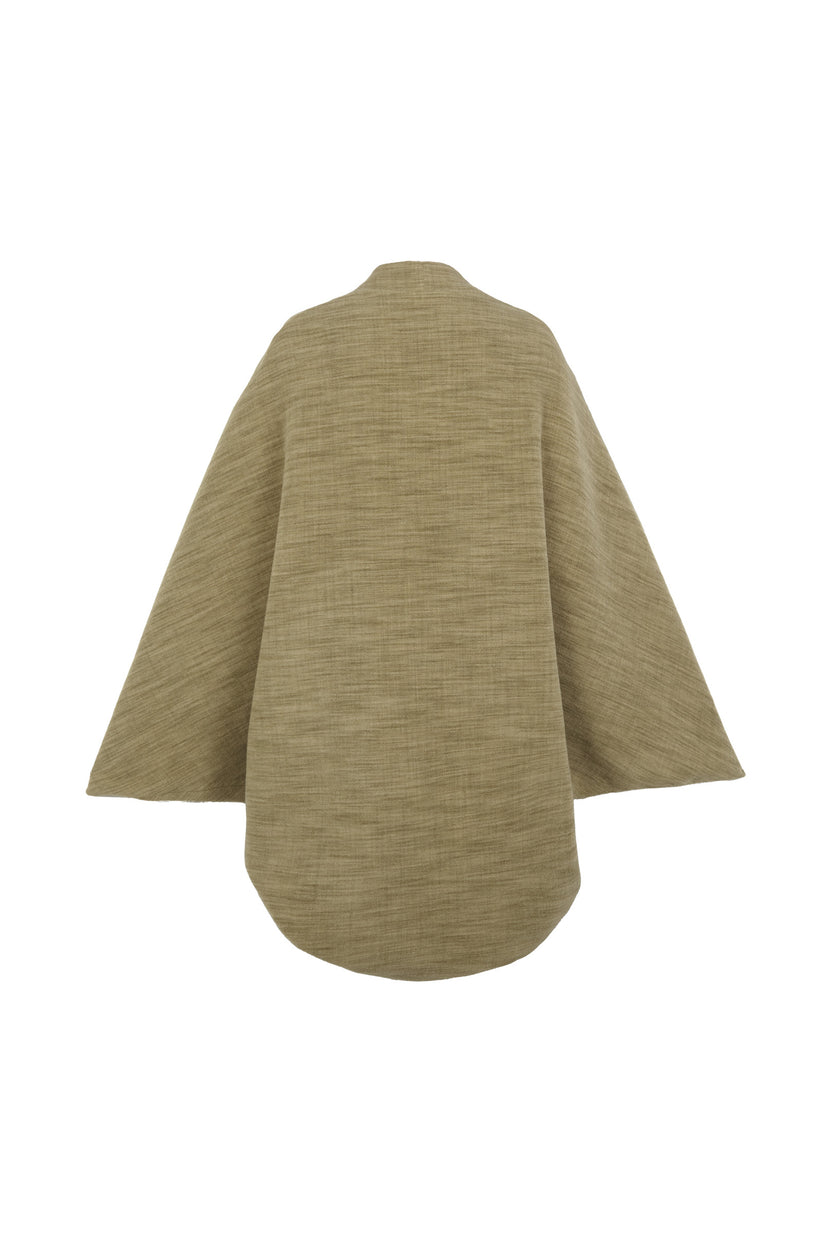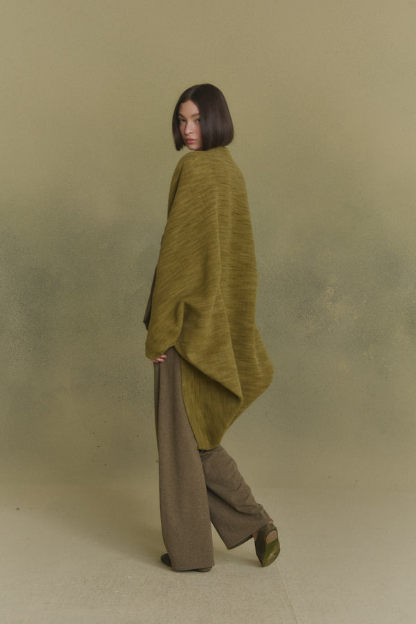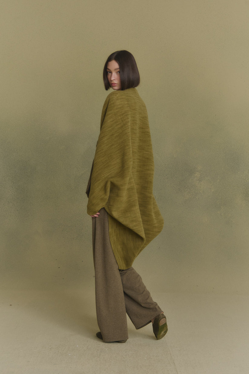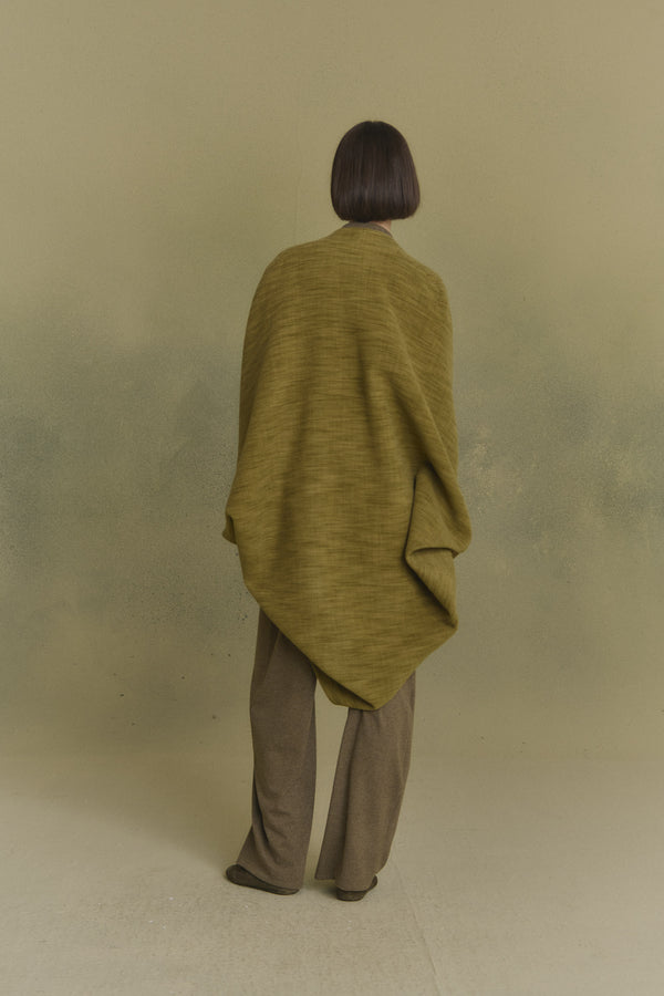 Oversized kimono-style coat cut from a single piece of fabric for a clean silhouette. The Path coat is made from a melange yarn that blends wool, cashmere, and silk, enveloping the body in a warm, softly structured drape.