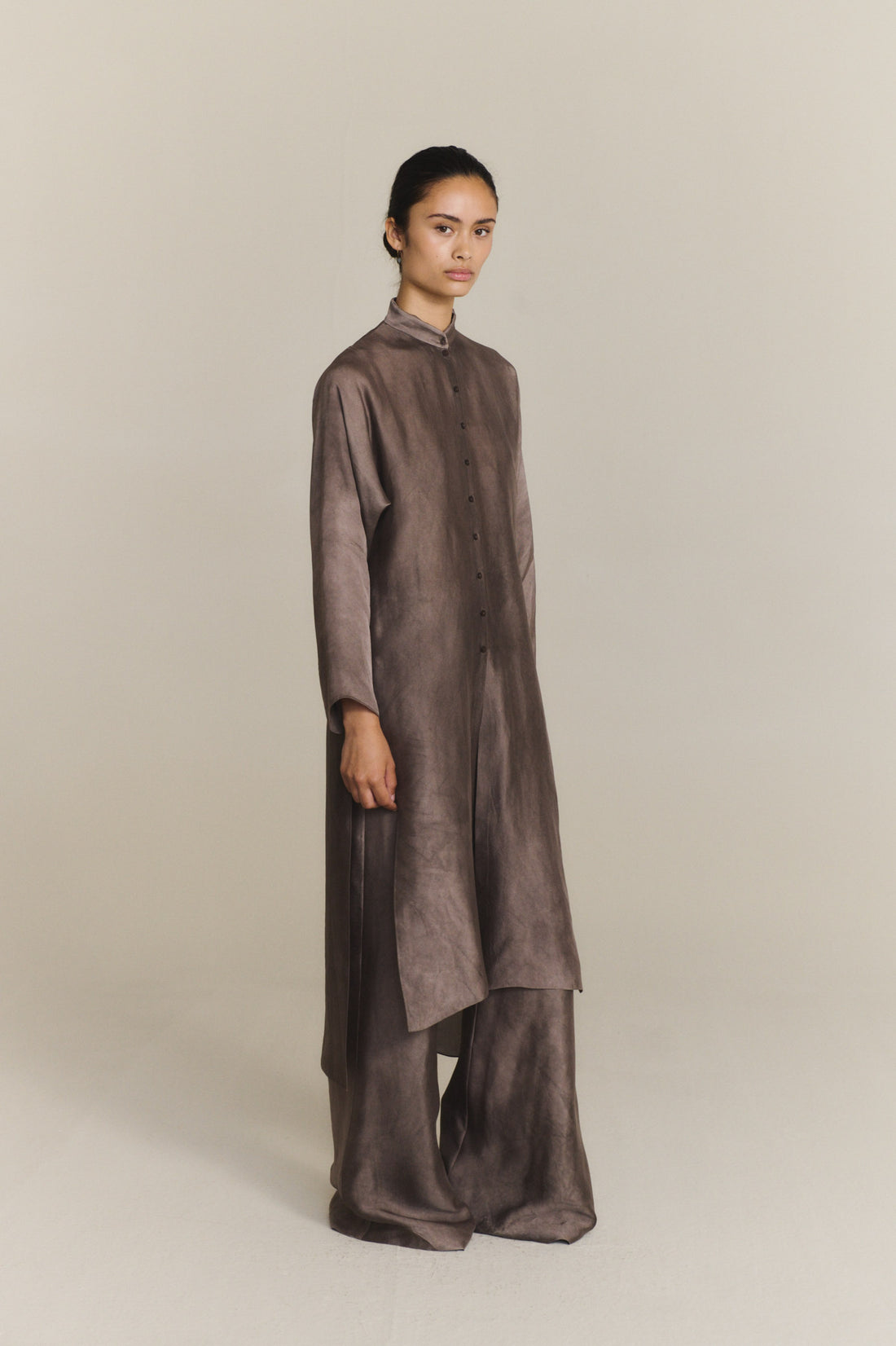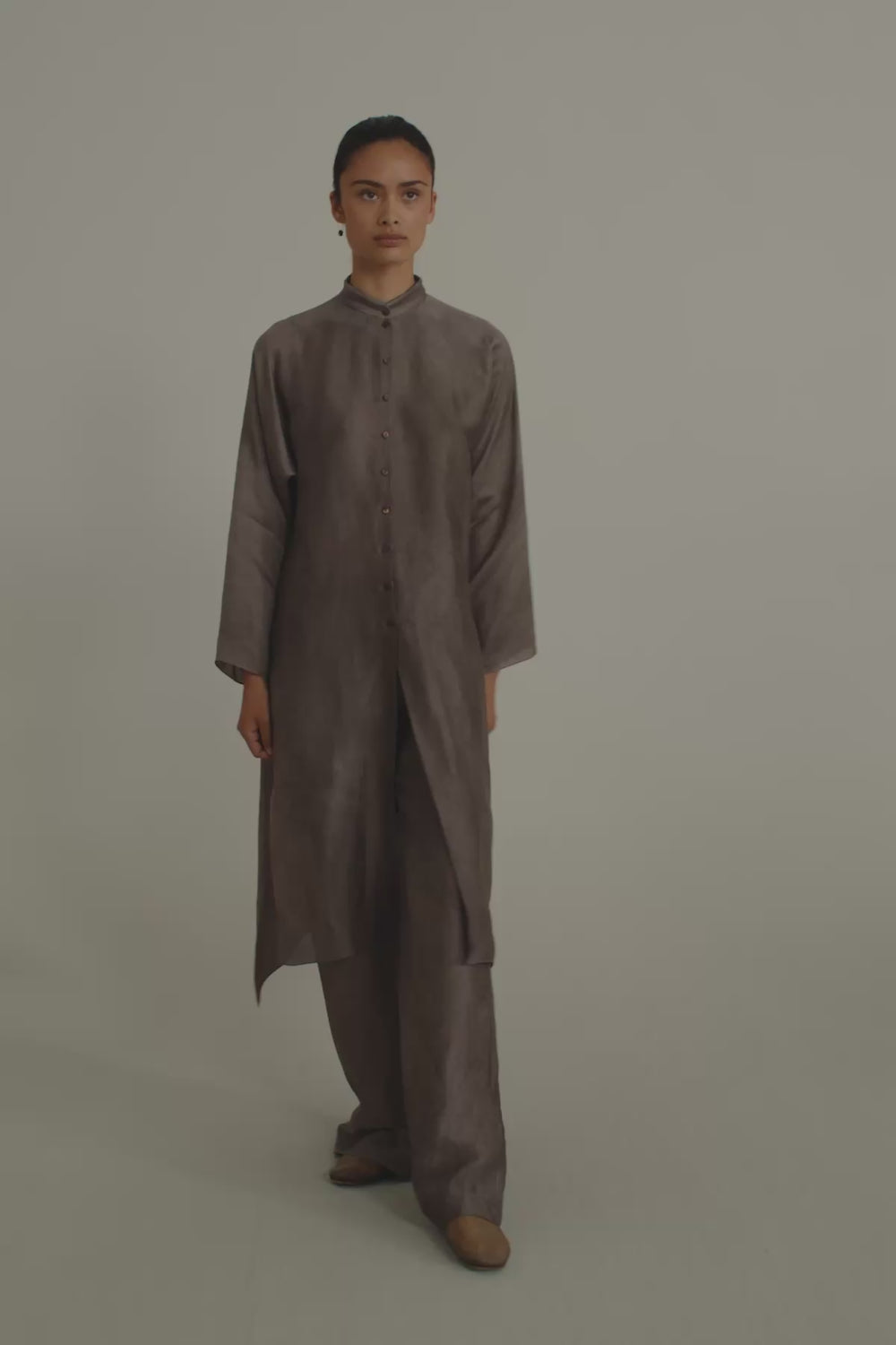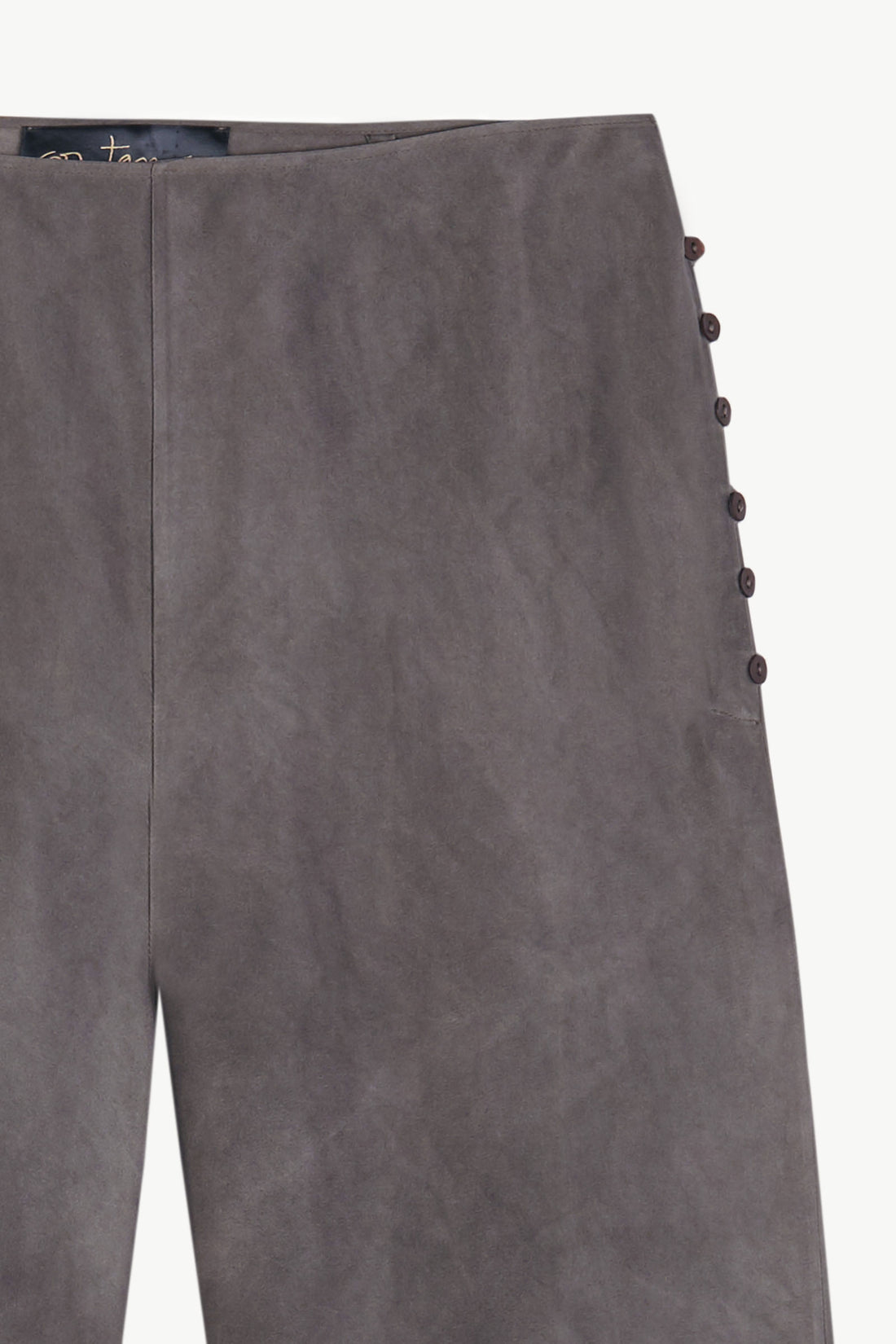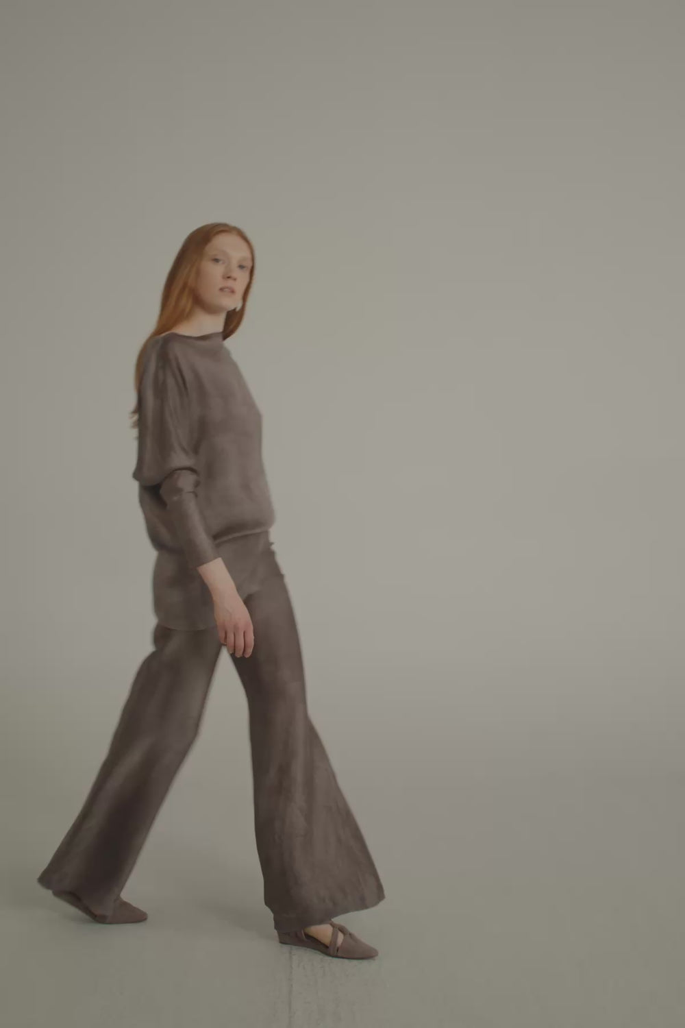 Palazzo trousers crafted from an organza-effect fabric blending viscose and linen, finished with a sophisticated maltinto effect. Detailed with a side closure featuring delicate mother-of-pearl buttons, the Poline trousers combine elegance with lightness.