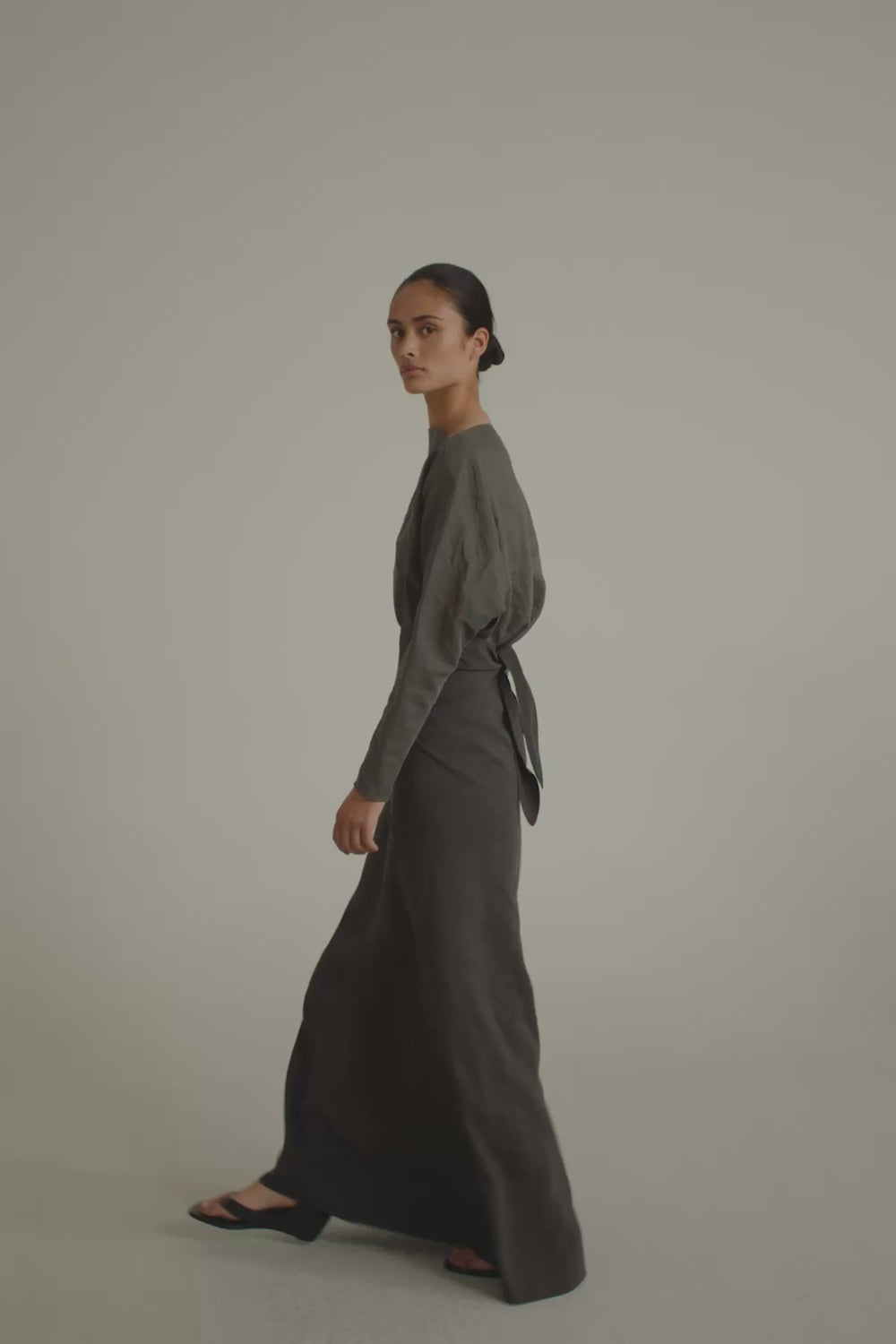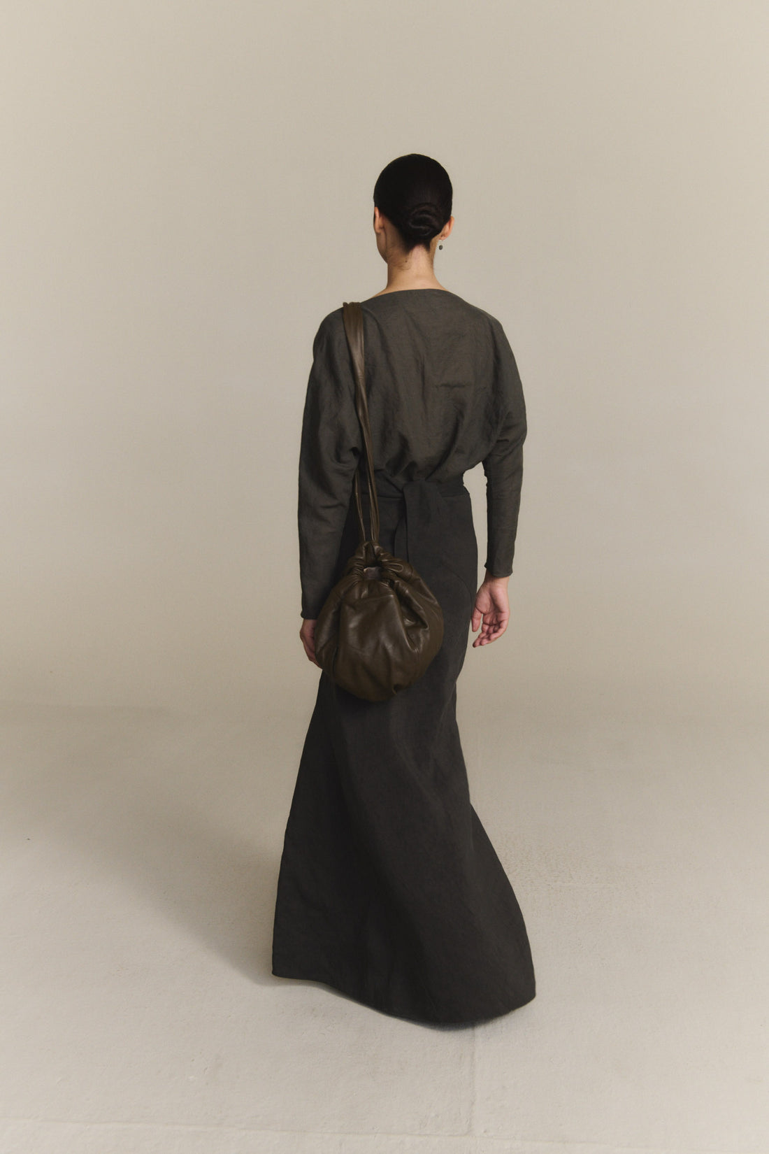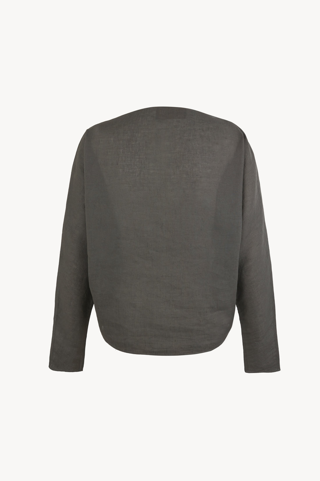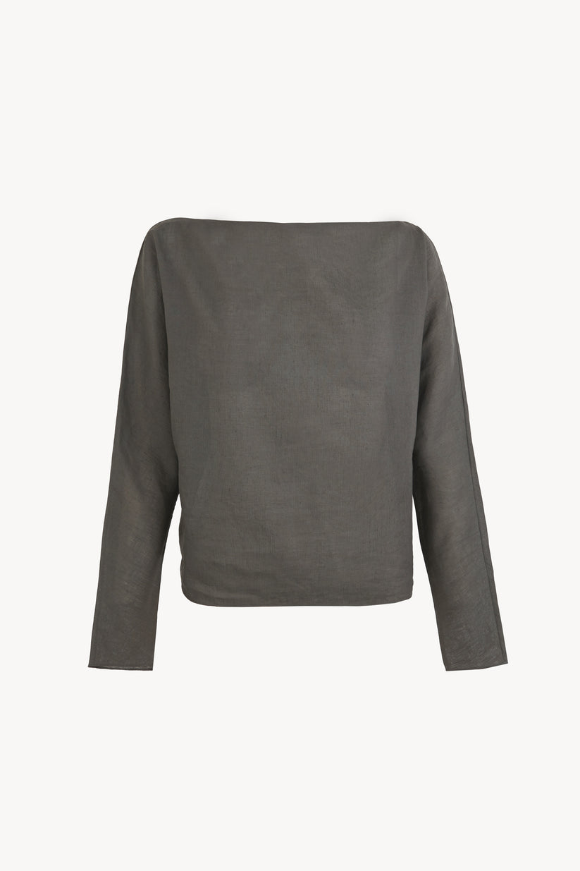 Top crafted from a cotton–linen blend, designed with a slightly oversized silhouette. Featuring a bateau neckline and long dolman sleeves, this piece combines comfort with understated elegance.