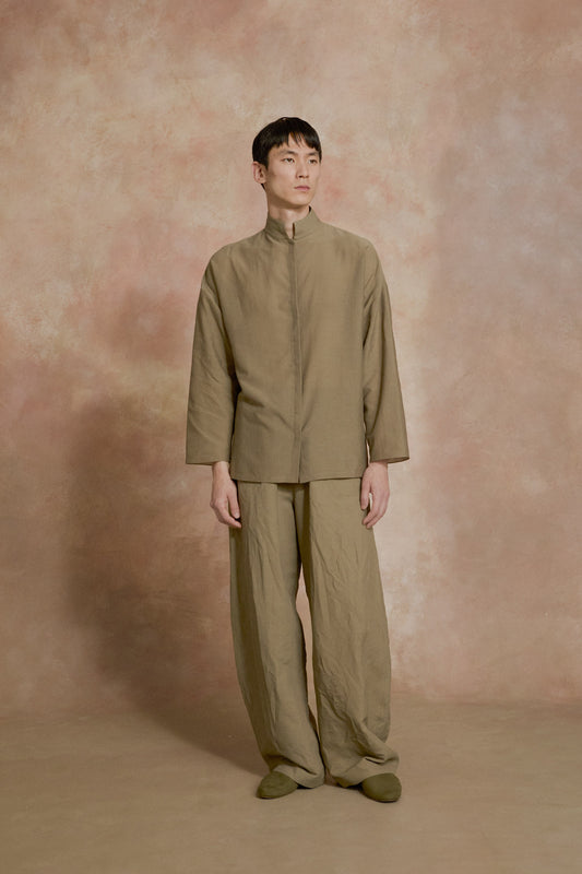 Oversized unisex shirt with a masculine cut made of ramie with a mandarin collar, yoke and corozo buttons.
