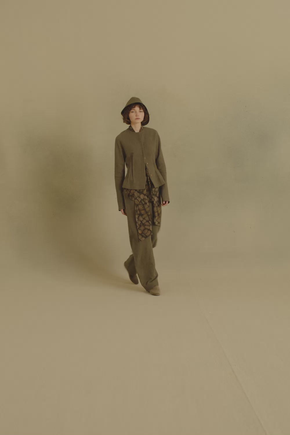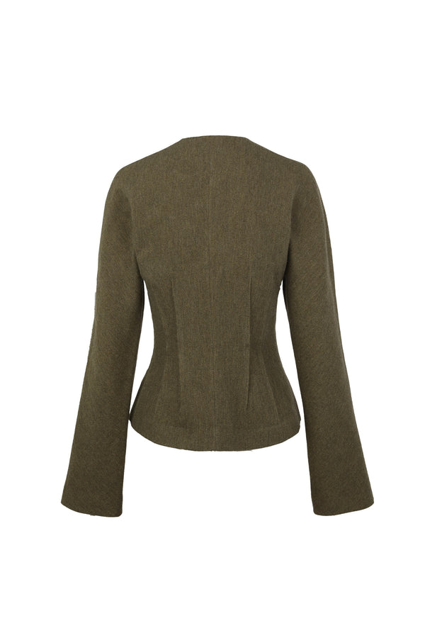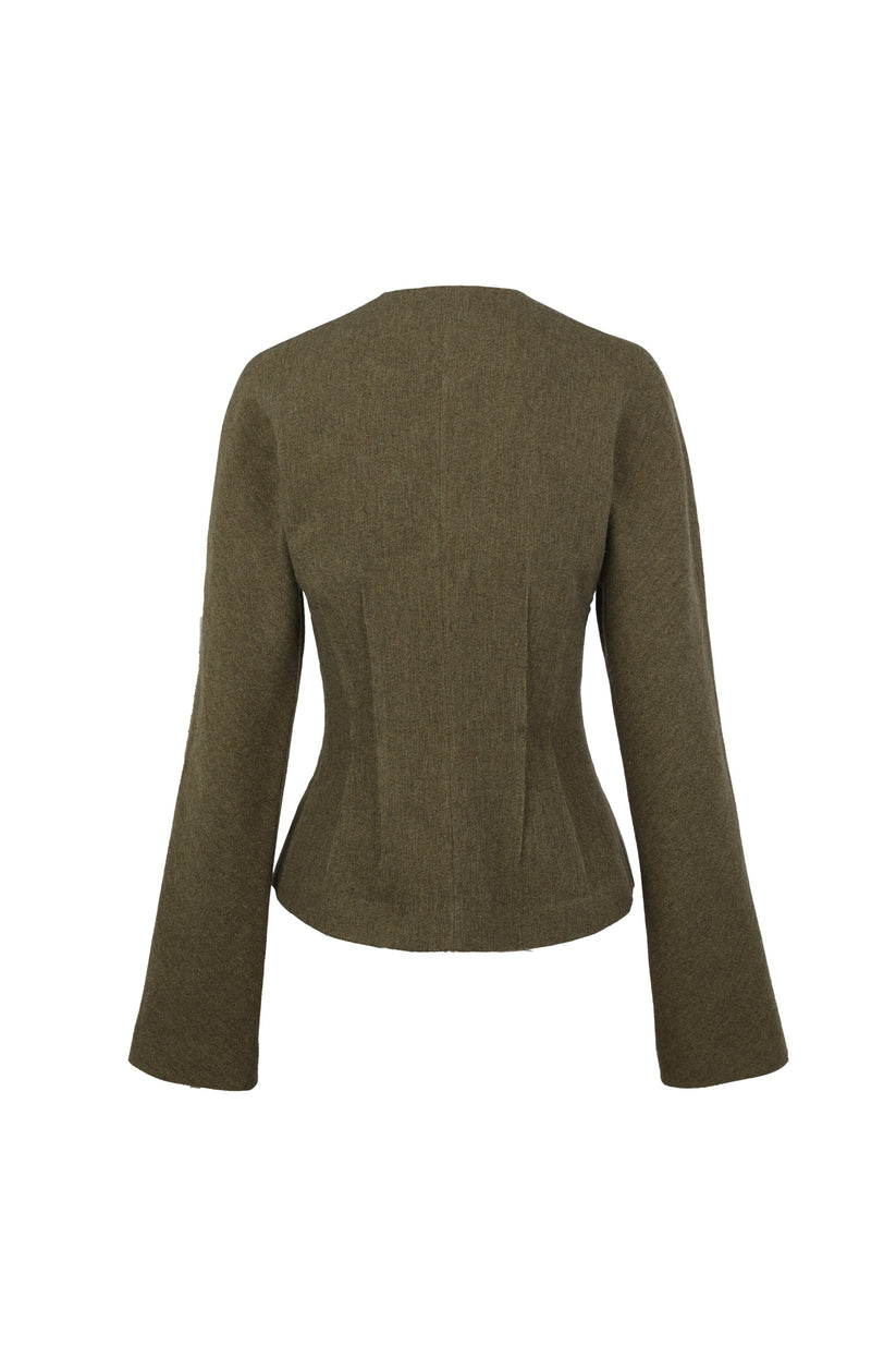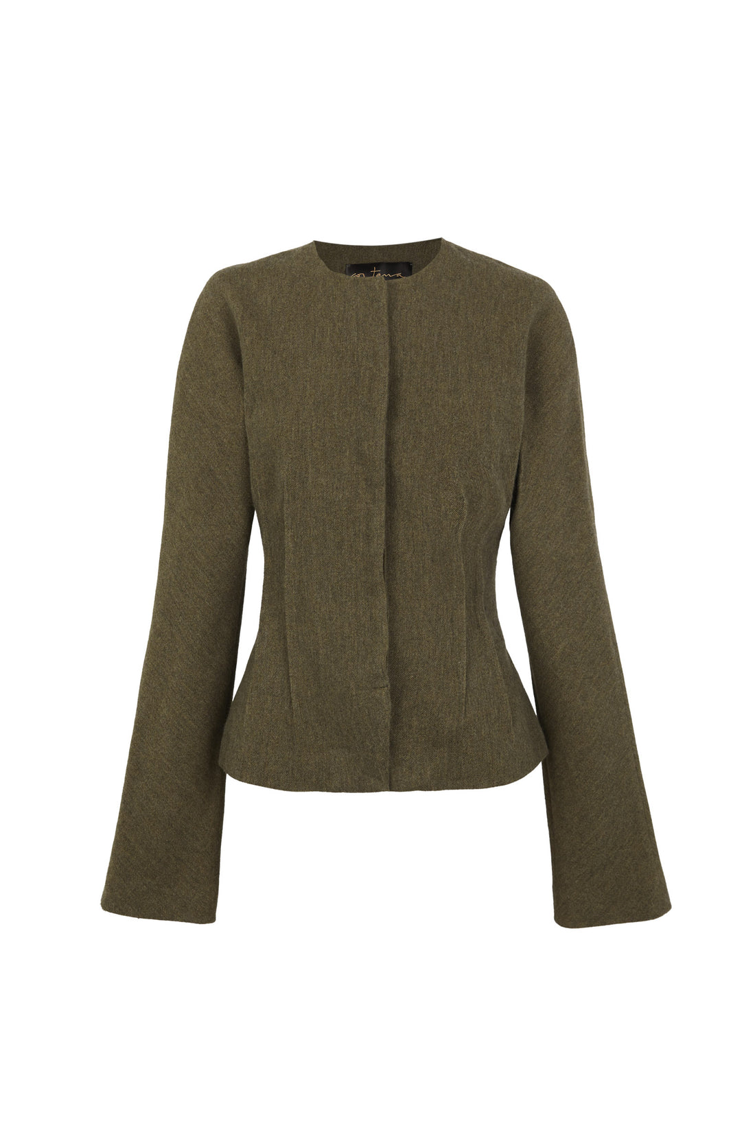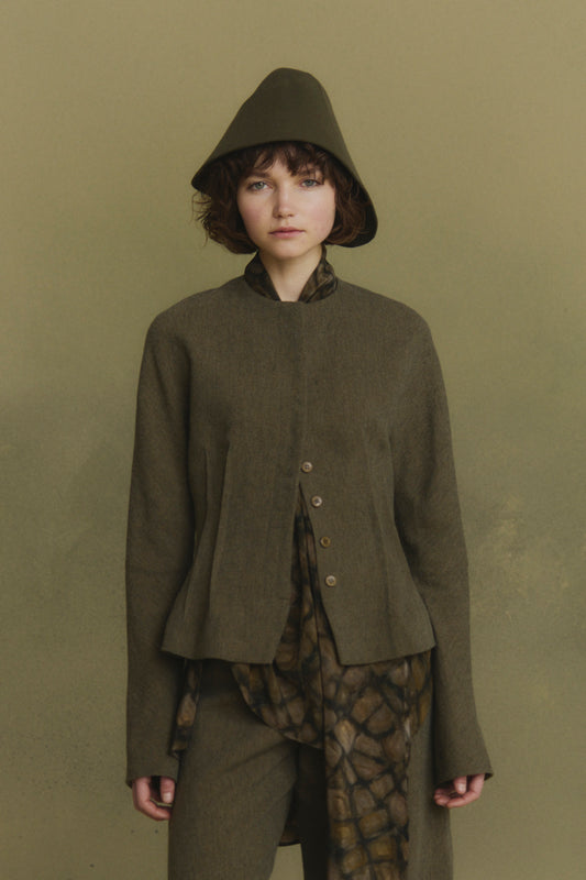 Fitted jacket crafted from an Italian fabric that blends linen, wool, and cashmere. This short piece features a round neckline, dolman sleeves, and double darts that shape the waist with precision. The front closes with corozo buttons concealed beneath a self-fabric placket. It can be paired with the matching Rider trousers to complete the look.
