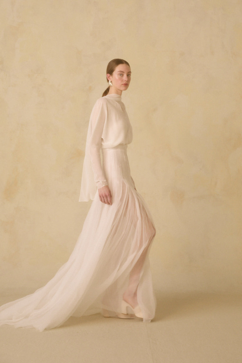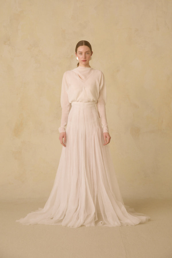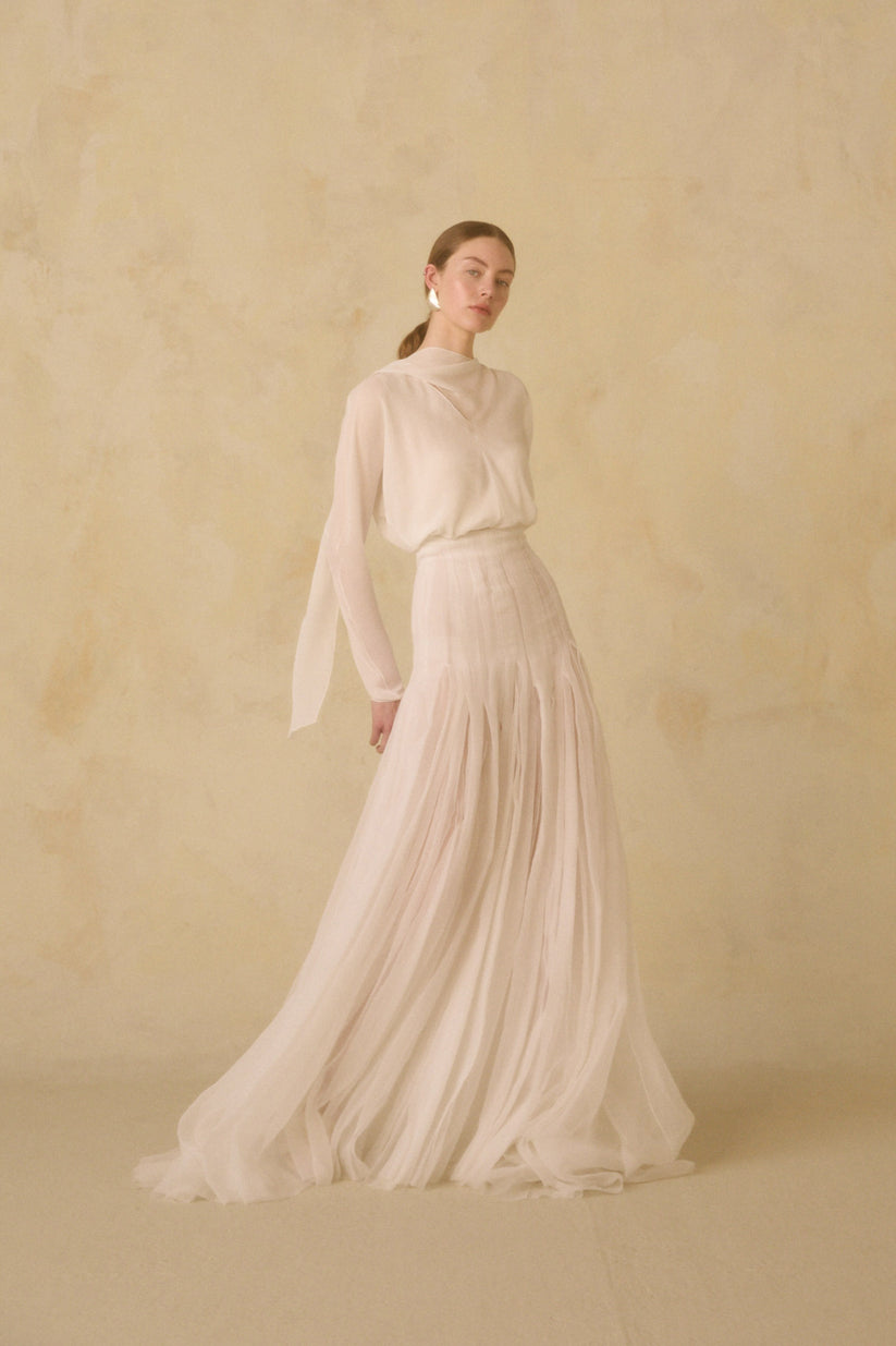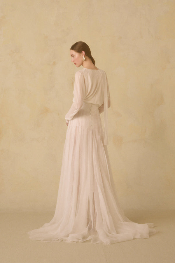 Rubi top, made of silk georgette with long cap sleeves and an asymmetric neckline with a crisscross bow. The Hana long skirt is made of two layers of organic silk chiffon. The waist and hips feature pleats that give it a semi-opaque appearance, opening from the hips to create ample volume. It includes godets and fastens in the back with covered buttons.