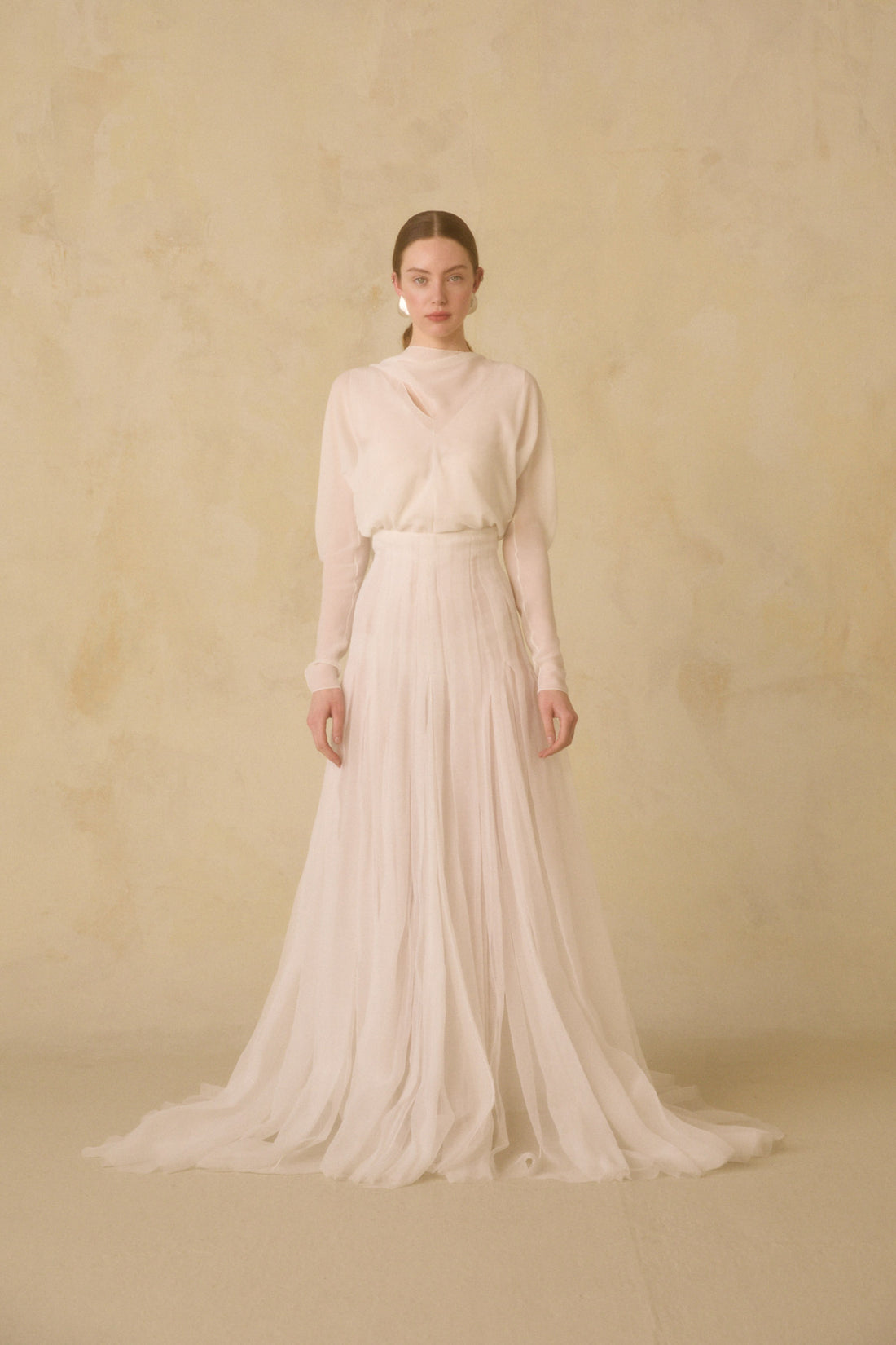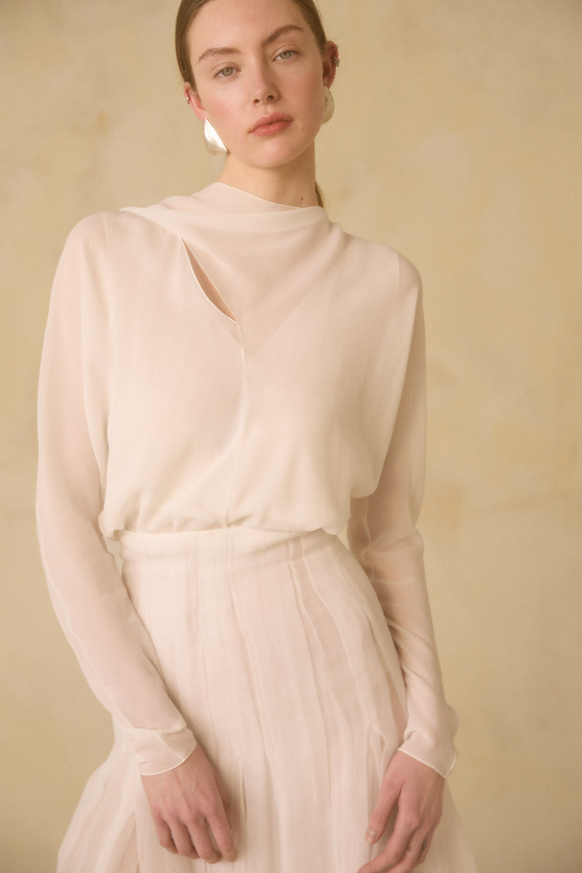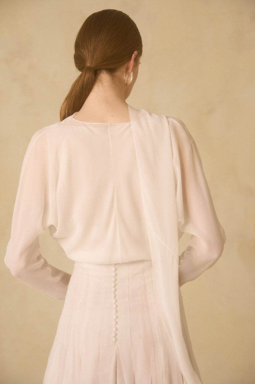 Rubi top, made of silk georgette with long cap sleeves and an asymmetric neckline with a crisscross bow. The Hana long skirt is made of two layers of organic silk chiffon. The waist and hips feature pleats that give it a semi-opaque appearance, opening from the hips to create ample volume. It includes godets and fastens in the back with covered buttons.