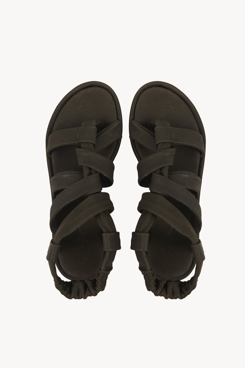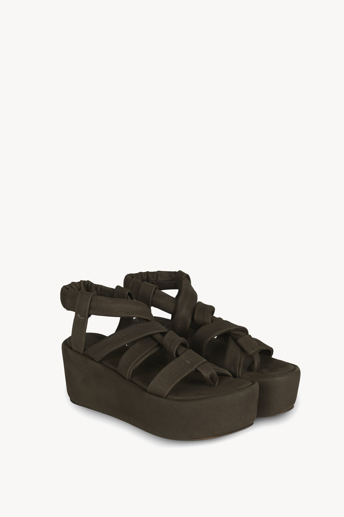 Platform sandal with a padded insole, made of very soft nubuck suede. Featuring a central strap between the toes and several crisscrossing tubular straps. The sole is polished leather, hand-painted in the same color as the leather. Small imperfections confirm the handmade work that gives each pair a unique value.
