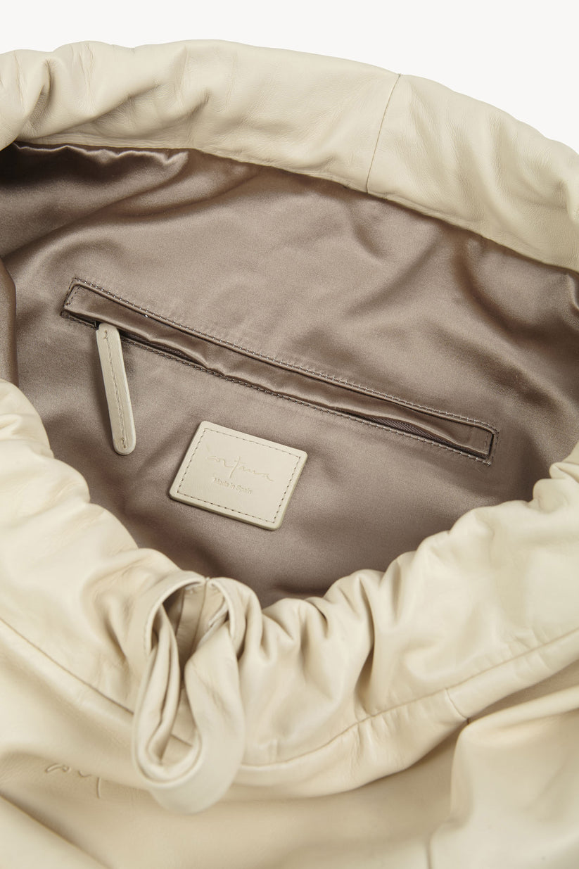 Sack bag, handcrafted in Spain and made from ultra-soft nappa leather, it is fully lined with a fabric that blends cotton and silk. Each piece has been carefully crafted in workshops that preserve Spain’s artisanal leatherworking tradition.