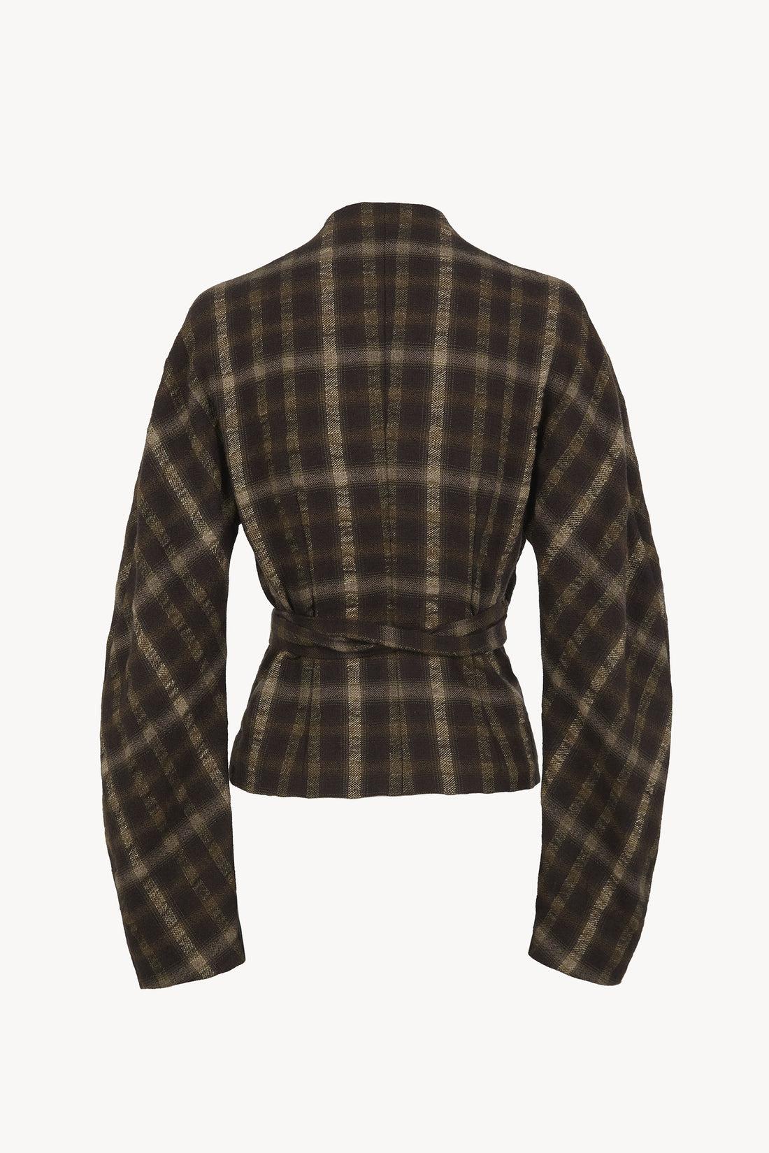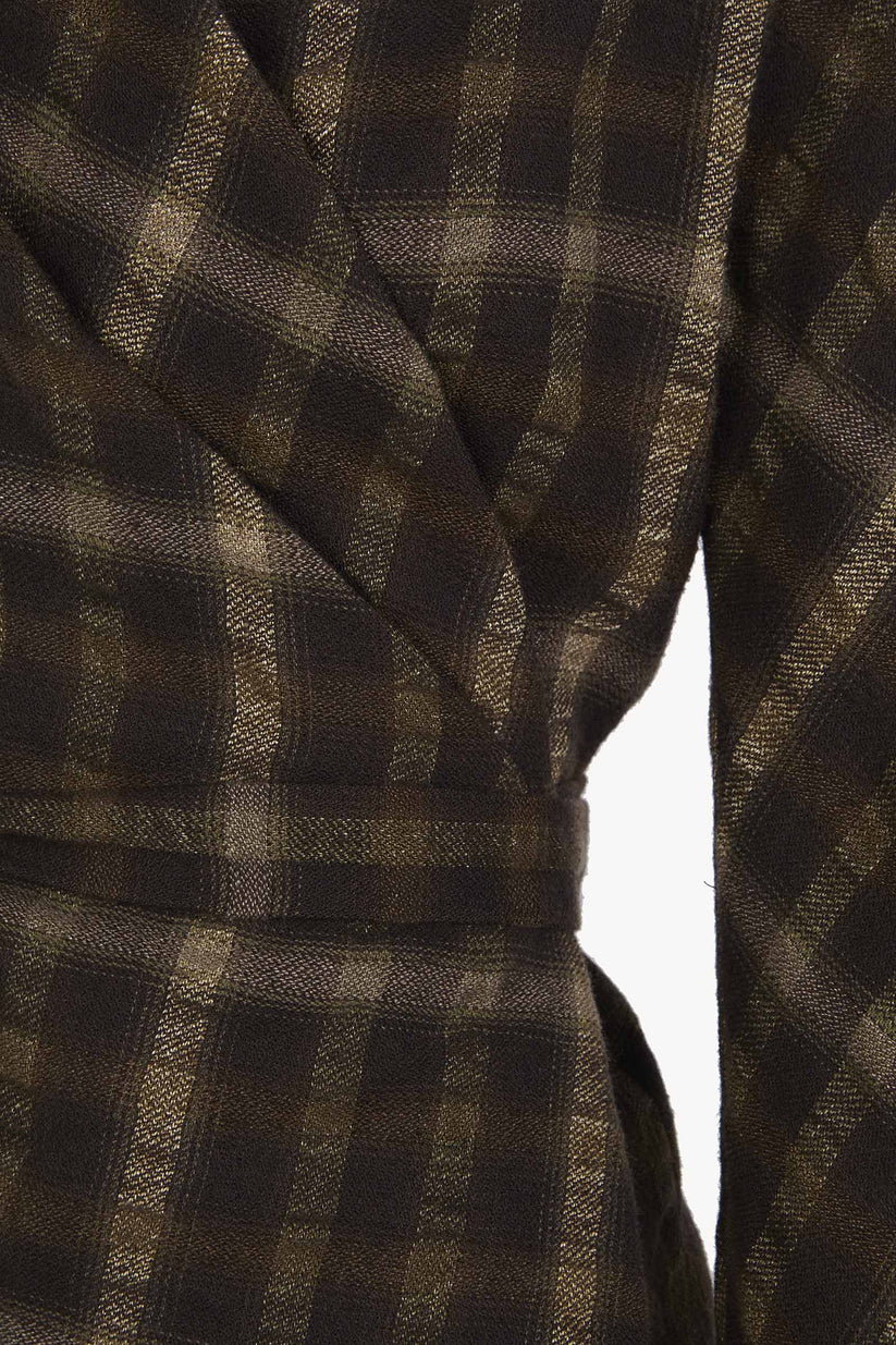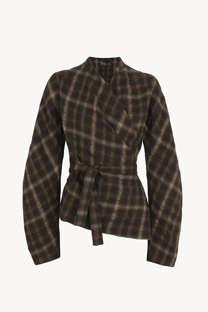 Jacket made in a wool and linen blend fabric with checkered jacquard, featuring slightly curved Japanese sleeves and crossing at the front to tie at the waist with self-fabric ties